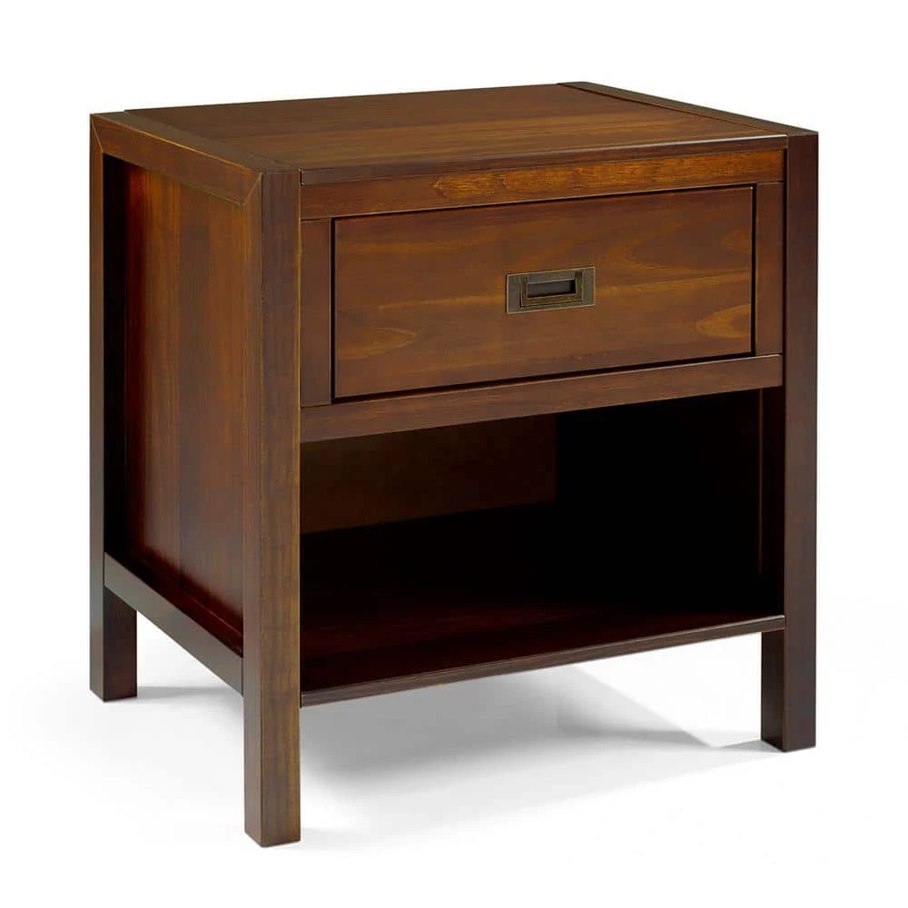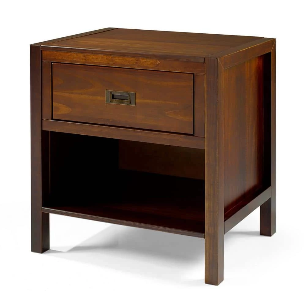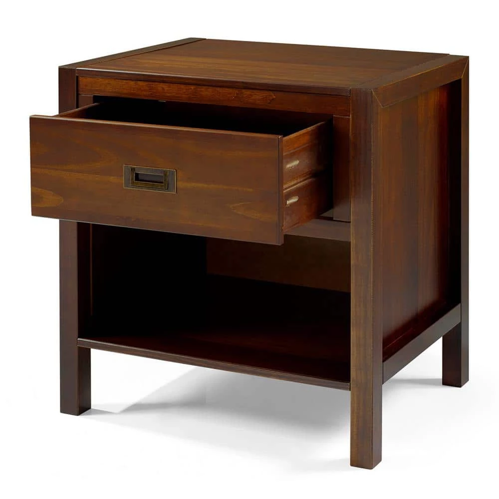 Find open and closed storage all in one sophisticated unit with this solid wood nightstand. This bedside table includes a lower cubby and a top drawer with wood on wood runners, a finished interior, and a pull-out metal handle that lays flat when not in use. Reminiscent of a mid-century filing cabinet this updated end table provides a retro chic flair, making it a fabulous addition to any room whether the decor is Parisian, eclectic, or modern.