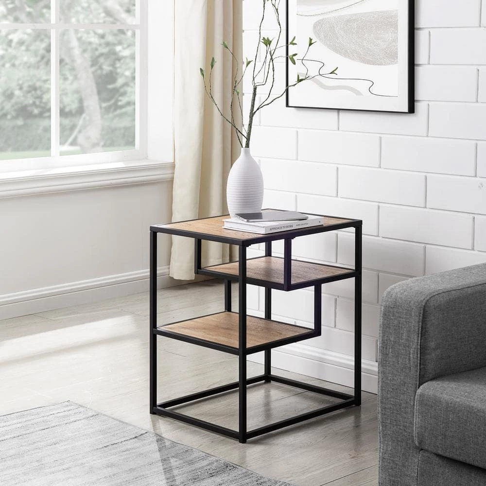Give your sitting room, sanctuary, or home office a quick and easy refresh with this contemporary accent table. Two floating shelves lend additional display space, while a spacious tabletop leaves room to host houseplants, candles, and decor. This side table’s sleek design makes it the perfect couchside storage companion in your small apartment or forever home. With a powder-coated steel build and warp-resistant MDF wood tabletop, this piece is sure to debut your favorite decor or everyday essentials for decades.