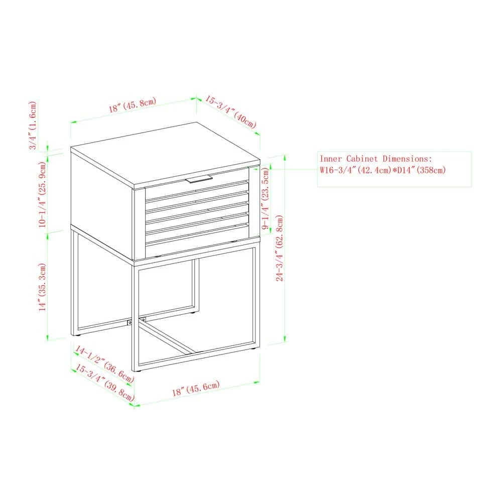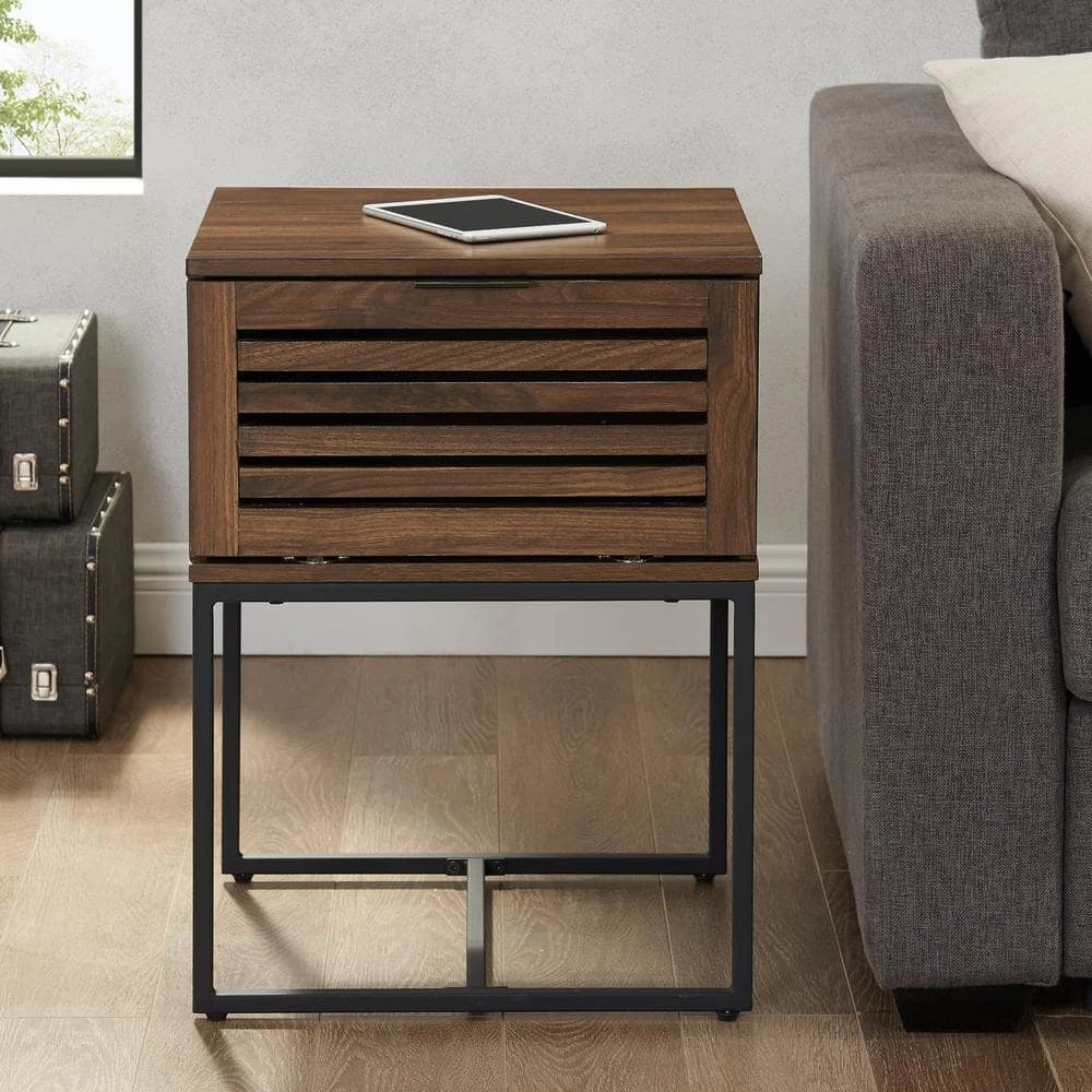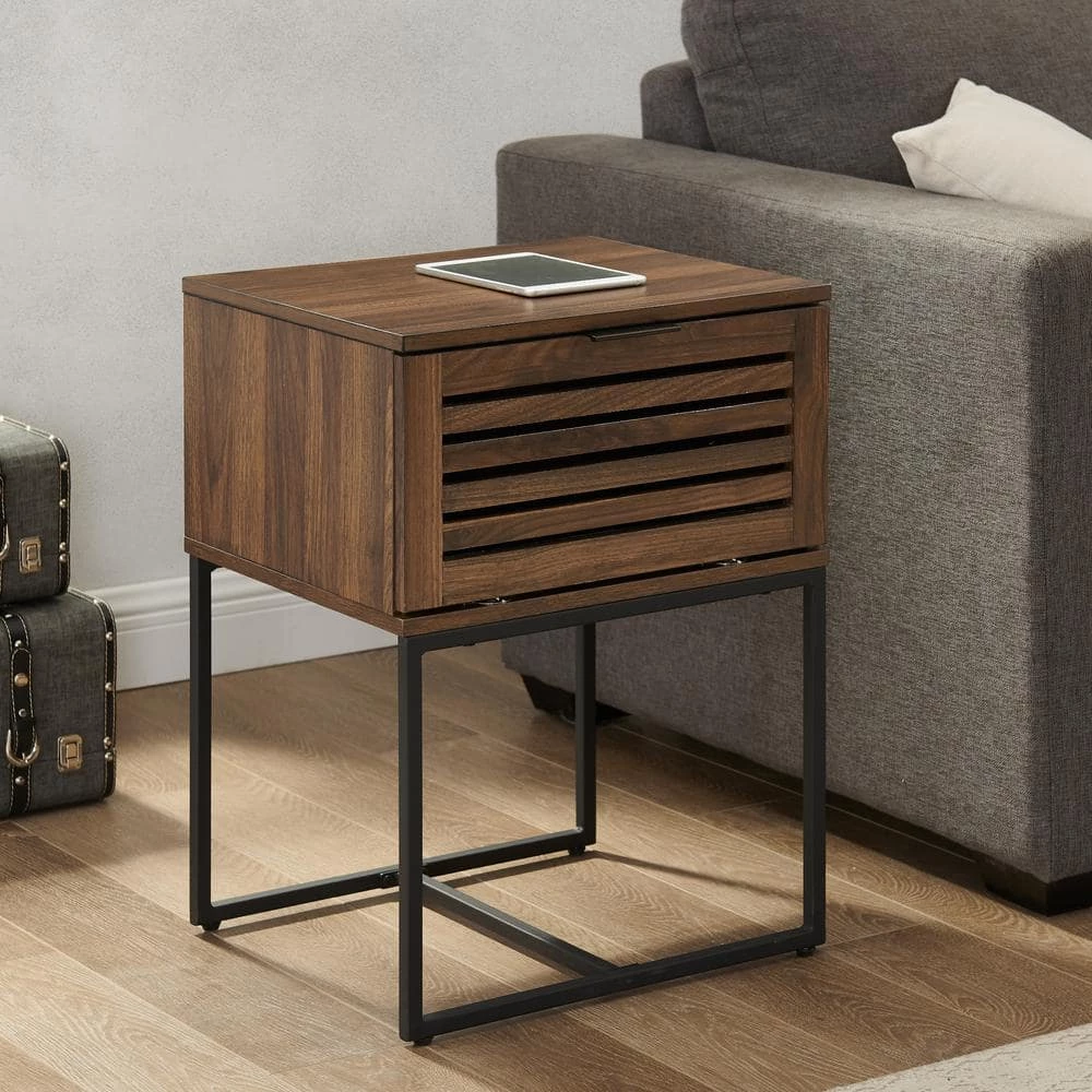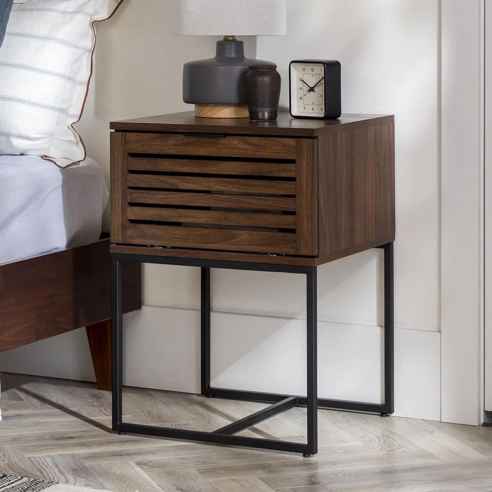 All about closed storage, this contemporary nightstand features a drop-down style door that opens up to a wide space where you can store books, electronics, or other bedside accessories. A unique powder-coated metal base complements the boxy silhouette of the top compartment. Round out this modern slat door collection by pairing this side table with its matching coffee table or TV stand.