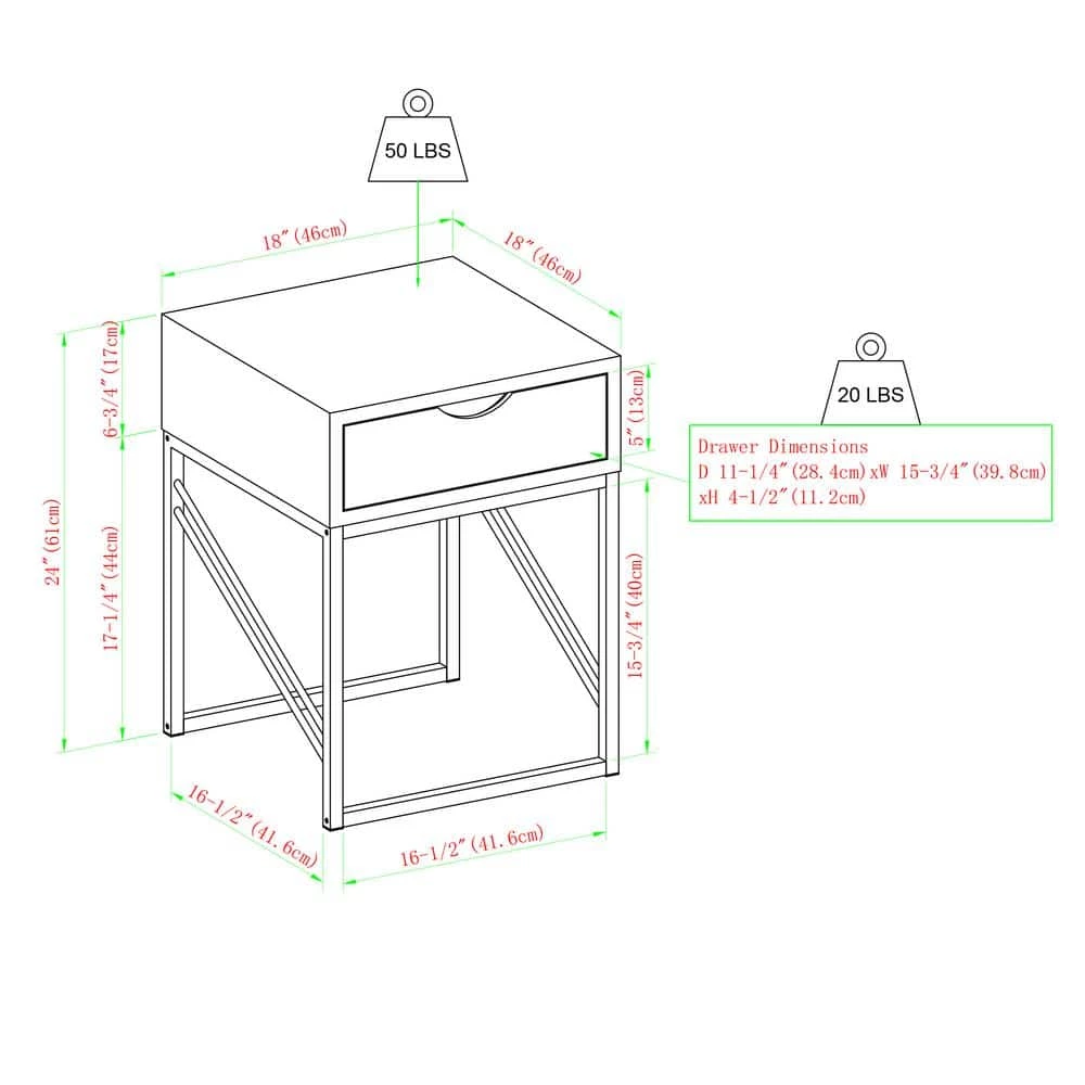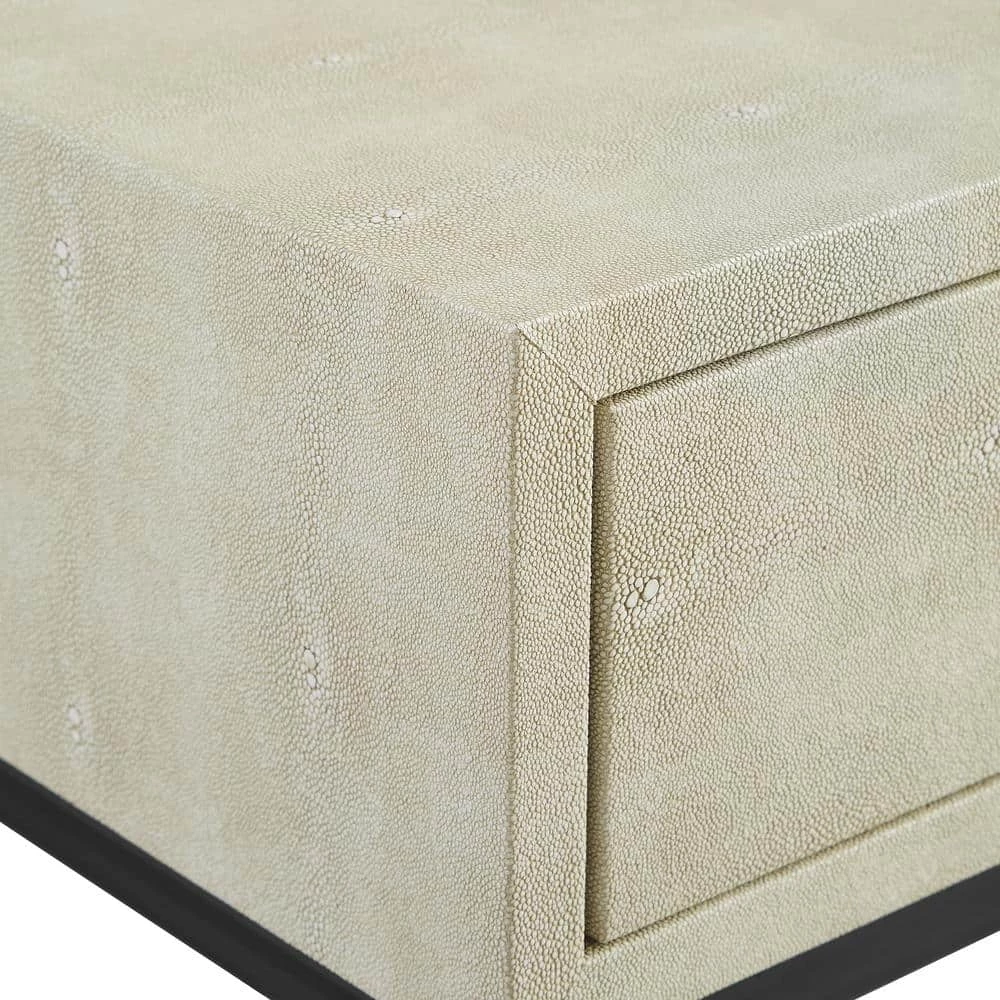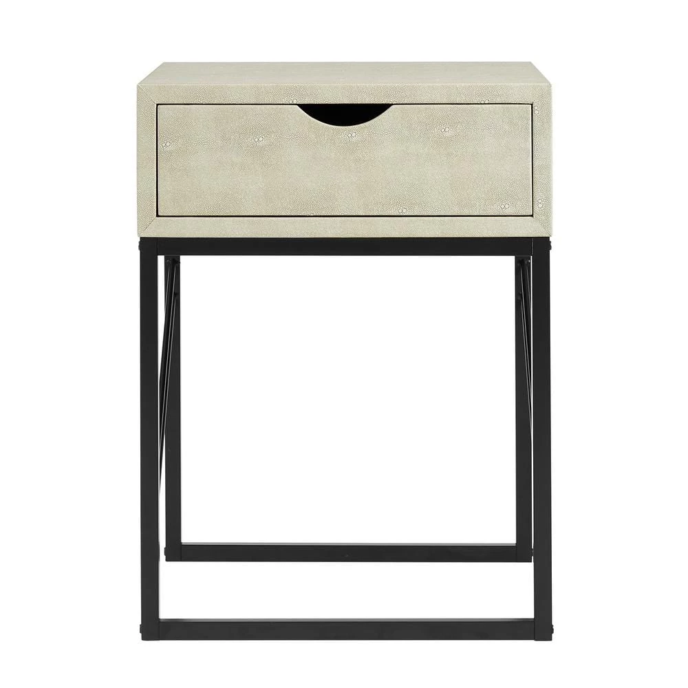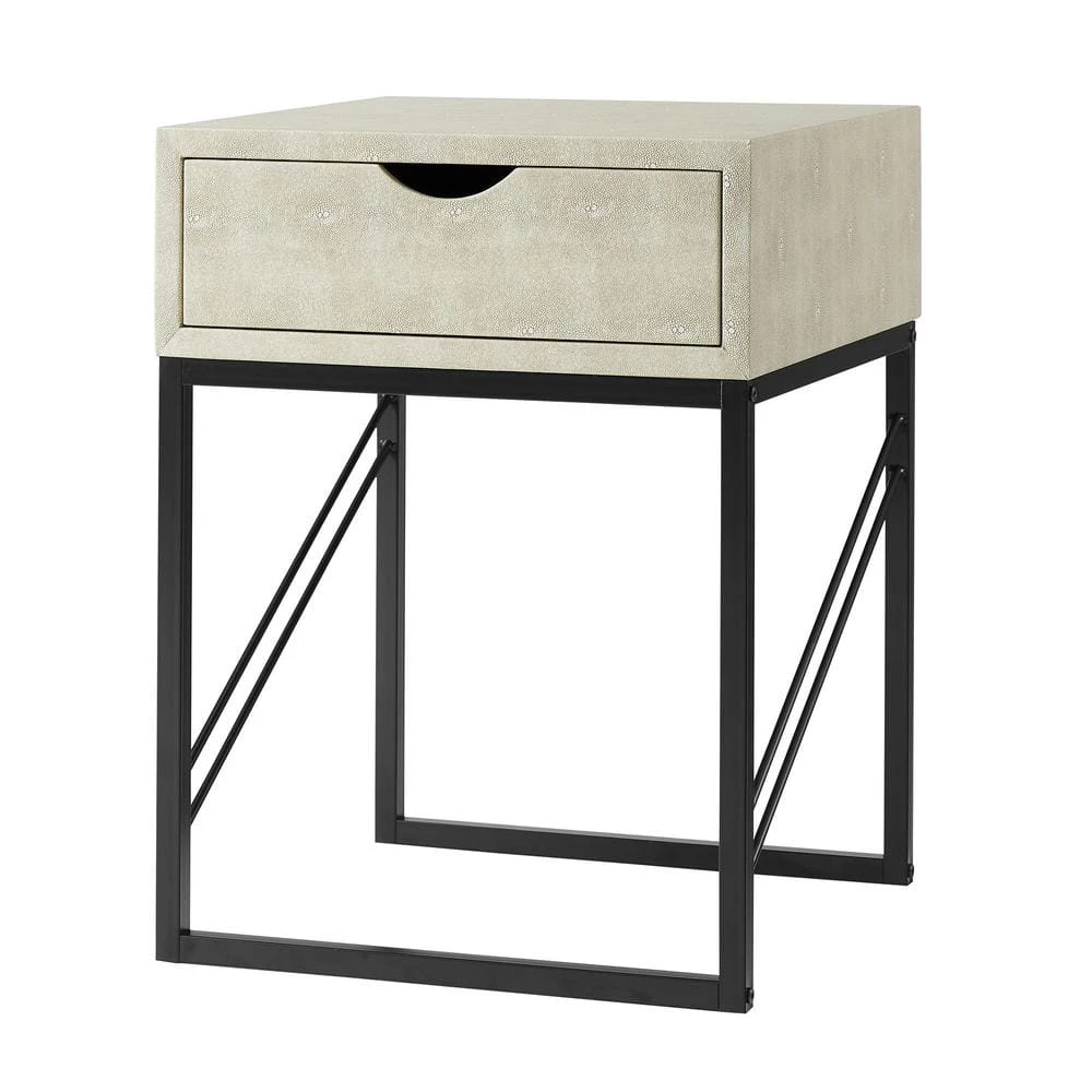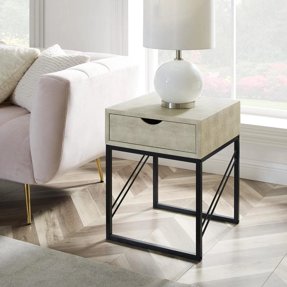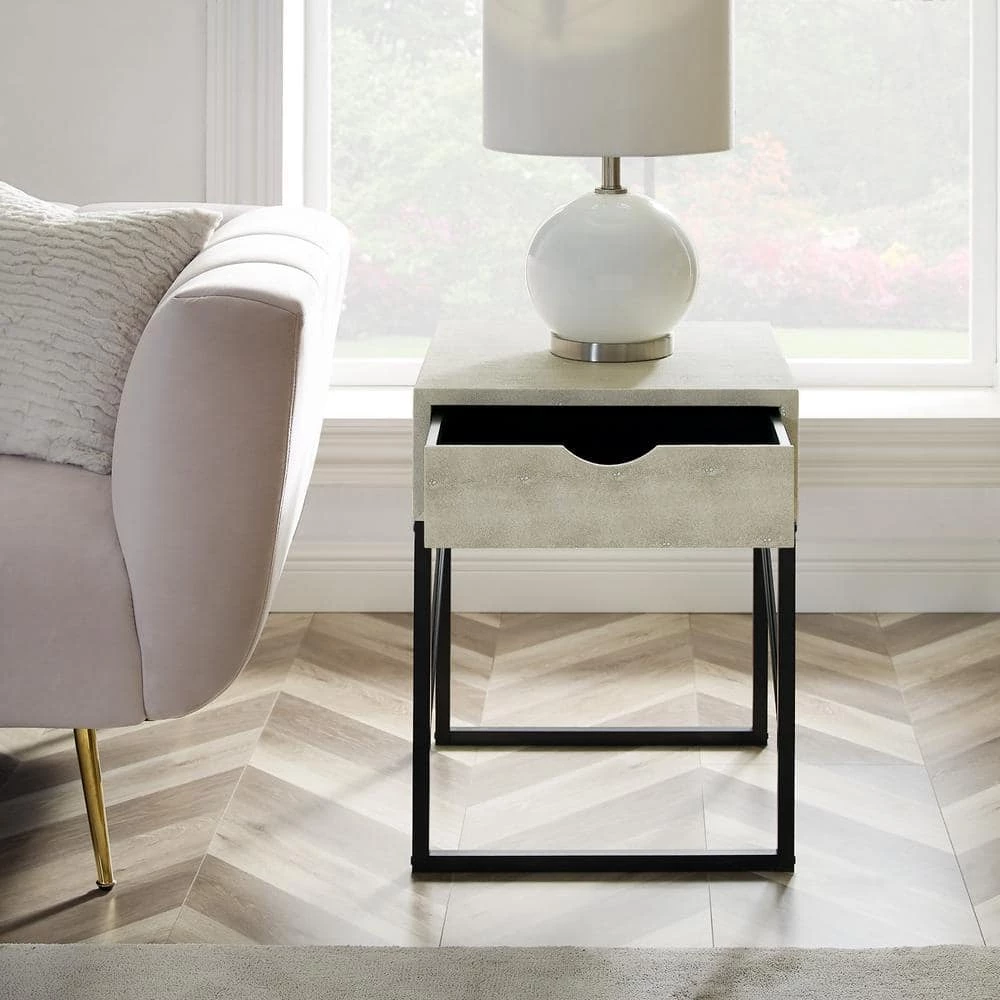 Showcase your eclectic style with this modern glam side table as a centerpiece in your home. The textured faux shagreen finish and diagonal metal side accents wow guests with their contemporary aesthetic. Keep up pretenses of your mature style by tucking electronic accessories, remotes, and other clutter within the single-Drawer with a cutout handle. The fabric-lined interior adds an extra sense of class no matter what you place inside. Pair with the entryway and coffee tables to keep the contemporary theme throughout your whole home.