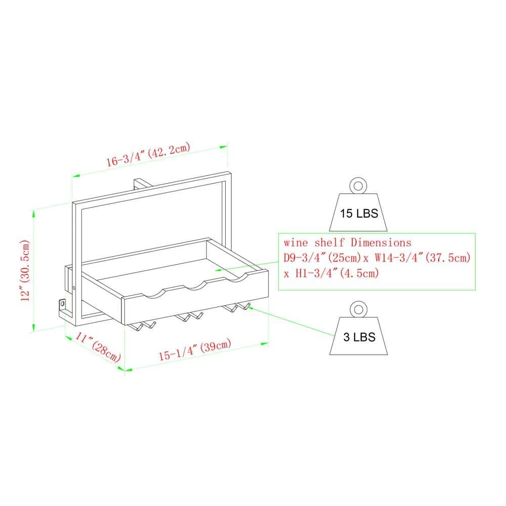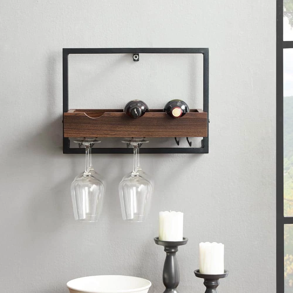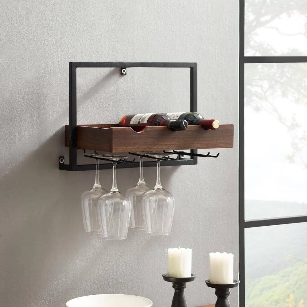 Spice up your dining room or kitchen with this modern industrial wine bottle rack. Impress guests with your great taste when three of your favorite wines sit in the sturdy MDF frame. Hosting cocktail hour is simple when three glasses sit in the metal stemware holder underneath the bottles. And you can brag about your handy skills when you mention that you assembled and mounted this contemporary bottle rack on your own. Your home will look great with the urban, mixed-material frame.