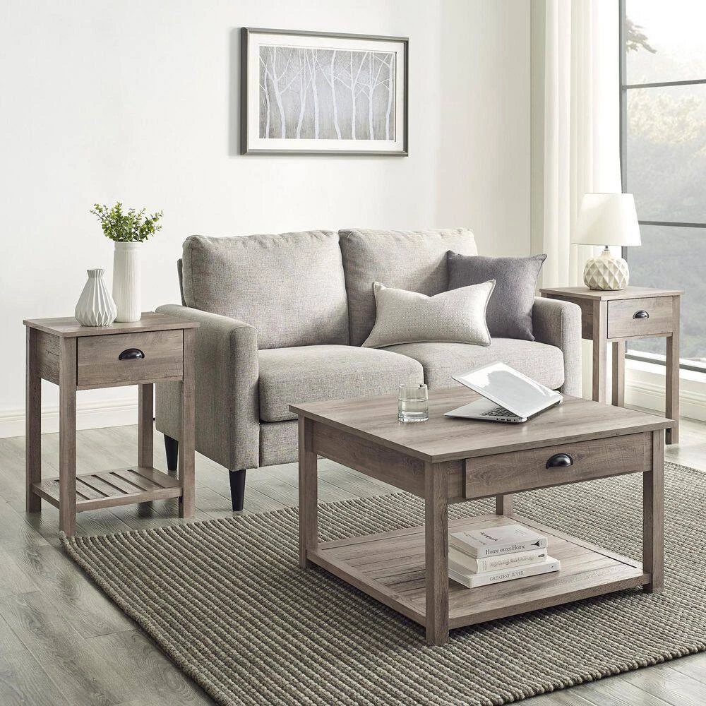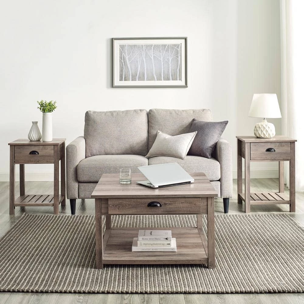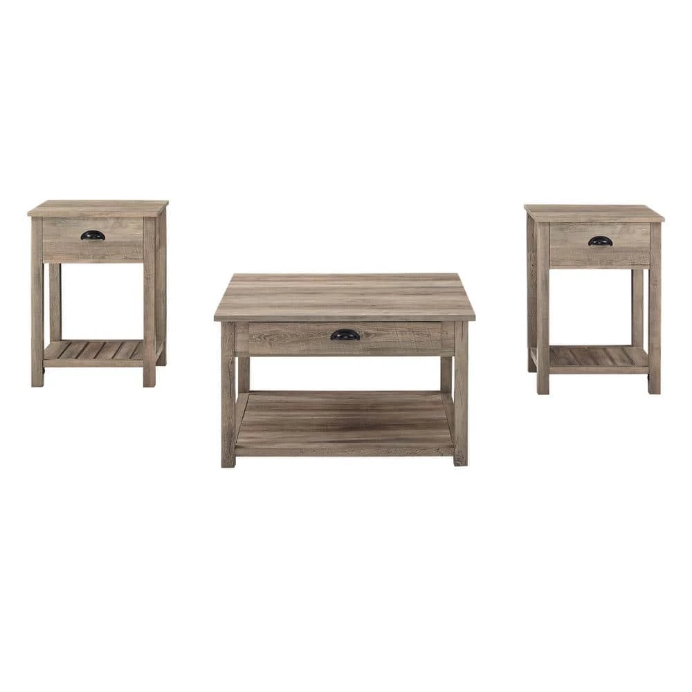 Conjure the image of majestic horses galloping across wide fields with this farmhouse accent table set. The country-inspired grooved lower shelf and cup handles on each piece cause all guests to notice your great design taste. 2-drawers on either side of the coffee table and one on each of the end tables, make hosting easy with the ability to tuck clutter out of sight. Your friends and family will be unable to keep their eyes off your living room with this durable occasional set.