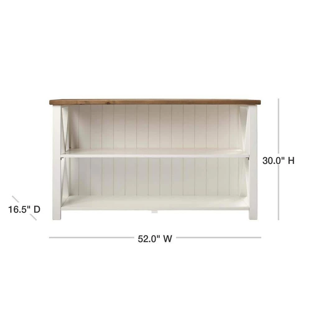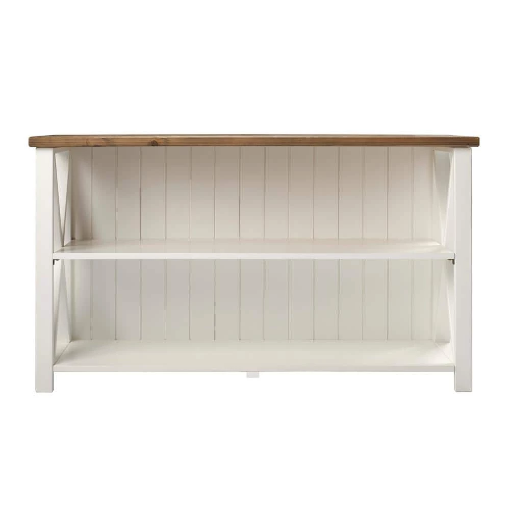 Wide open like the range, this farmhouse storage console is full of possibilities. Framed by a beadboard back and rustic X accents on the sides, this open shelf unit can work well as a bookshelf or a TV console. Made of solid pine wood, this country style stand can accommodate TVs up to 56-inches, plus, with two solid wood shelves you can arrange multiple gaming consoles, speakers, or smart home devices with ease. Create a charming backdrop with this cottage inspired horizontal shelf.