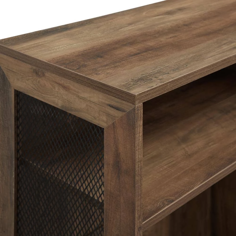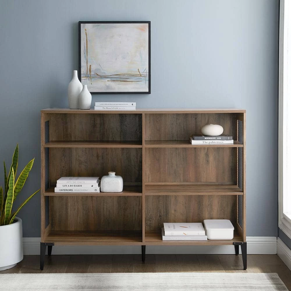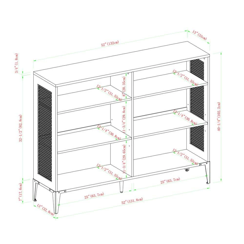 Straightforward, but not without a bold sense of taste, this mixed material bookshelf offers a sturdy and stylish place to store souvenirs, photos, or books. Mesh metal sides and angle iron legs insert an industrial edge to this six compartment mid-level bookcase. Customize your storage experience with adjustable middle shelves and center foot. The top shelves are fixed.