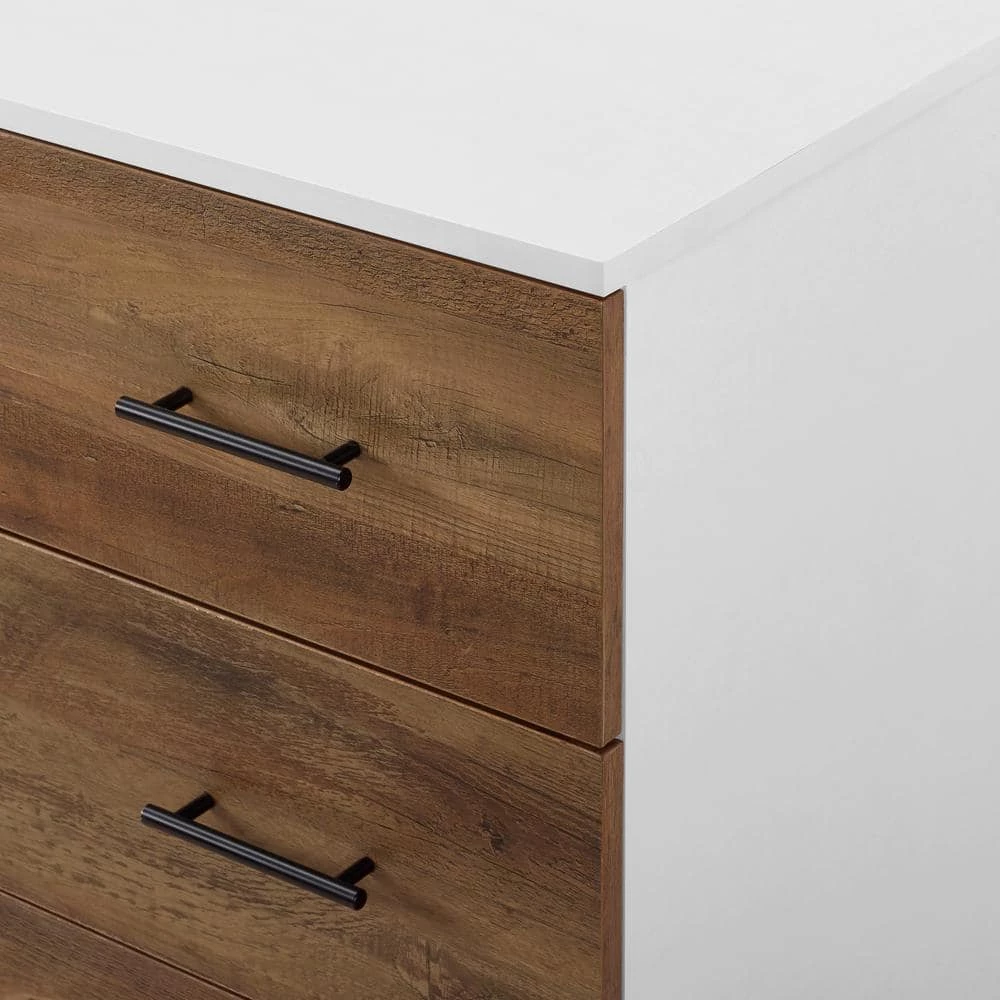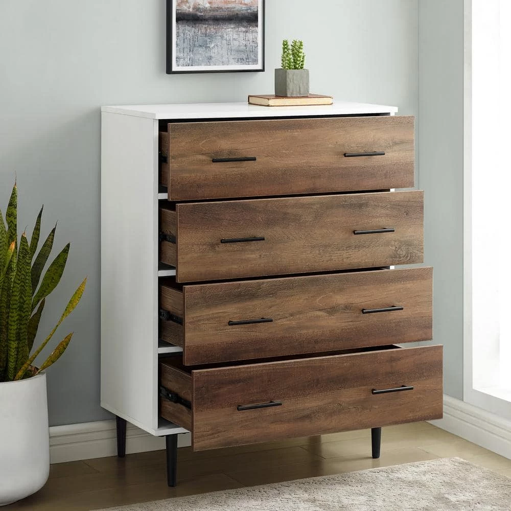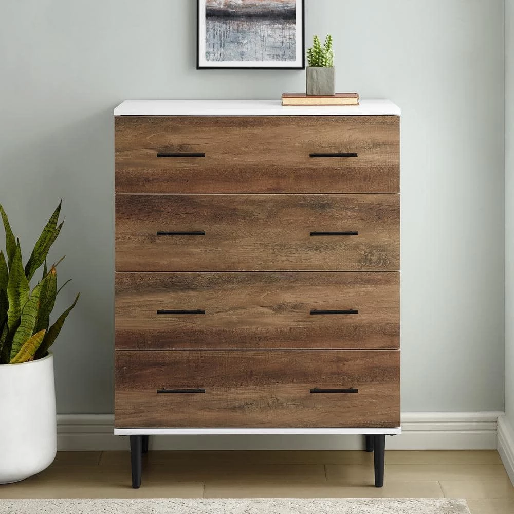 Whether your style is farmhouse, modern, or industrial, this is the chest of drawers for you. This versatile storage solution features four wide drawers for an abundance of space for clothes, linens, or accessories. The dresser’s tapered metal legs and sleek hardware create a classy look for any bedroom or guest room. Use the adjustable rubber feet to stabilize the unit, so your belongings inside the drawers or decorations on the top surface will remain safe and sound.
