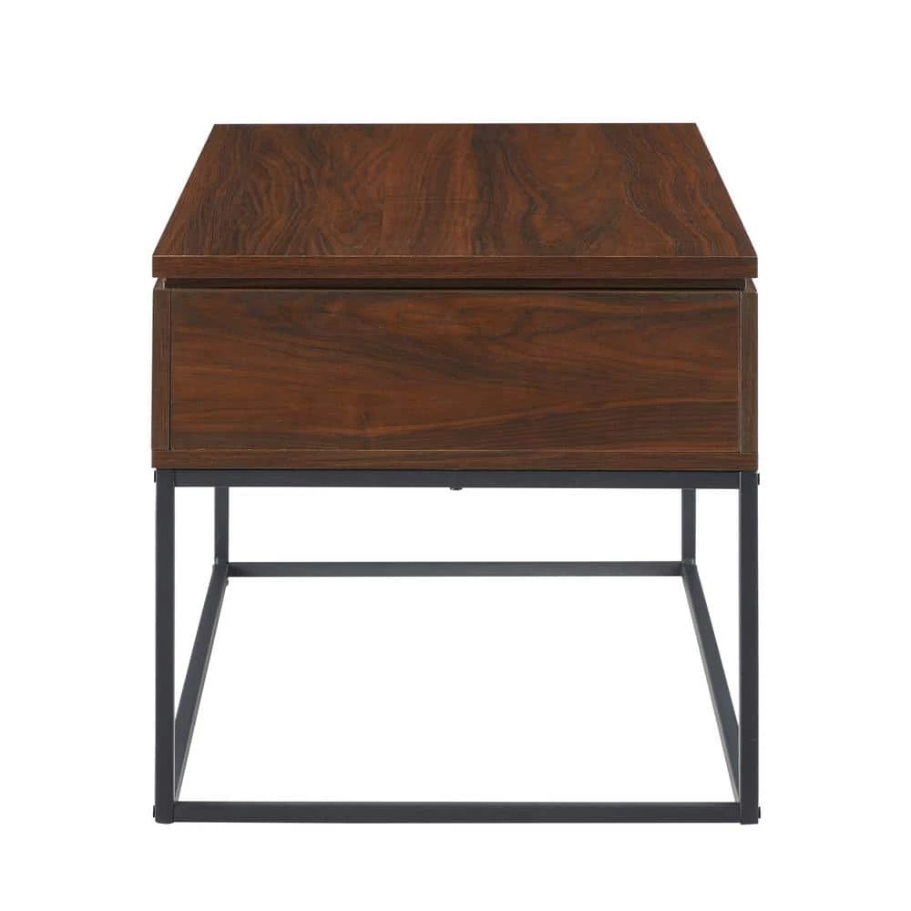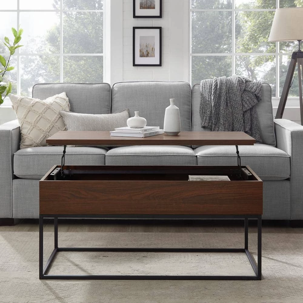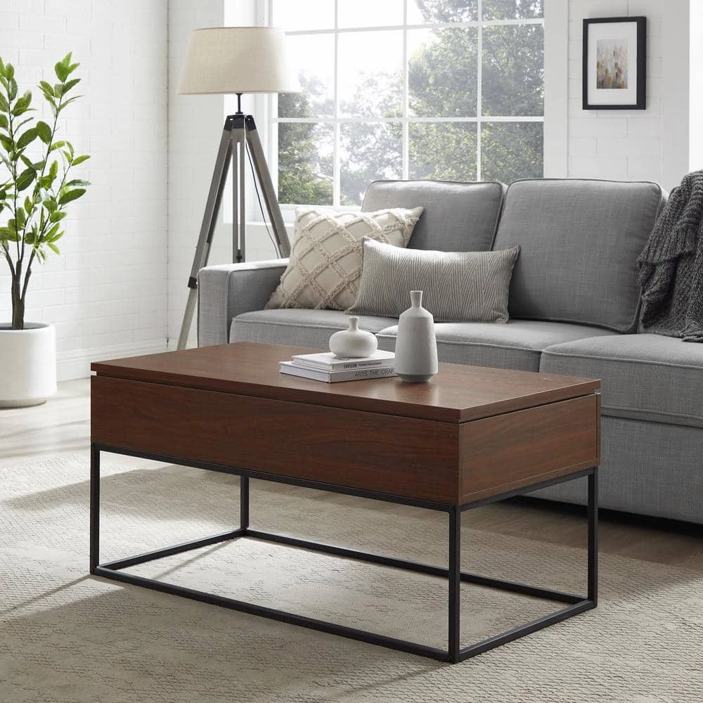 The perfect companion to work-from-homers, movie bingers, and couch chillaxers, this coffee table puts function first. A convenient lift-top surface and locking latches allow you to raise the tabletop to the perfect height and accommodate your laptop, bowl of popcorn, or your evening cocktail so you can sit and study, snack, or sip in comfort. Whether the tabletop is lifted or laid flat, an open cubby underneath provides closed storage for blankets, pillows, movies, or whatever you’d like to conceal to keep your living room clutter-free. With its open-box frame and metal base, this mixed-material coffee table will add a subtle modernity to any room.