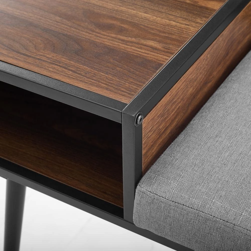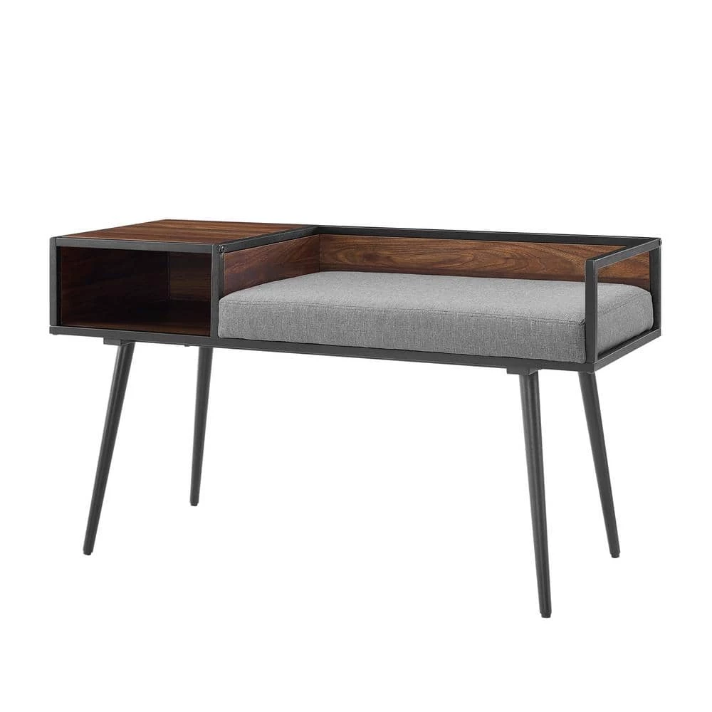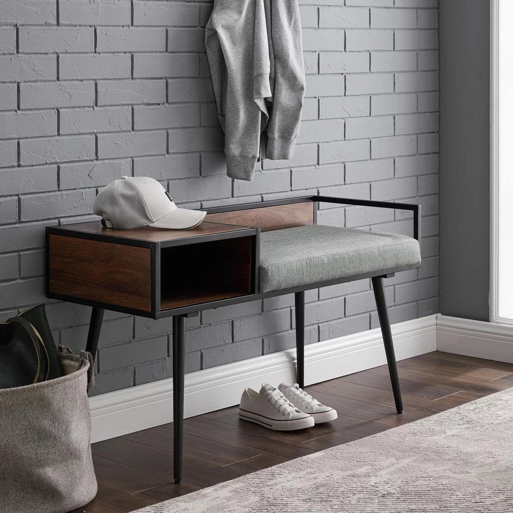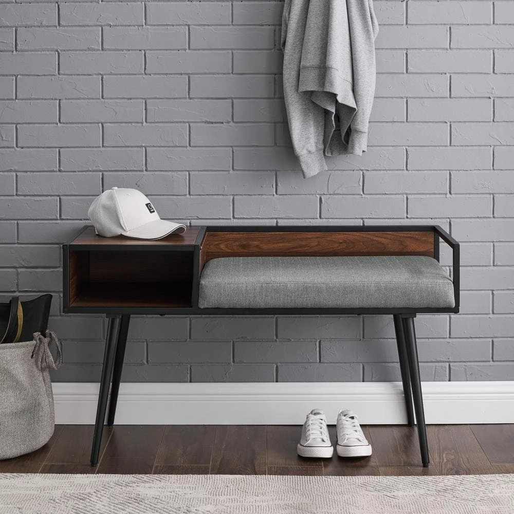Get the conversation started with this modern gossip bench. Inspired by classic mid-century design, this contemporary telephone bench features sleek tapered metal legs and a clean-lined seat and shelf. This entry bench is perfect for cozier spaces or small entrances. Asymmetrical and comfortable, this Scandinavian style bench includes an enclosed shelf on one side and an area to sit with a removable cushion.