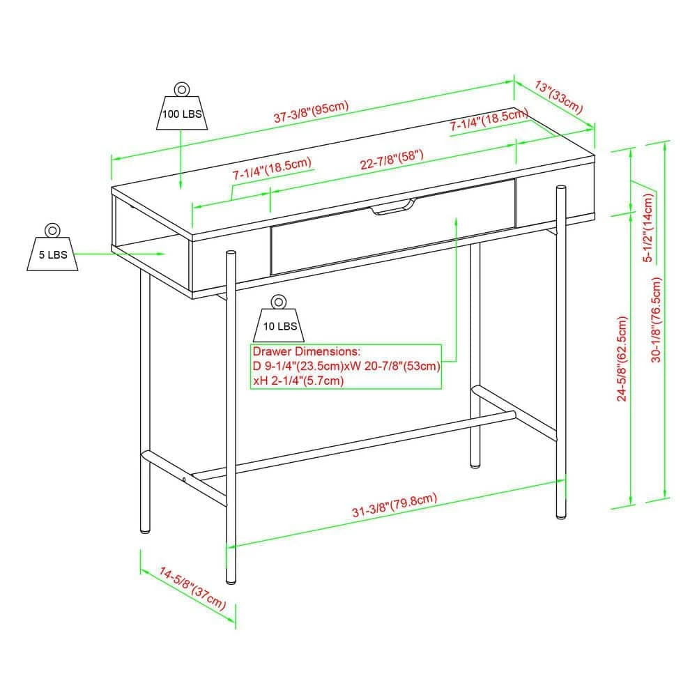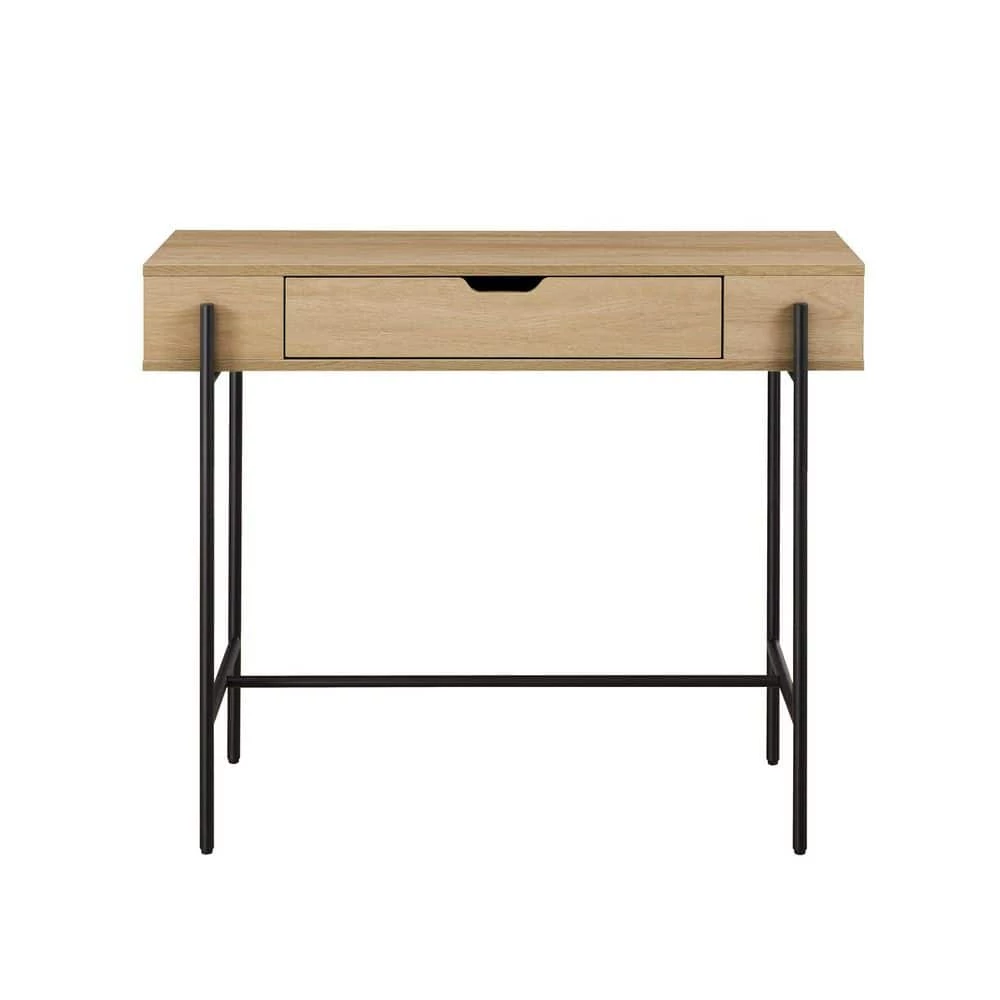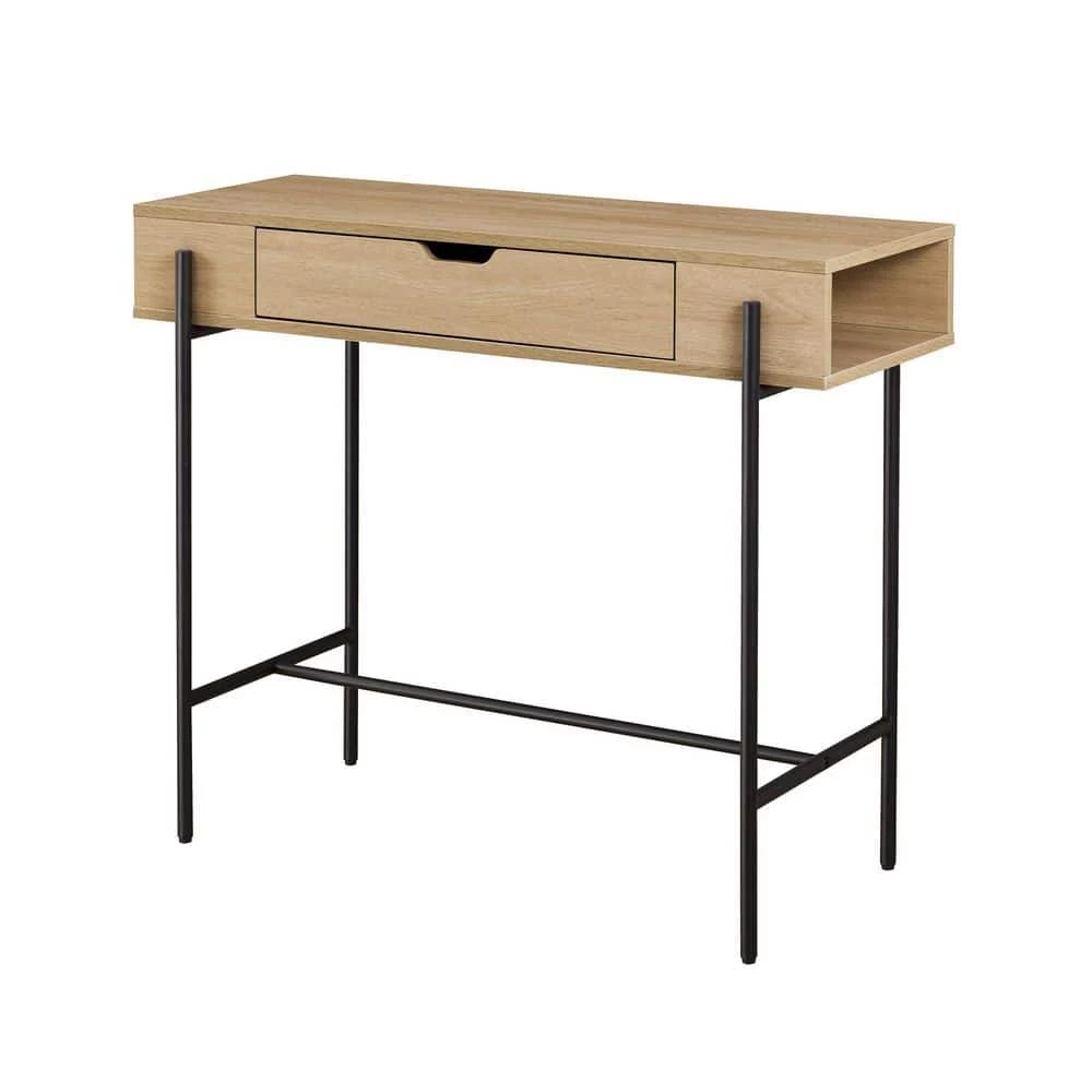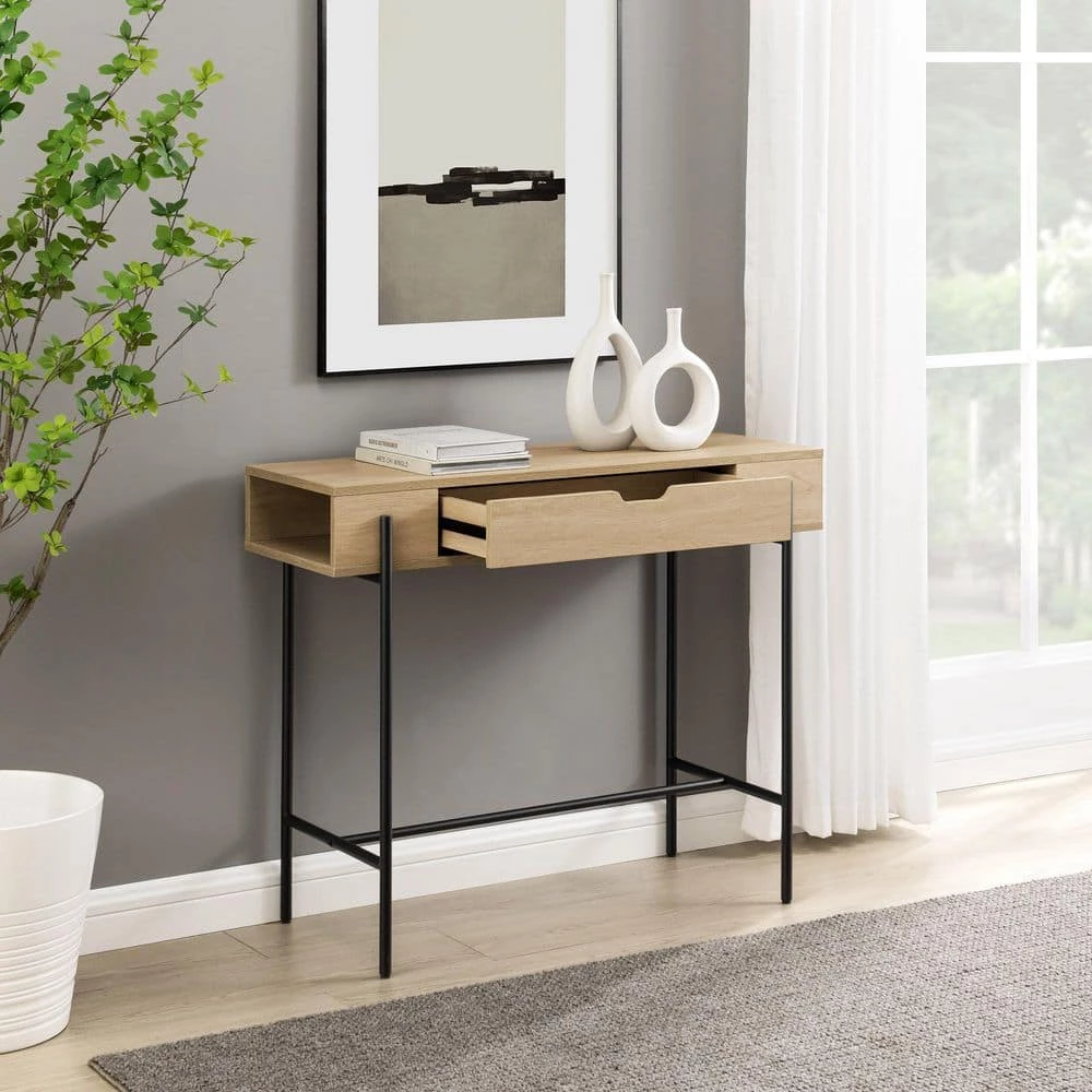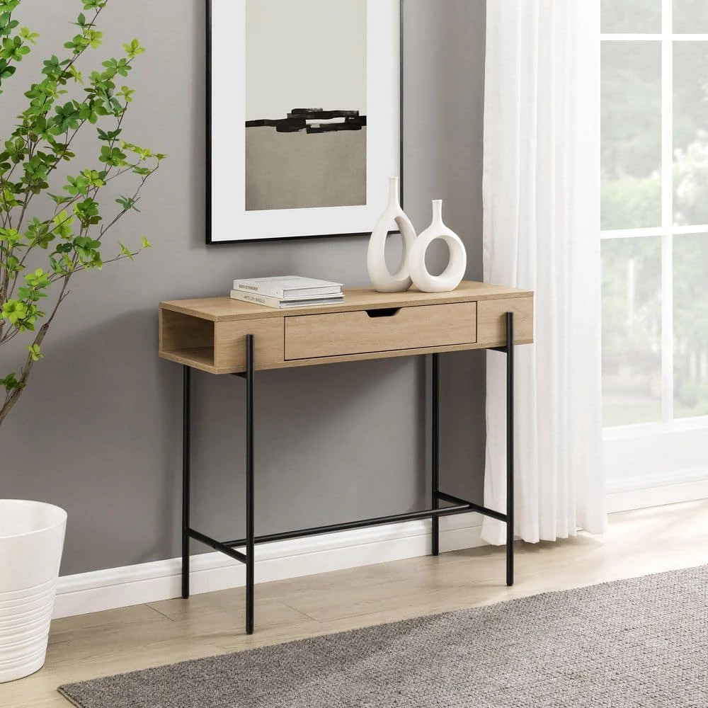 A storage-savvy piece for the modern minimalist, this 1-drawer entry table will be at your beck and call for each hello and every goodbye. Keep keys, last-minute touch-up supplies, or random gadgets in the single drawer for an easy out-the-door routine. Or, keep it in your home office to display your favorite decor and conceal clutter. Wherever it is, this entry console is fit to function as a simple yet stylish statement piece, as well as a place to provide a space for any and everything.
