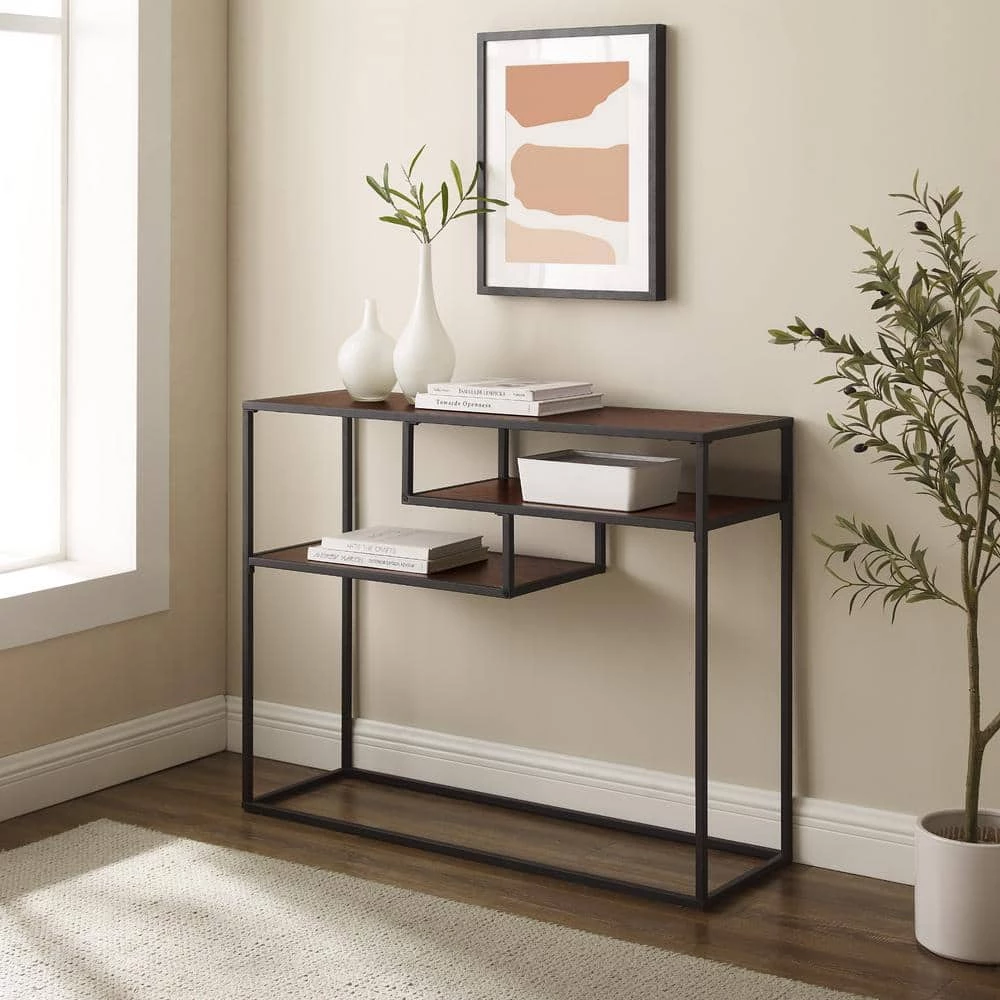 Give your hallway, entryway or mudroom a quick and easy refresh with this contemporary console. Two floating shelves lend additional display space, while a spacious tabletop leaves room to host houseplants, candles and decor. This entry table’s sleek design makes it the ideal couch side storage companion, as well as the perfect piece for your small space or apartment. With included wall-mounting hardware and a sturdy, powder-coated steel build, this piece is sure to debut your favorite decor for decades.