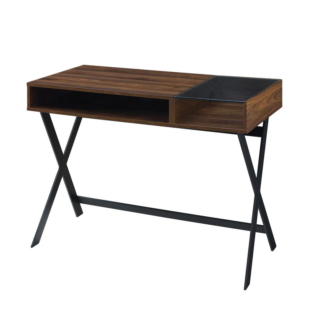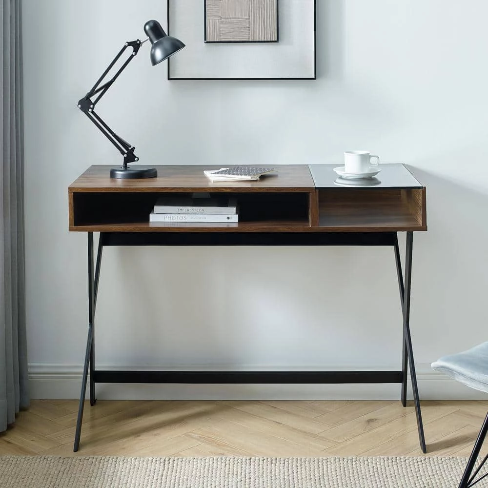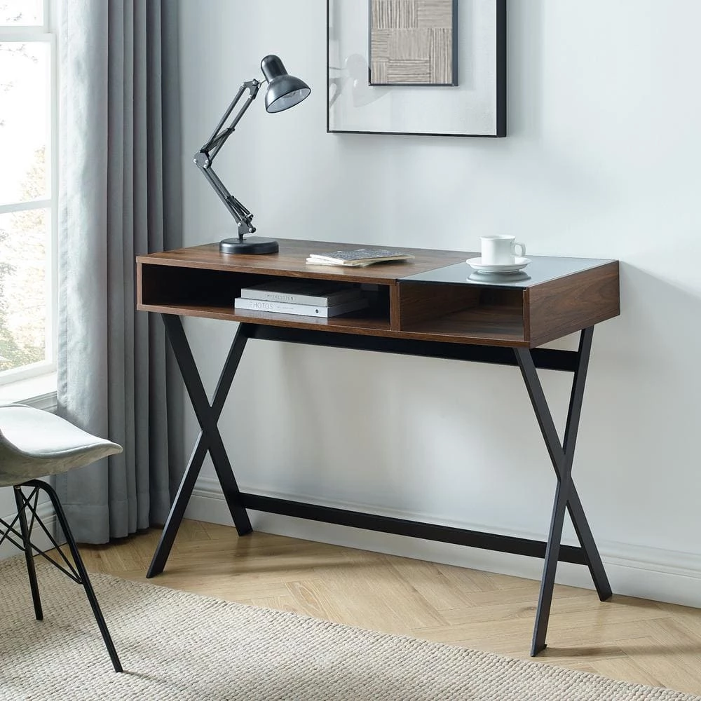 Reenergize your workspace with the chic, studio-like atmosphere that this metal-X leg computer desk lends. A subtle and sleek pop of tempered safety glass on the mixed-material desk top allows you to peek into your carefully curated array of office supplies or study essentials in the open storage cubby below. An expansive surface, spacious open storage cubbies, and a cord management port make it easy for you to create your most inspiring-pieces and projects with plenty of room to store your necessities for the task.