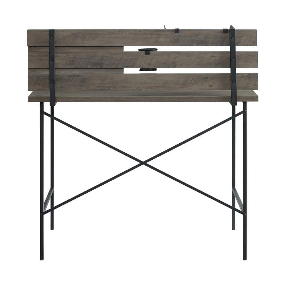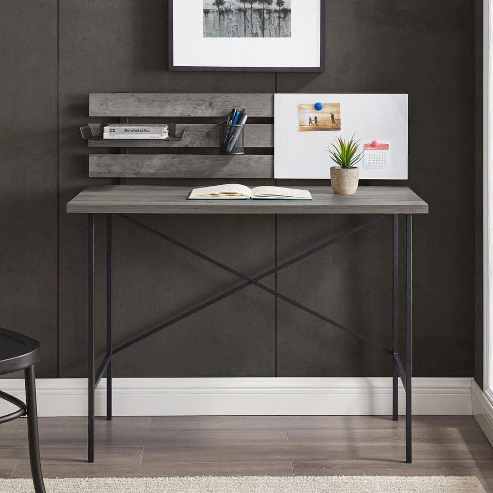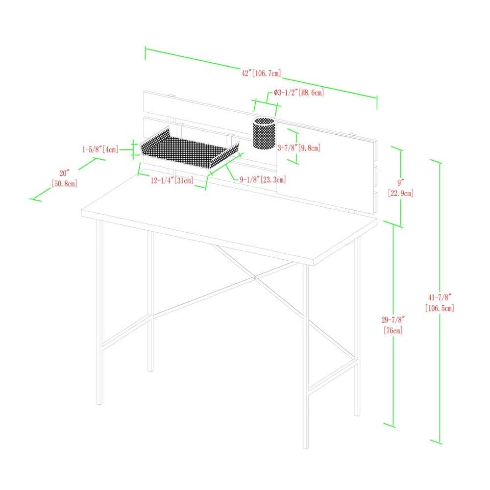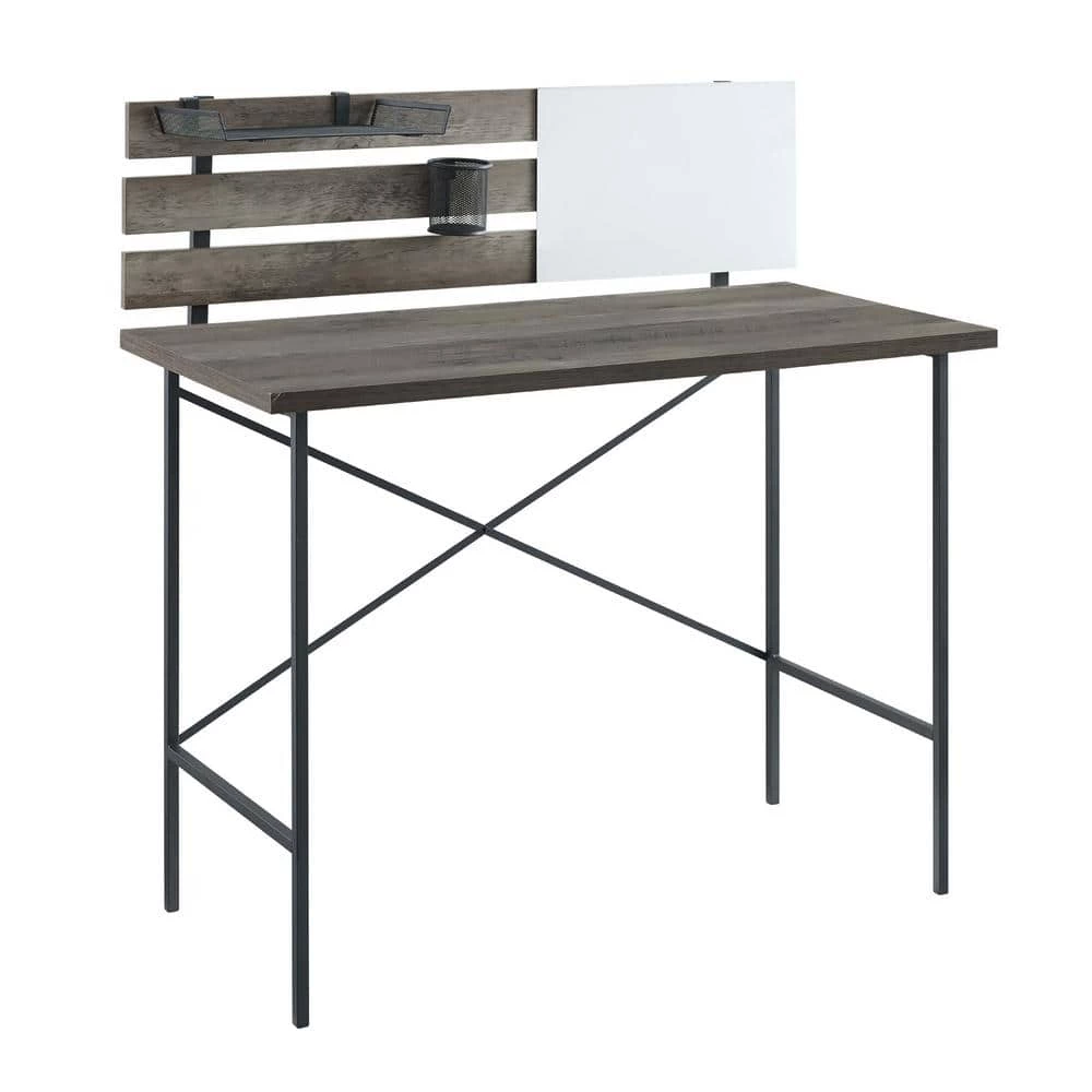 Contemporary and slick, this small space friendly writing desk is replete with additional features that turn this laptop desk into so much more than a simple surface. It has a back extension that includes a magnetic dry erase board on the right with wood slats on the left. This ideal dorm desk also has a removable paper tray and pencil cup that is configured to rest on any of the slats so you can keep the surface of the desk clutter free.