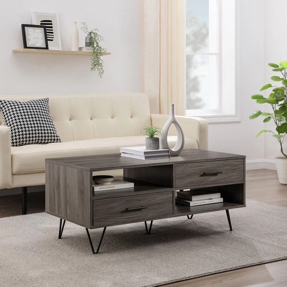 Contemporary, minimalist, and chic. This coffee table showcases all of the above and your favorite decor within the two open cubbies. Conceal clutter within the two spacious drawers and use the cubbies to debut your favorite coffee table books, trendy houseplants, or pretty pottery. Metal hairpin legs lend a subtle nod to mid-century modern interiors while the simple silhouette offers a small-space-friendly frame and ultra-modern design. Complement your contemporary space with the matching entry table for a cohesive curation.