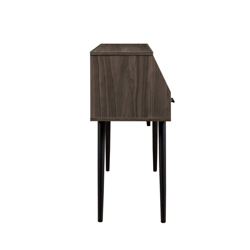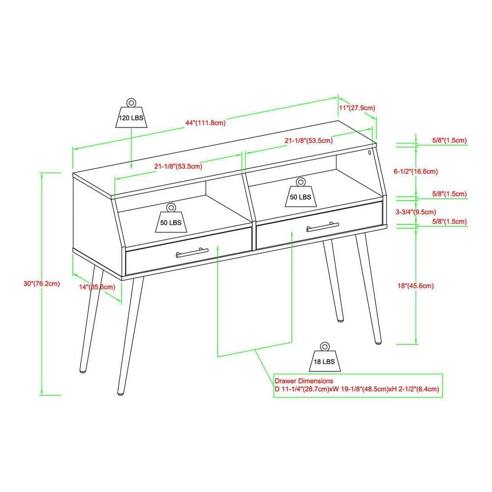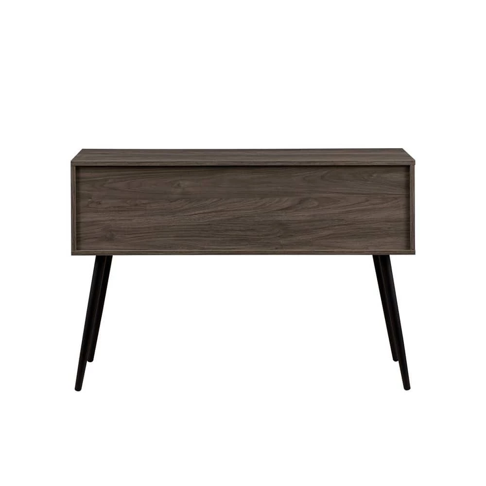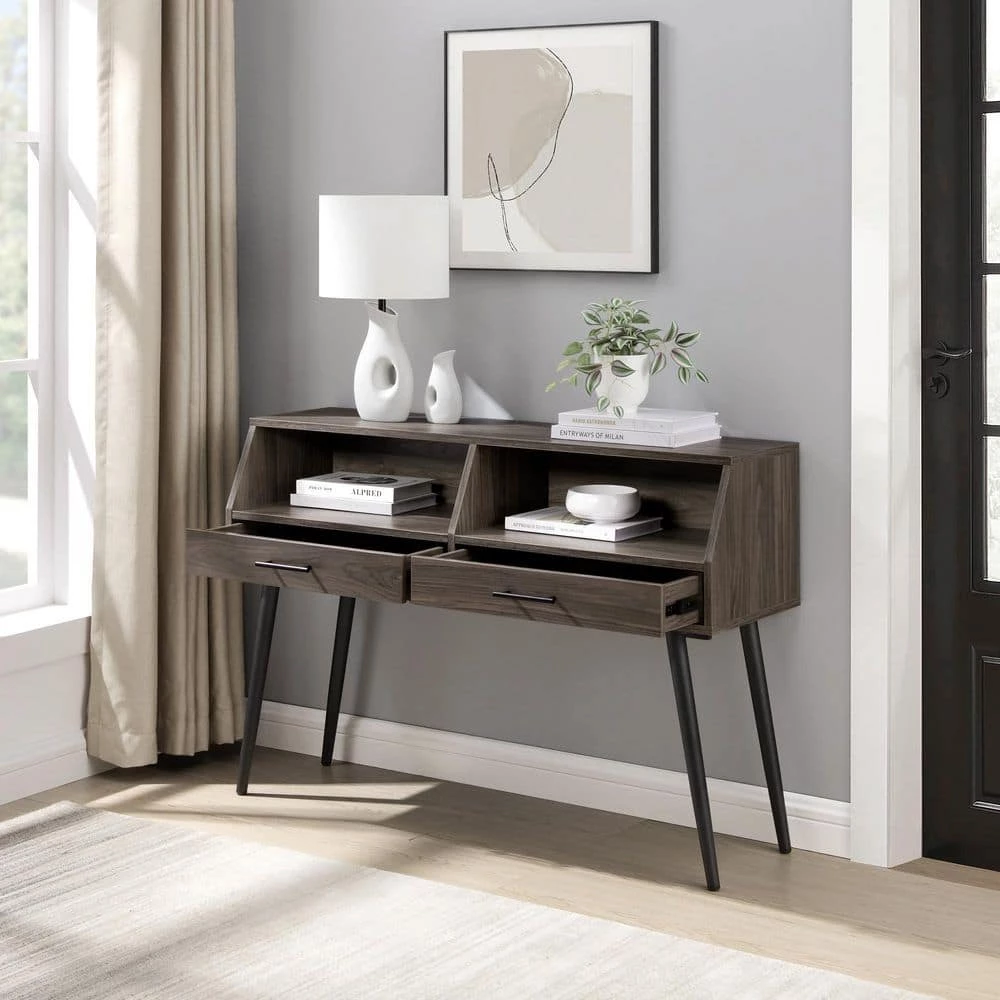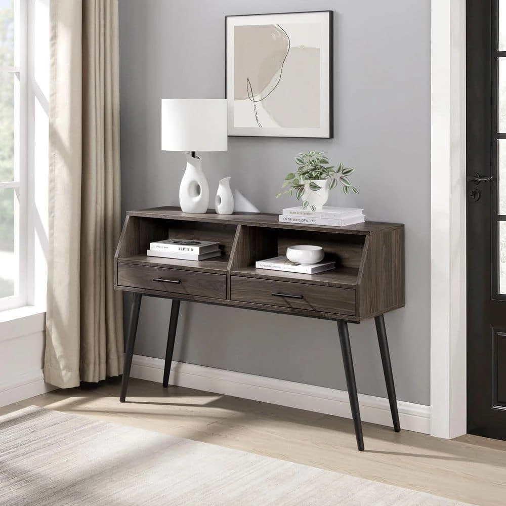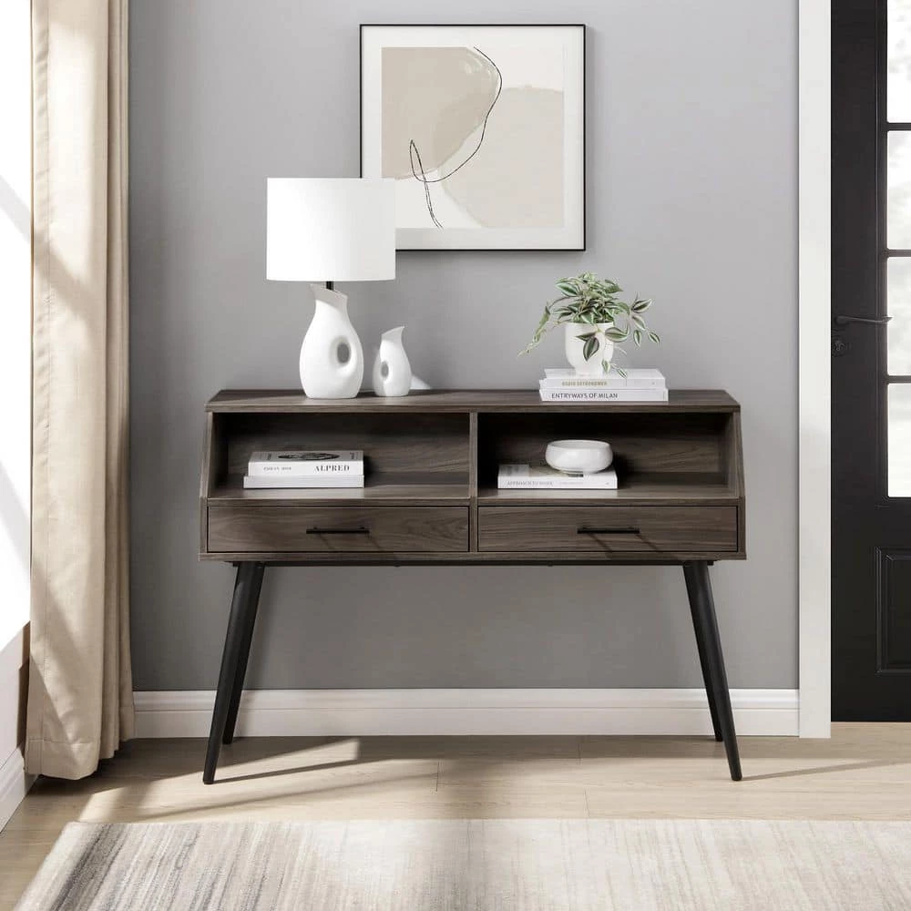 Contemporary contours, minimalist metal drawer pulls, and ample storage: what else could a modern home need? This console table is both storage savvy and stylish with two drawers on smooth metal glides and the divided open cubby space. With a lightweight frame and small-space-friendly silhouette, this console table will lend your space an effortless elegance that’s easy on the eyes as well as your budget. Pair this piece with the matching side table and coffee table to curate a cohesive aesthetic throughout your abode.