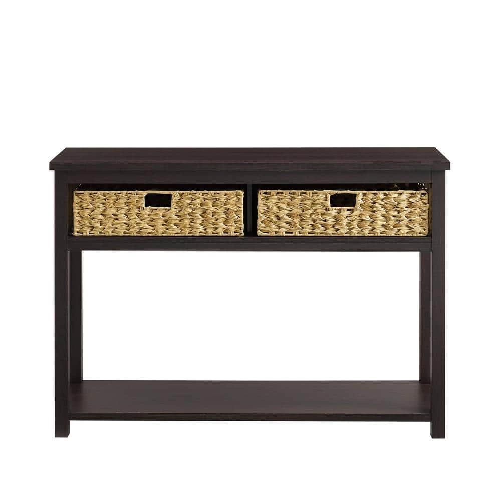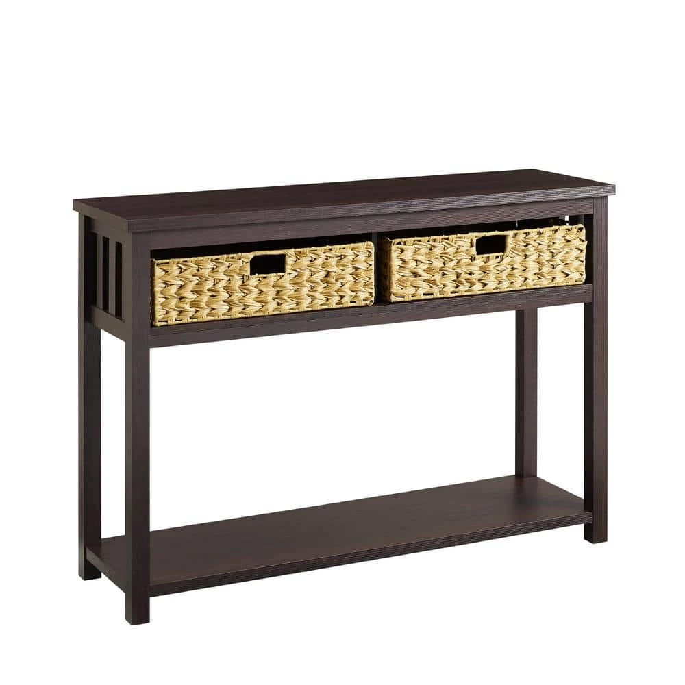 Clear your cluttered hallway with this mission-style entryway table. The rattan baskets provide an easy organizational tool for keys, bags, hats, mail or whatever else you need to tuck out of sight. The lower shelf provides the perfect location for cheery seasonal decor or your favorite shoes. You can trust the warp-resistant MDF wood and durable laminate build for its long-lasting quality. Pair with the matching side and coffee tables for a complete, rustic set.