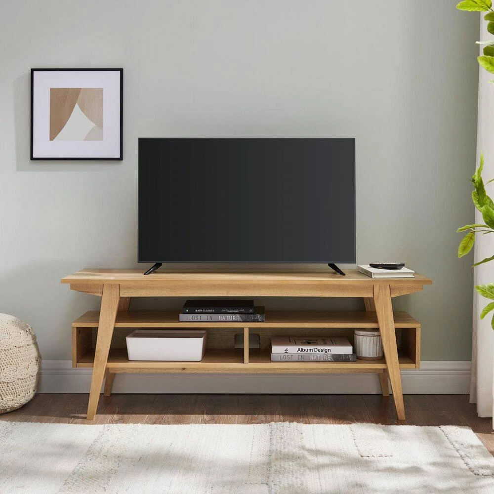 If your design destination is sleek, minimalist, and effortlessly stylish, look no further than this TV stand. Tapered legs and a simple silhouette lend the piece its signature Japandi aesthetic while its cord management organization and open cubbies marry function and form. Host your streaming devices, decor, and gaming consoles with effortless elegance. With its durable veneer build and trendy yet timeless frame, this TV stand is here to stay. Pair it with the matching side table and coffee table to curate a cohesive, contemporary space.