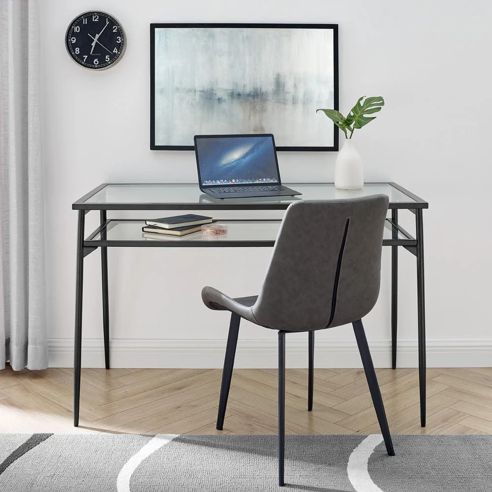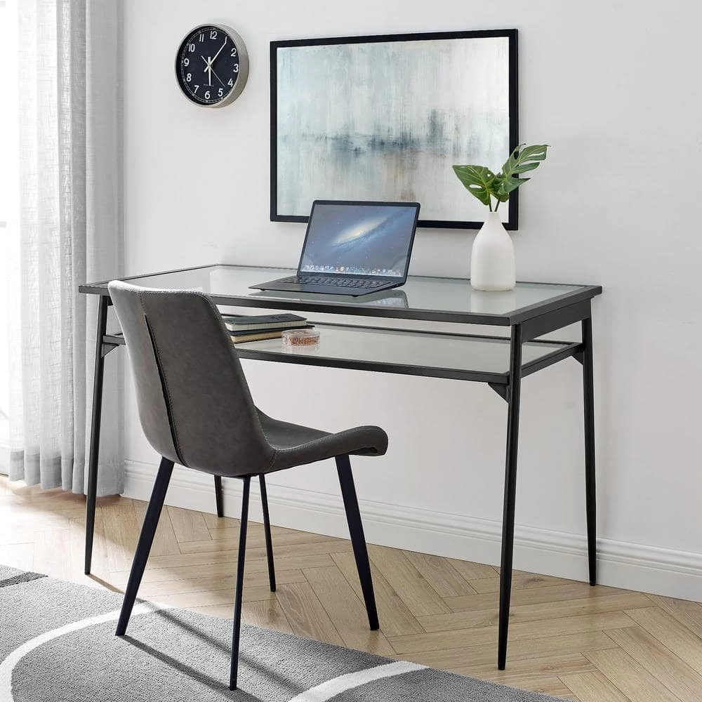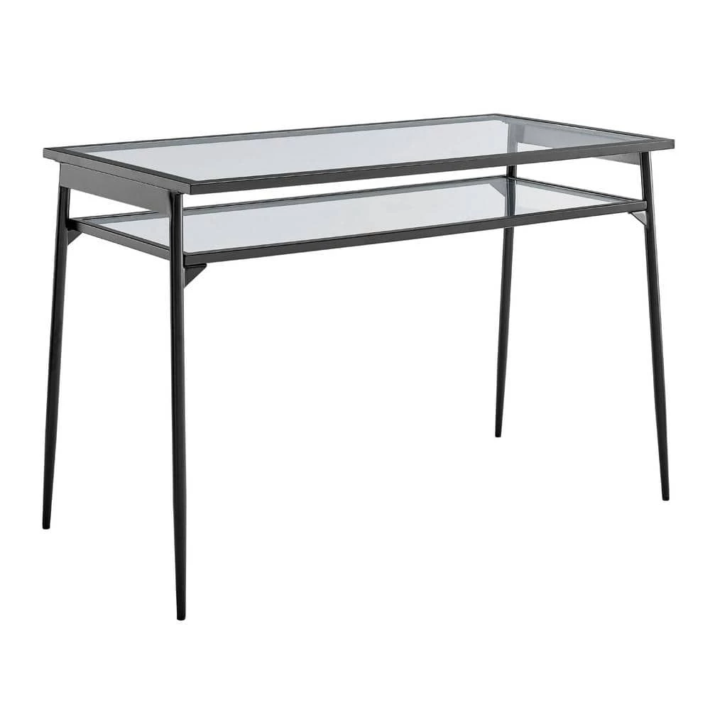 The subtle design of this 2-tier glass top desk won’t be overlooked when you incorporate it into your living room or home office. Its open, minimal silhouette makes it an ideal accent table for small space living because it doesn’t weigh down the space. The 2-tempered glass levels act as open storage for magazines, books or electronics, plus the safety glass makes clean up a breeze. The tapered metal legs support this chic, rectangular writing desk while the capped feet prevent floor scratches so you can move this contemporary table around without a care.