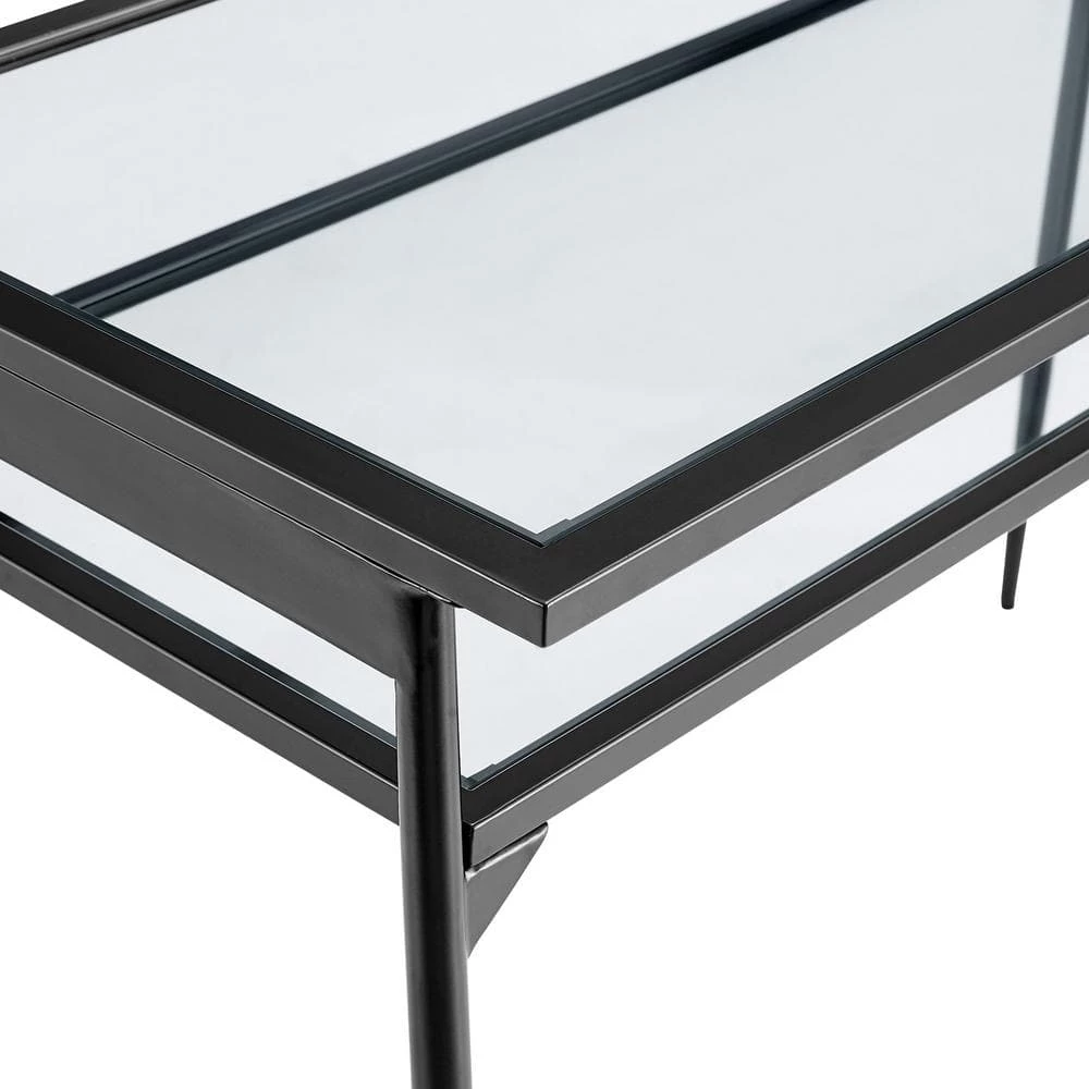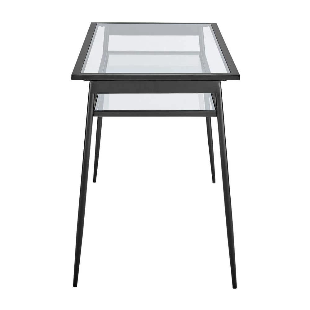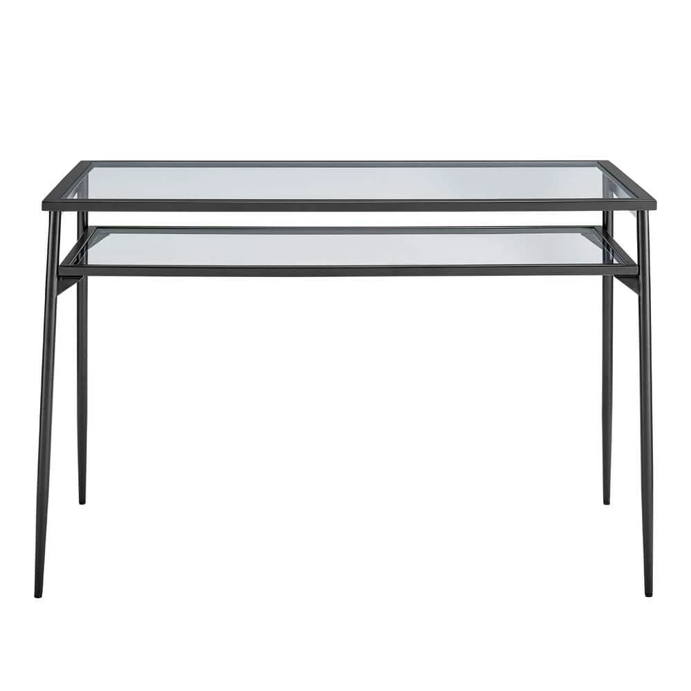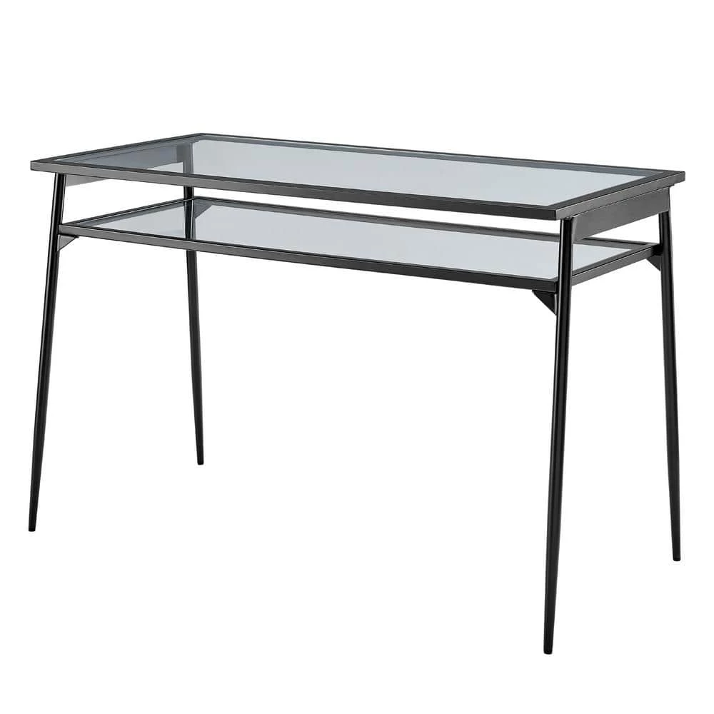 The subtle design of this 2-tier glass top desk won’t be overlooked when you incorporate it into your living room or home office. Its open, minimal silhouette makes it an ideal accent table for small space living because it doesn’t weigh down the space. The 2-tempered glass levels act as open storage for magazines, books or electronics, plus the safety glass makes clean up a breeze. The tapered metal legs support this chic, rectangular writing desk while the capped feet prevent floor scratches so you can move this contemporary table around without a care.