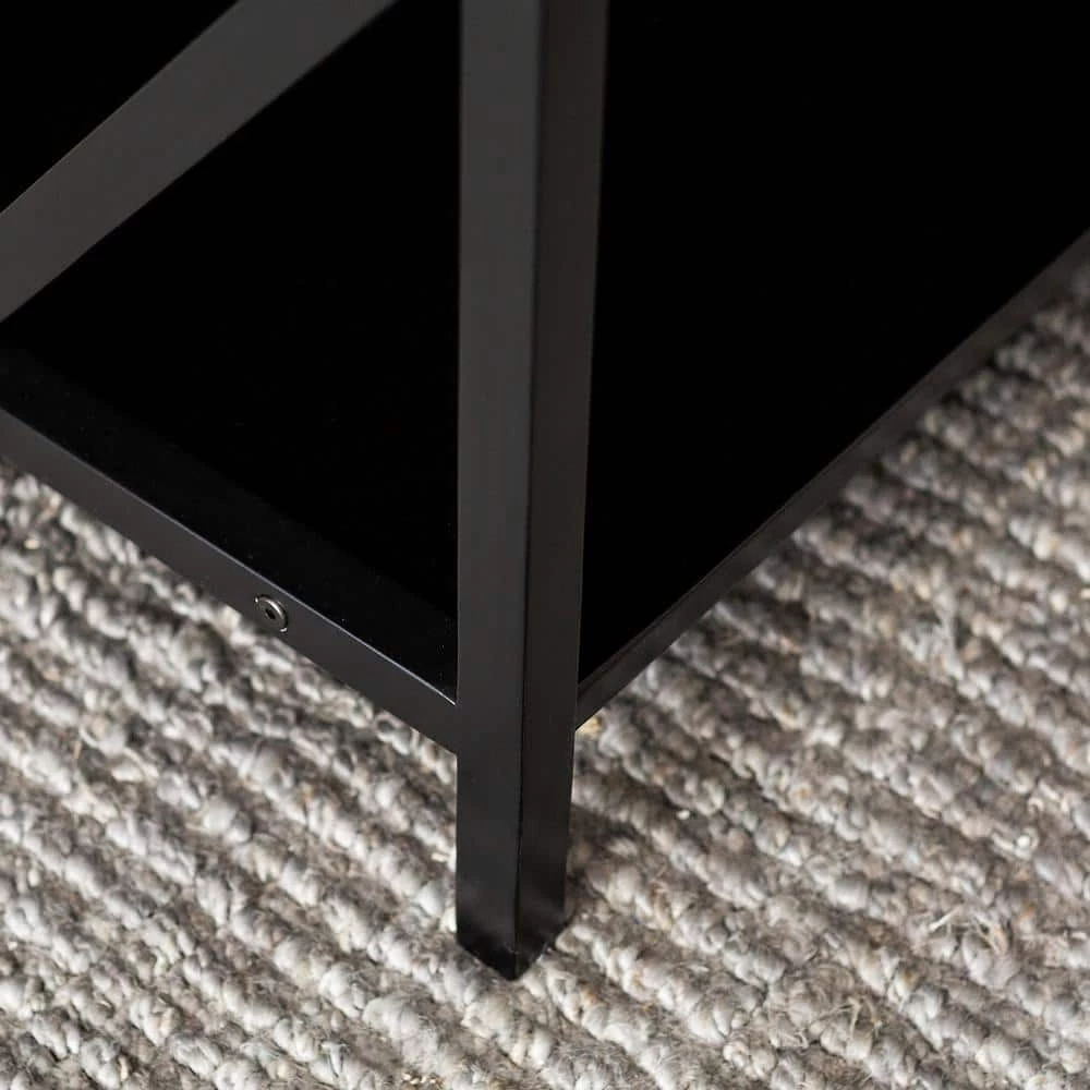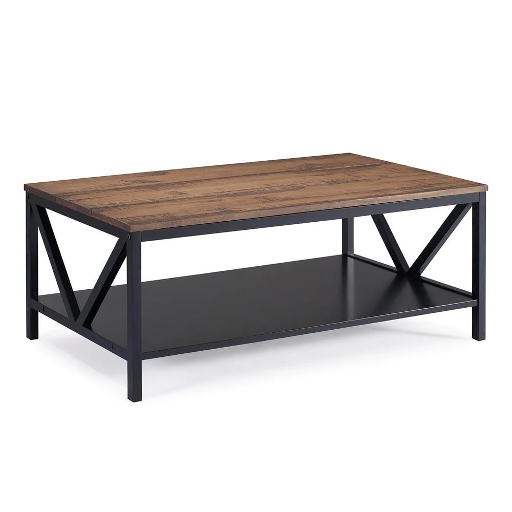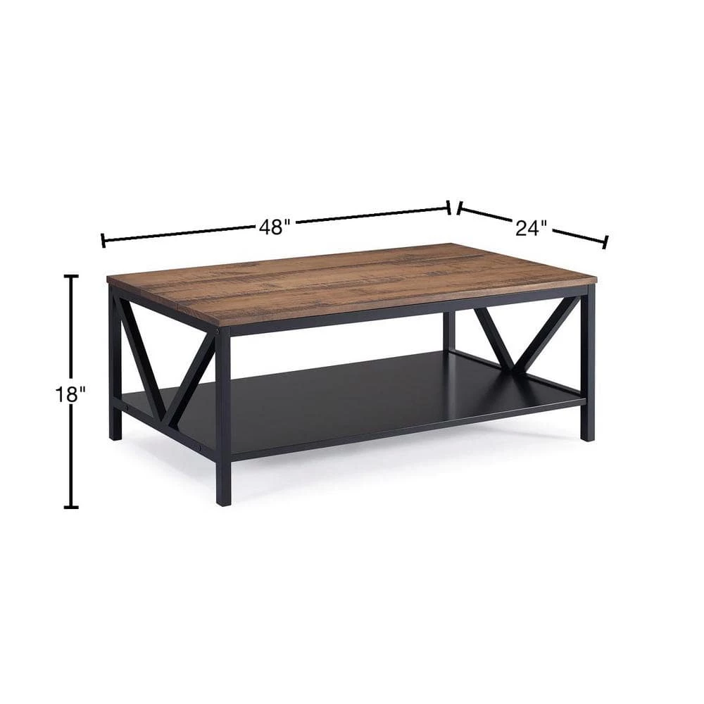 Complete that cozy home feeling with this 48 two-tone farmhouse style coffee table. This piece is ideal for both entertaining and every day cares. Whether you use it as a cocktail table or a spot to serve after school snacks, the distressed solid wood table top will impress you with its durability. The solid wood legs with a trestle like detail also increase the stability and character of this wood accent table. And as a final touch, this rectangle coffee table also features a lower shelf made of high-grade MDF for storage.