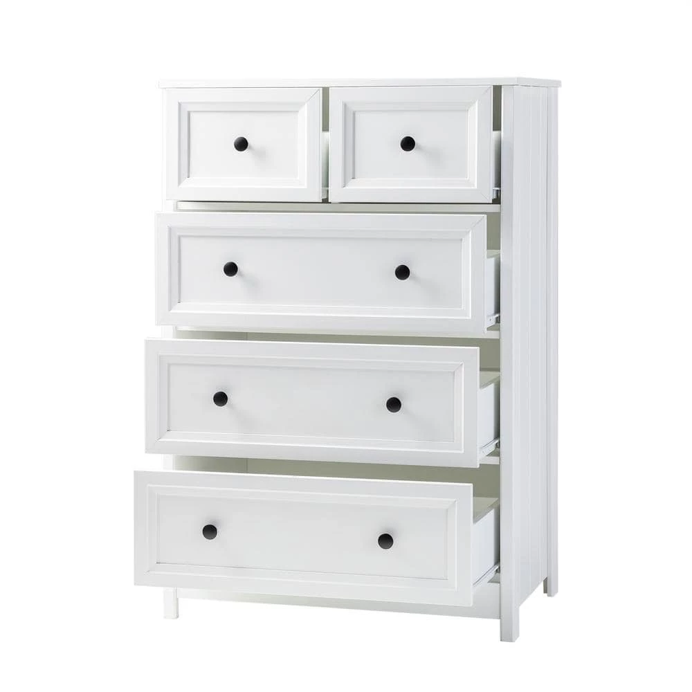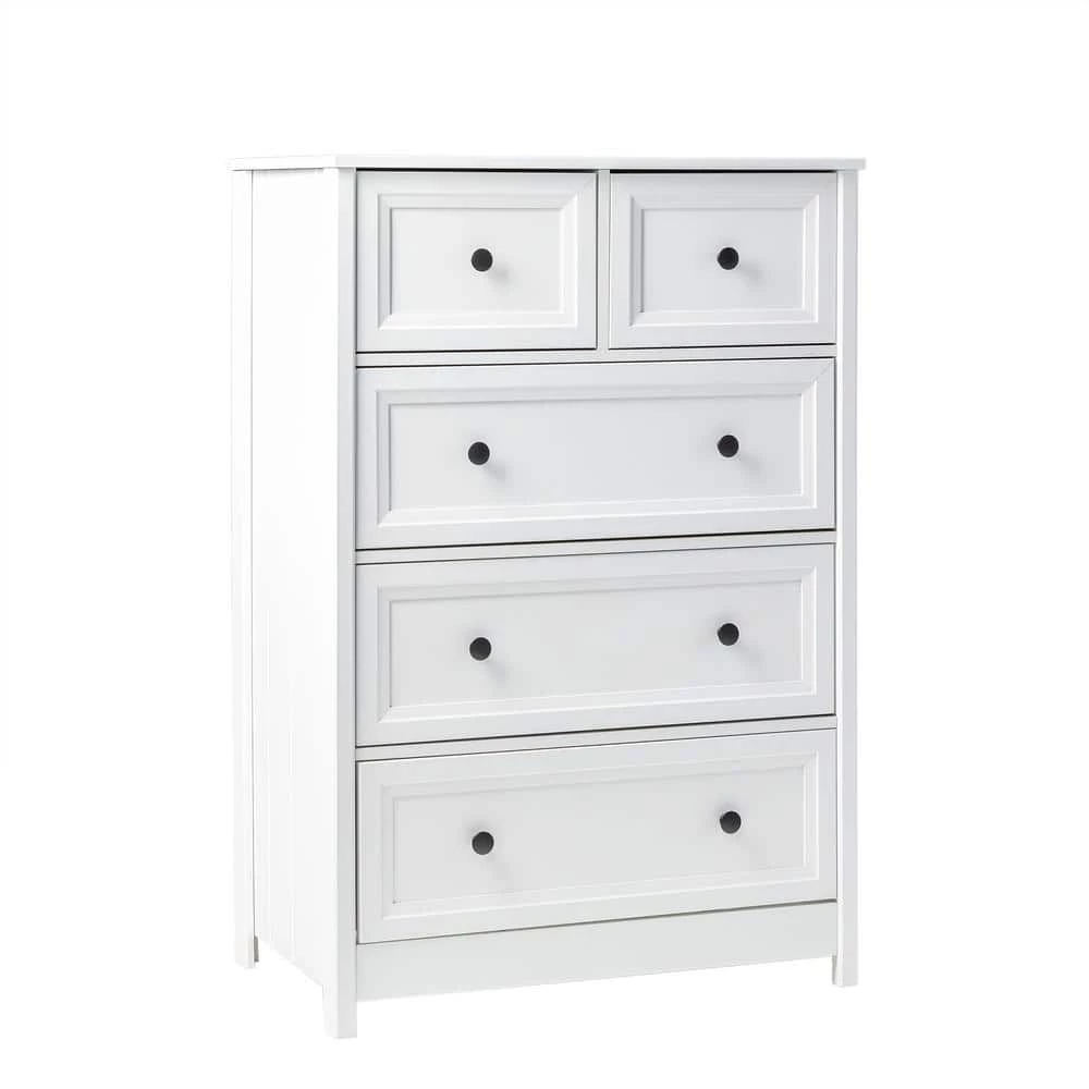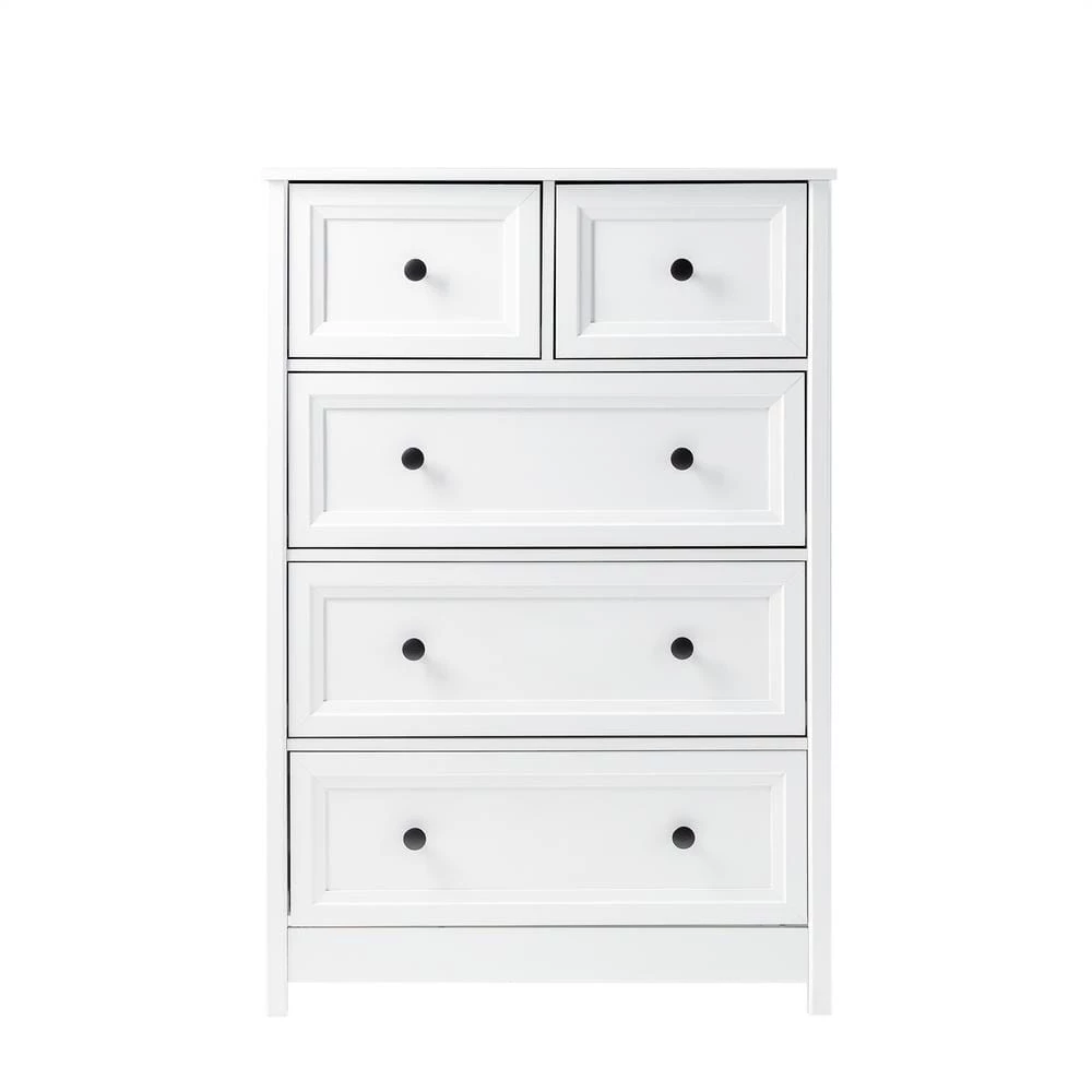 Pull some inspiration from your daydreams of the countryside with this quintessentially cottage-inspired five drawer dresser. Its timeless profile showcases classic detail, while metal drawer handles offer a subtle contemporary touch. Five spacious drawers provide copious hidden storage for anything, from children’s clothes to your own wardrobe or spare linens. The perfect piece to appeal to both youth and mature spaces, this bedroom classic encourages you to get lost in a whimsical bedtime story or style it with your favorite tabletop decor.