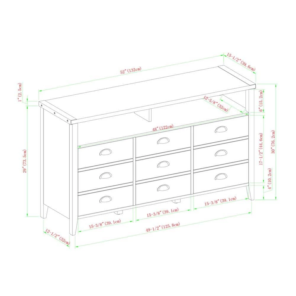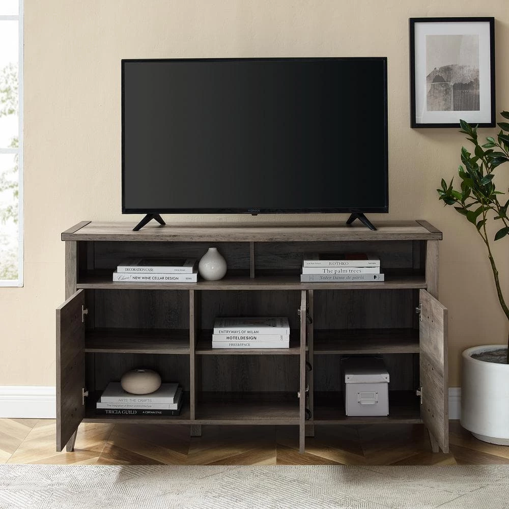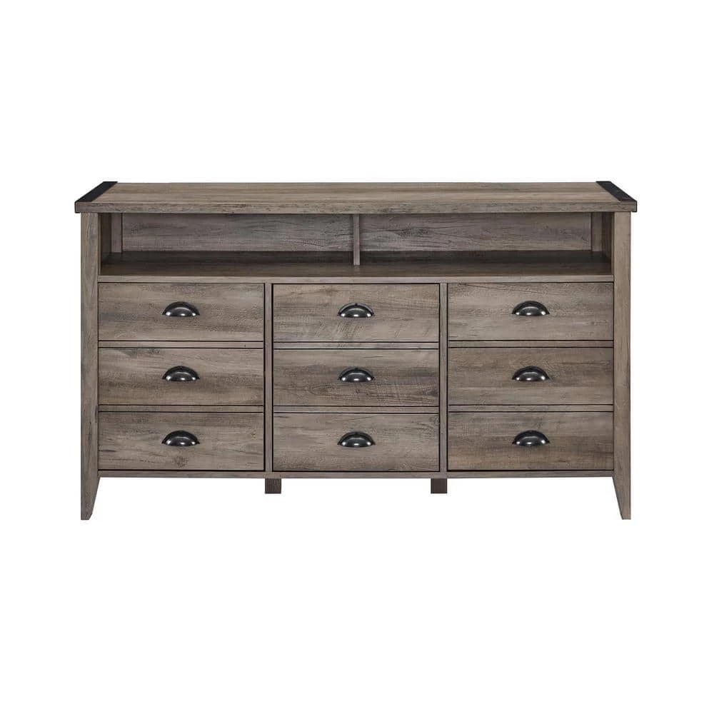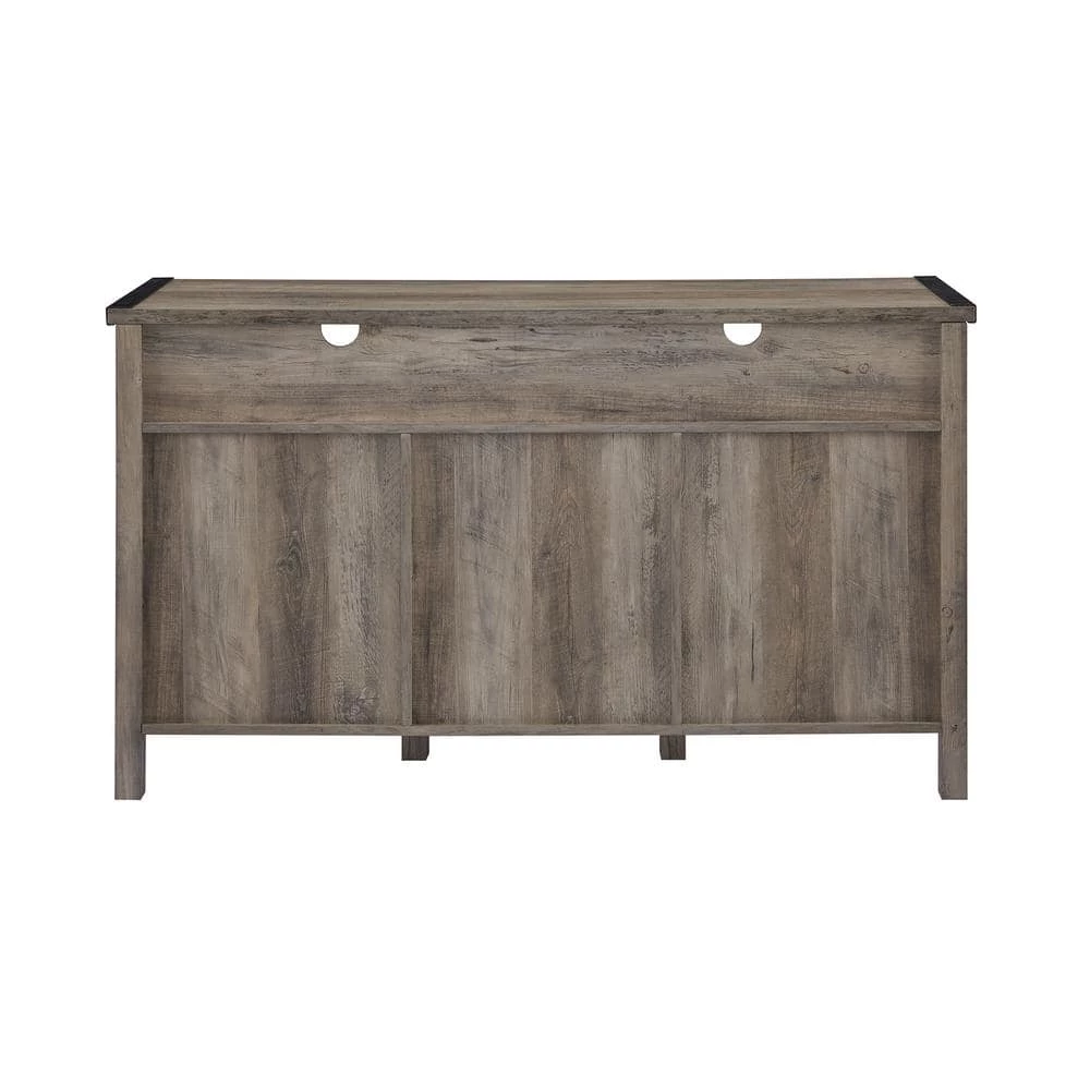 This industrial farmhouse sideboard functions as a TV stand that can accommodate TVs up to 56 in. It has two open divisions on the top of the unit that have cord management options so you can keep your gaming consoles or cable box accessible, plus, that part of the unit is soundbar compatible. The bottom of this storage console has three compartments of closed storage on the bottom that features adjustable shelves. Three doors with adjustable soft close hinges create the look of nine drawers, emulating the eclectic look of an apothecary cabinet.