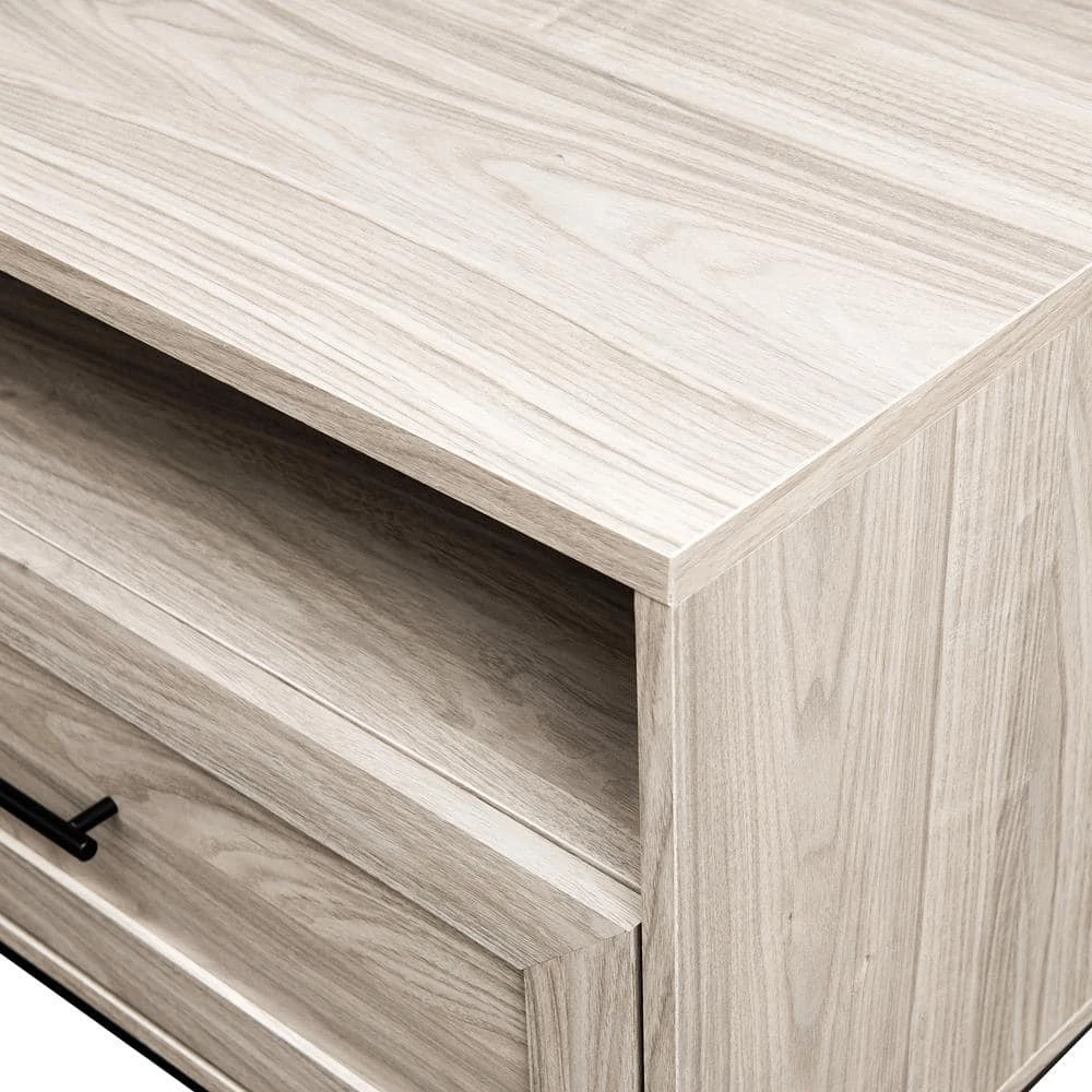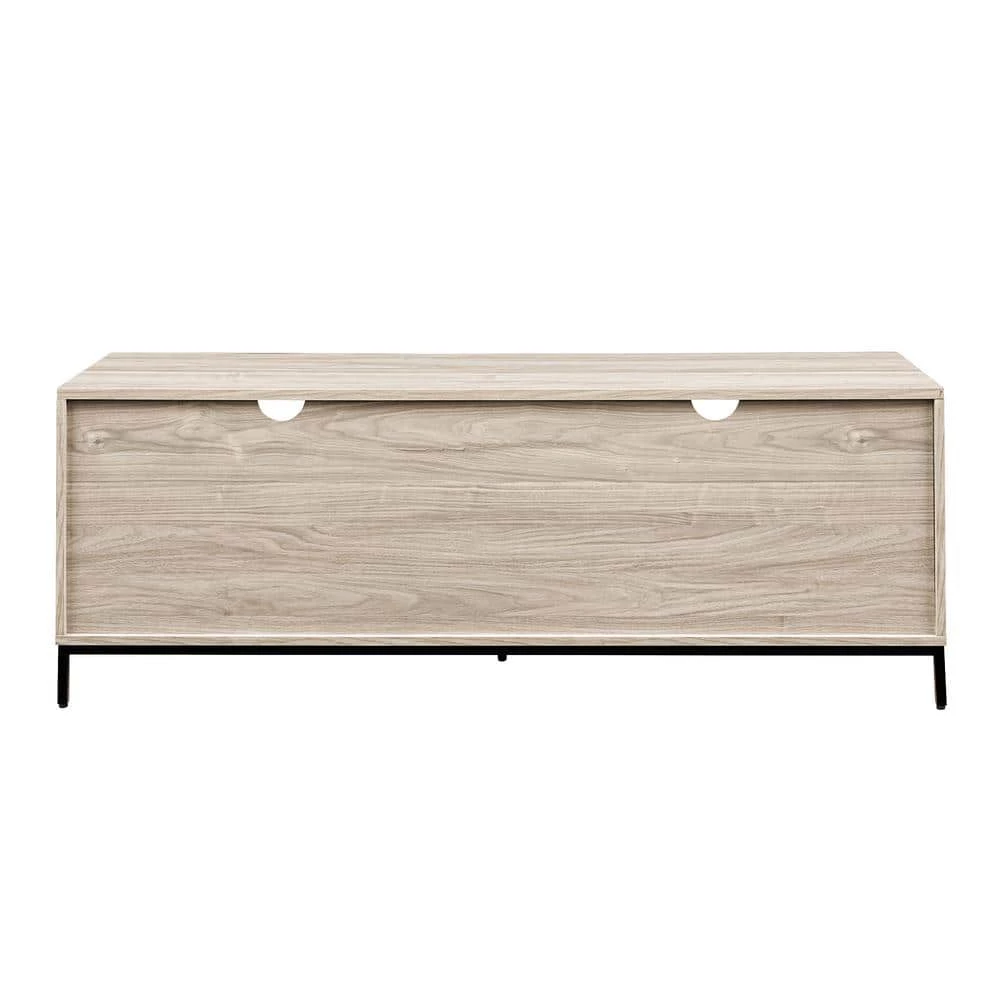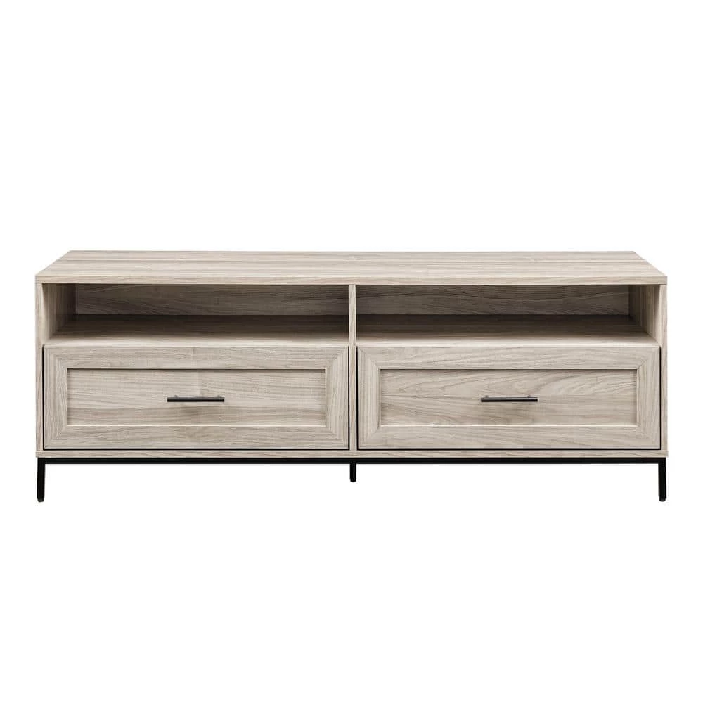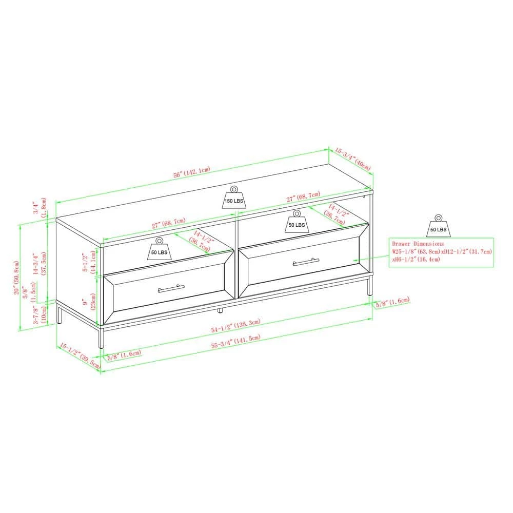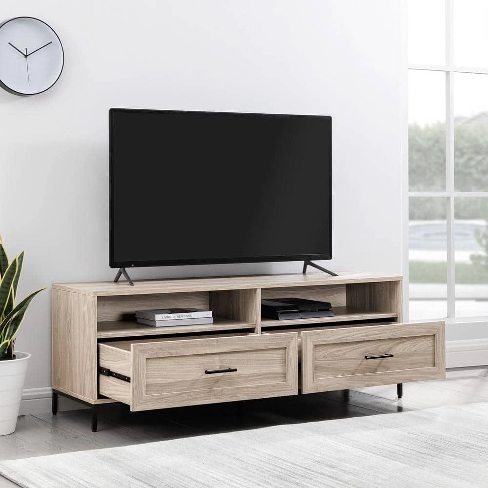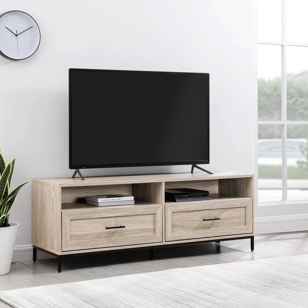 Movie nights have never felt more right than with your 60″ TV sitting atop this modern console. Cozy up and enjoy your favorite flicks with enough room to store all of your media consoles, DVDs, gaming systems, or streaming devices within the two open cubbies and two drawers. Put your display-worthy decor on debut within the open cubbies, or use them to house your media and feed your cables through the cord management ports for an ultra-clean look. With a modern build, minimalist black hardware, and a classic silhouette fit for storage, this TV stand will help your living room will look as instantly refreshed as you’ll feel after a good series binge sesh.