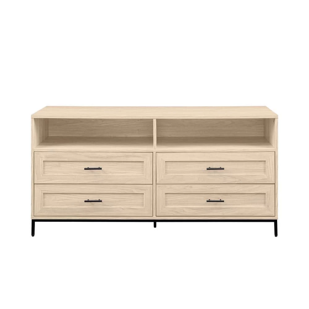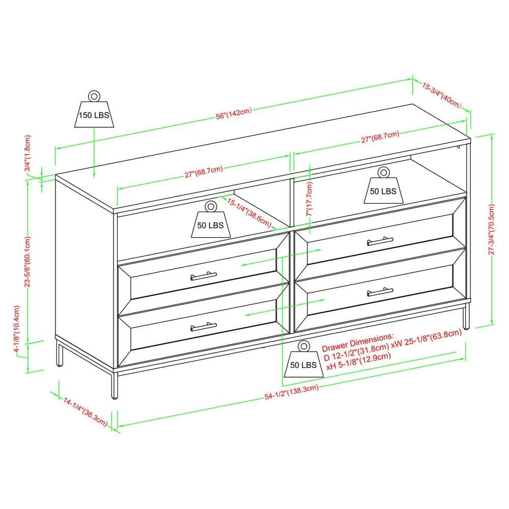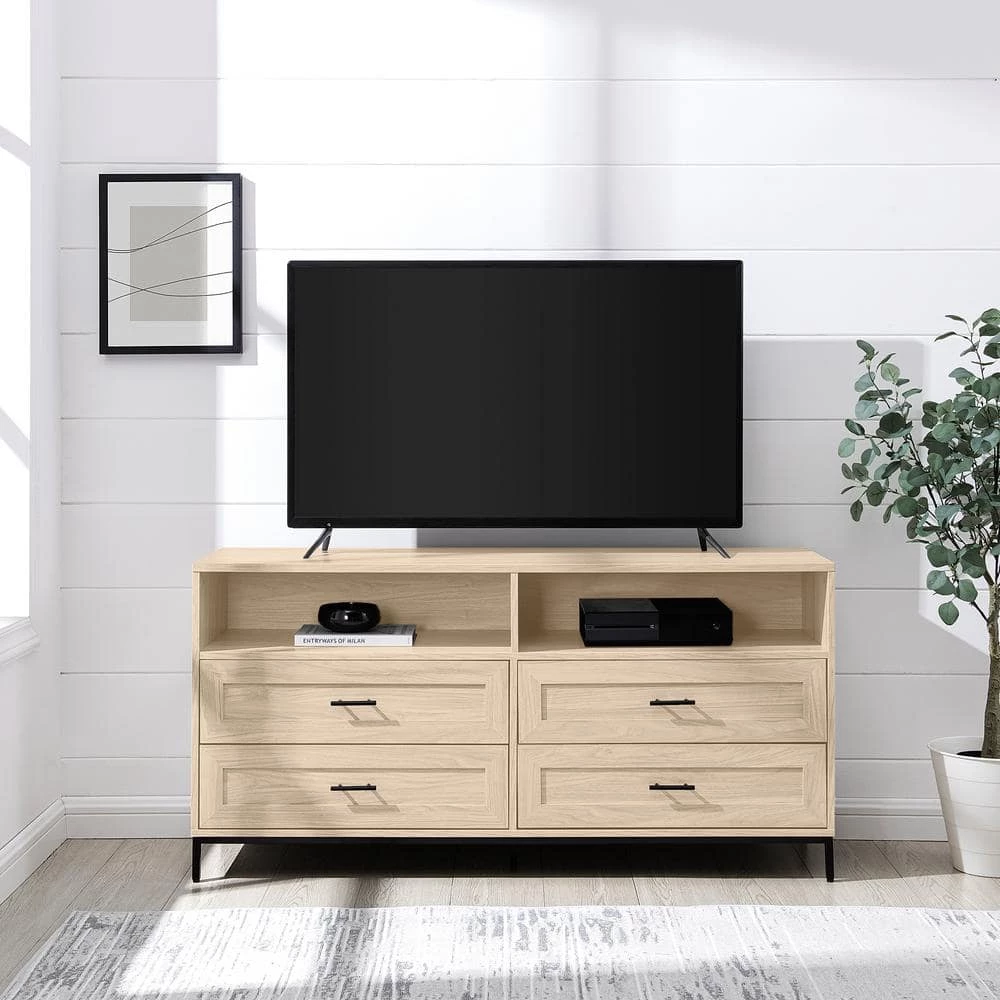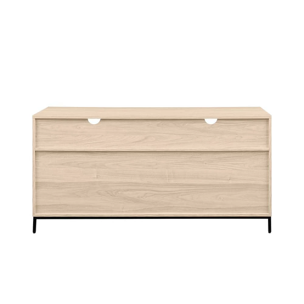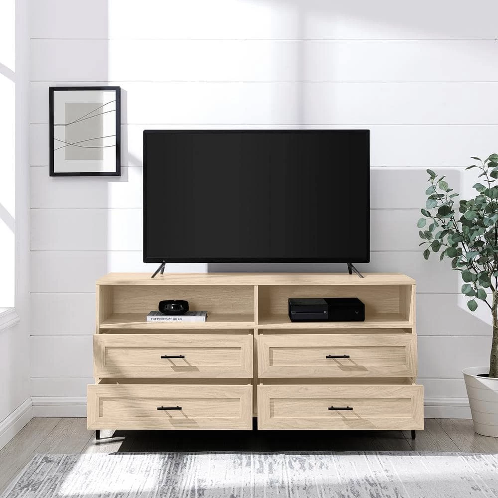 Movie nights have never felt more right than with your 60″ TV sitting atop this modern console. Cozy up and enjoy your favorite flicks with the spacious surface of this stand, while you have enough room to store all of your media consoles within the two open cubbies and four drawers. Put your display-worthy decor on debut within the open cubbies, or use them to house your media and feed your cables through the cord management ports for an ultra-clean look. With a modern build, minimalist black hardware, and a classic silhouette fit for storage, this TV stand will help your living room will look as instantly refreshed as you’ll feel after a good series binge sesh.