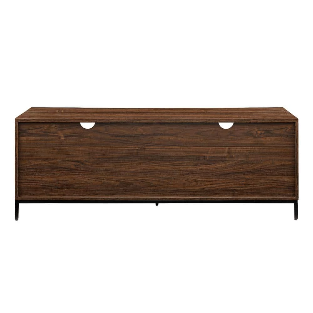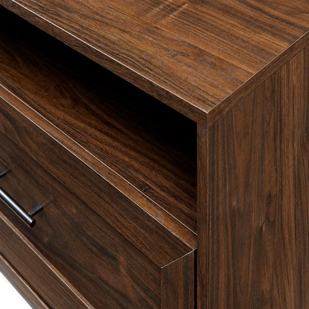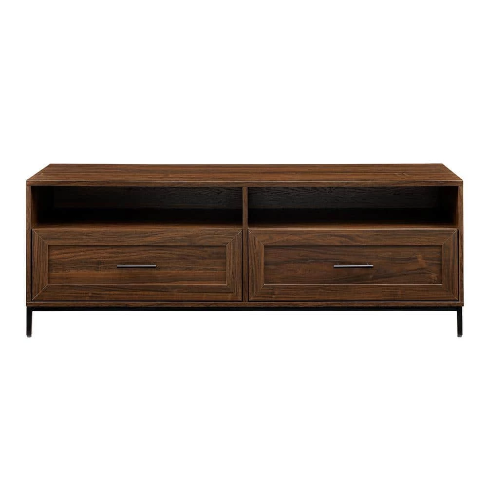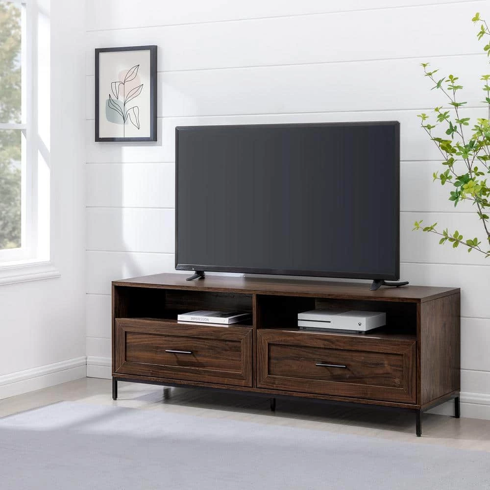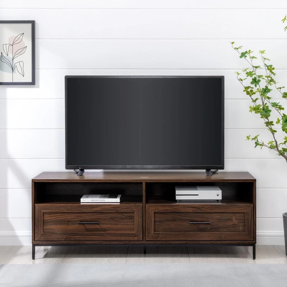 Movie nights have never felt more right than with your 60″ TV sitting atop this modern console. Cozy up and enjoy your favorite flicks with enough room to store all of your media consoles, DVDs, gaming systems, or streaming devices within the two open cubbies and two drawers. Put your display-worthy decor on debut within the open cubbies, or use them to house your media and feed your cables through the cord management ports for an ultra-clean look. With a modern build, minimalist black hardware, and a classic silhouette fit for storage, this TV stand will help your living room will look as instantly refreshed as you’ll feel after a good series binge sesh.