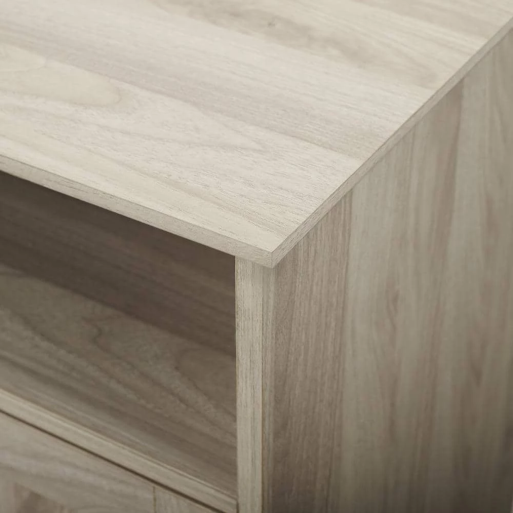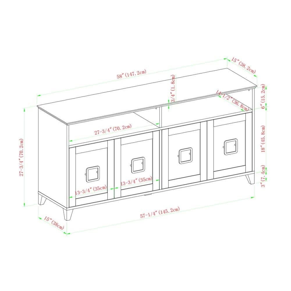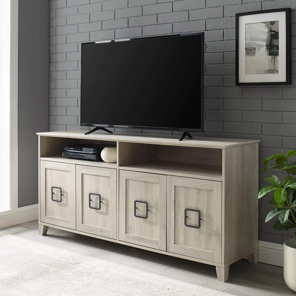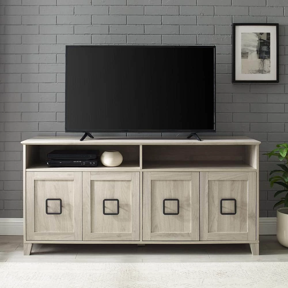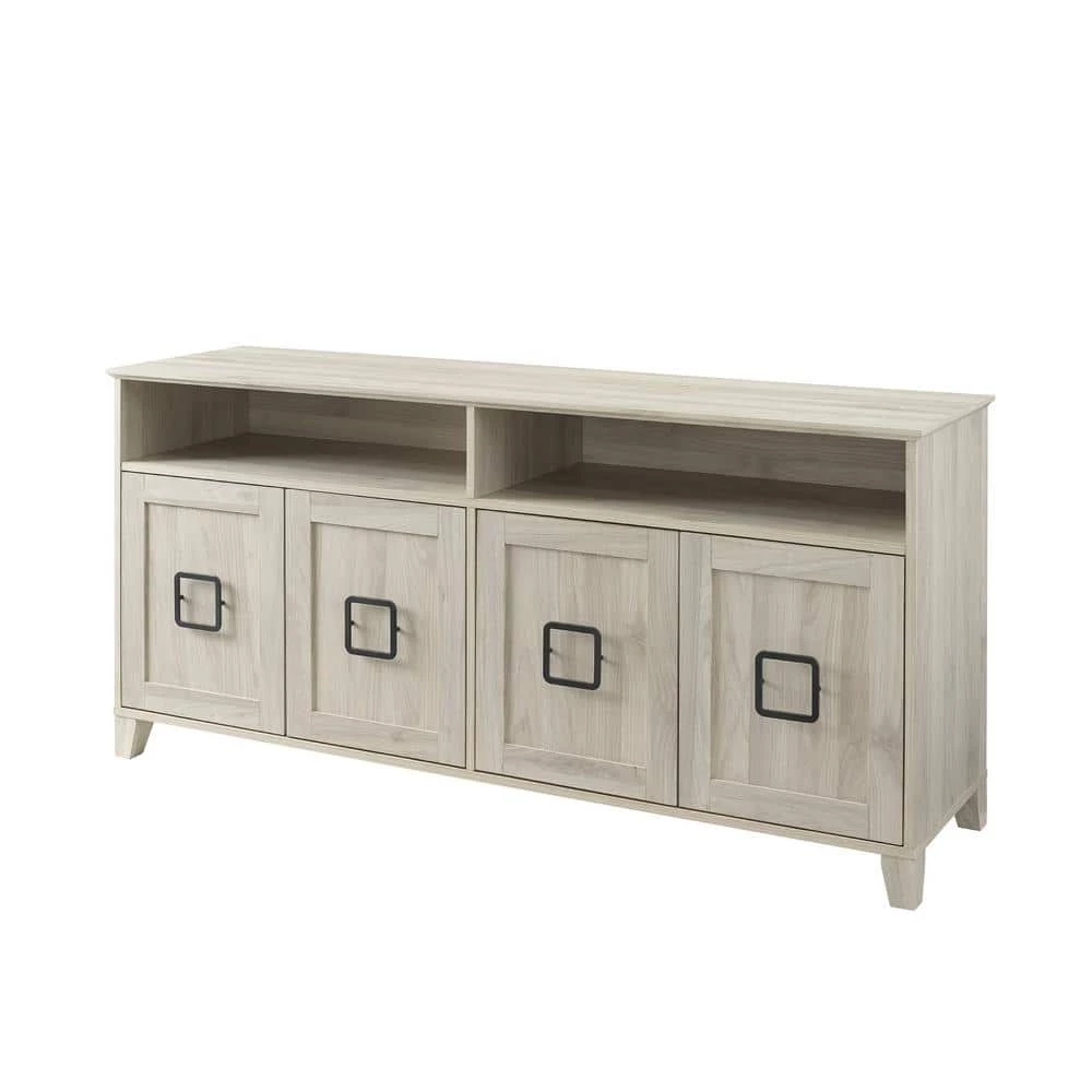 Modern and fresh, this contemporary media stand blends open and closed storage so you can make the most out of your entertainment experience. Cord management holes help organize your gaming consoles and DVD players in the open shelves while adjustable shelves behind closed doors mean you can cater to your storage wants and needs. Each of the four doors comes with adjustable soft close metal hinges and hip, square metal hardware. This entertainment center can accommodate TVs up to 65 in.