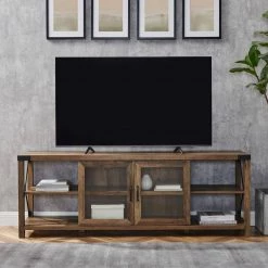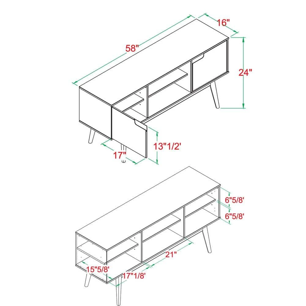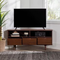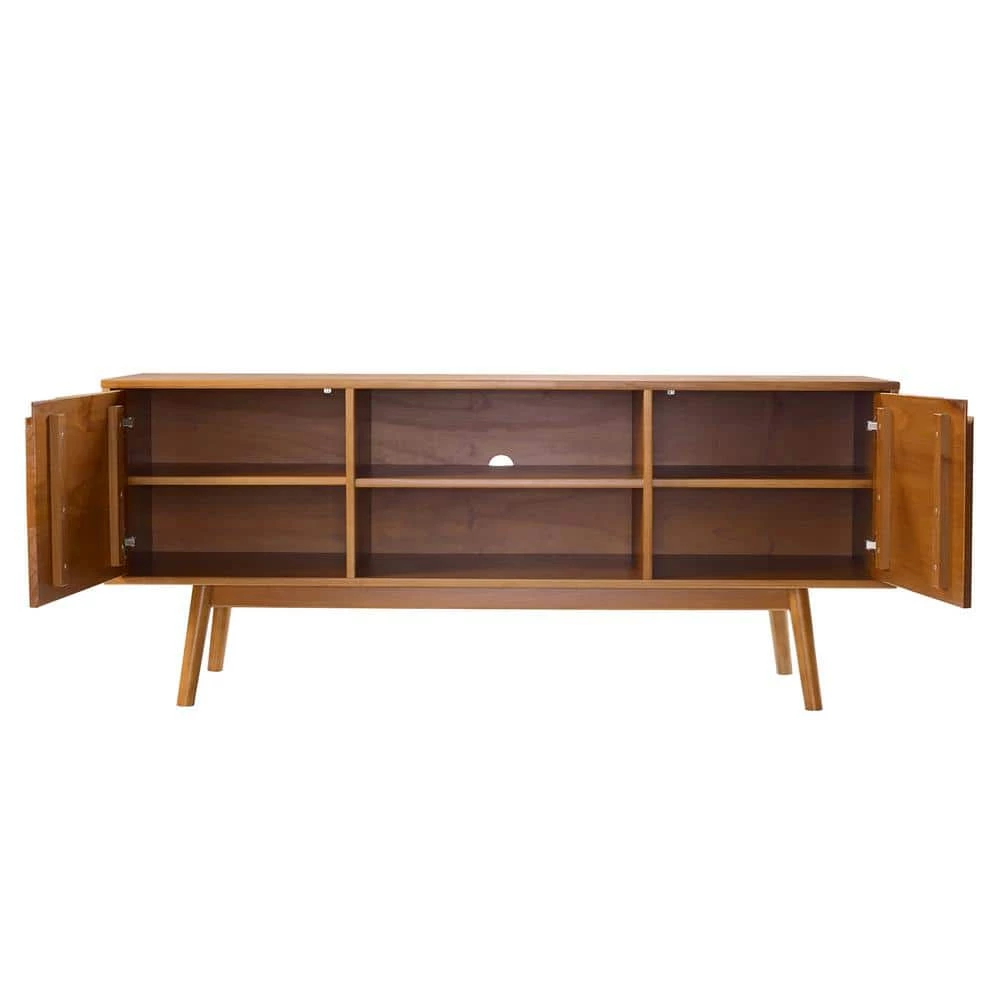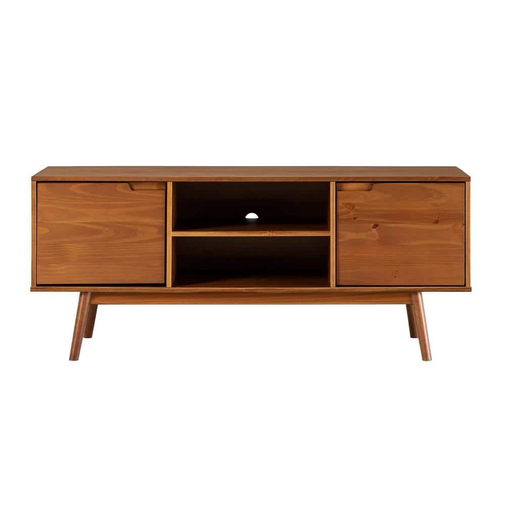 Gather your family around to watch your favorite throwbacks around this mid century modern TV stand. Cutout handles offer easy opening of the two doors with adjustable soft close hinges and provide a simple, modern aesthetic to your living room. Tapered angled legs enhance the entertainment console’s retro vibes. Make movie nights easier with media components on the two adjustable shelves or the center open fixed shelf. You’ll love the solid pine wood build because of its long-lasting quality.