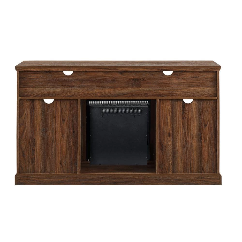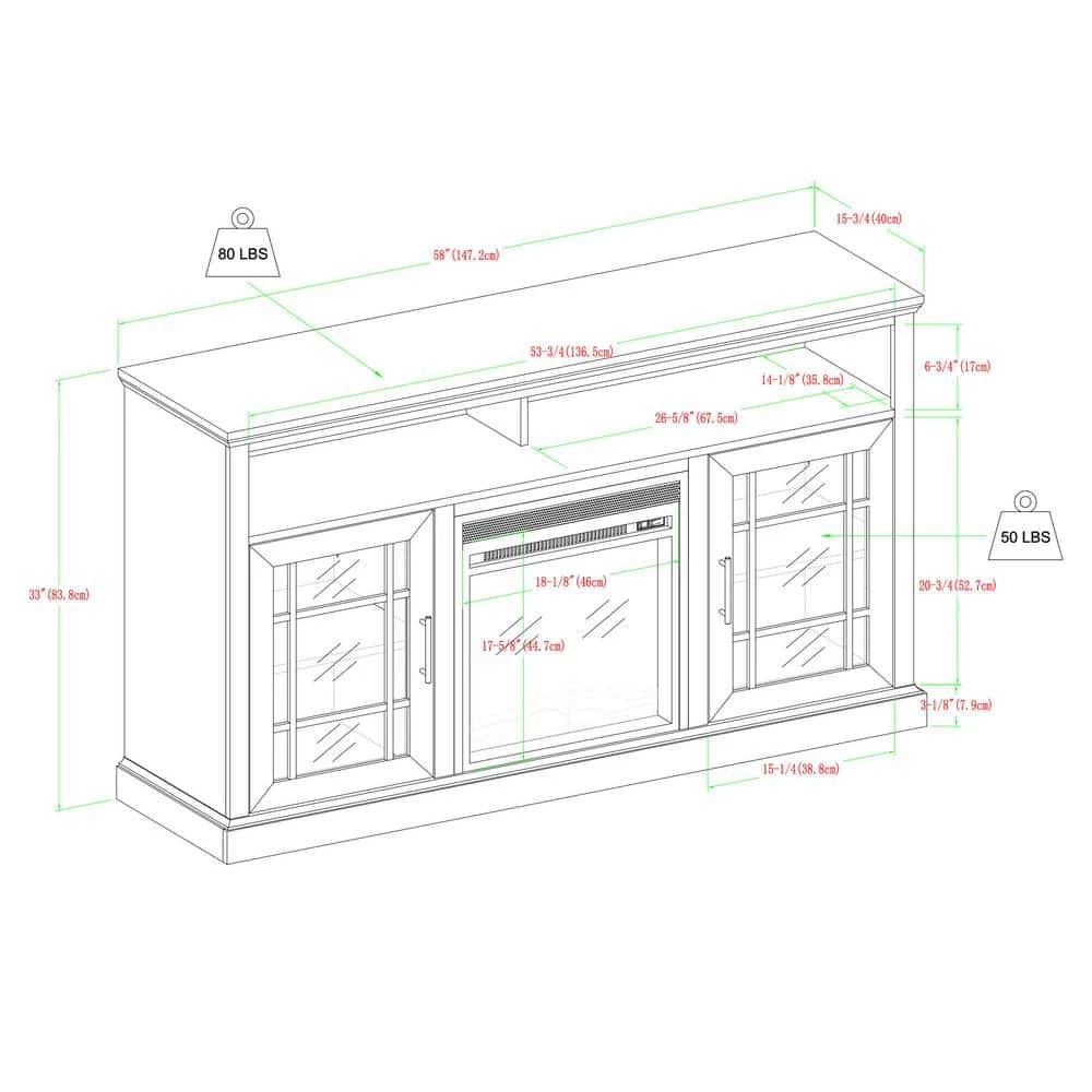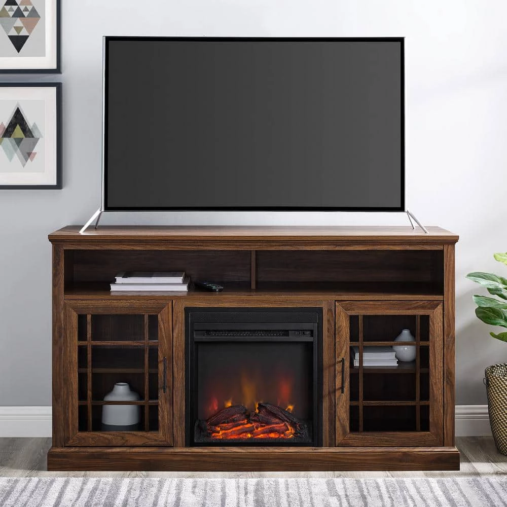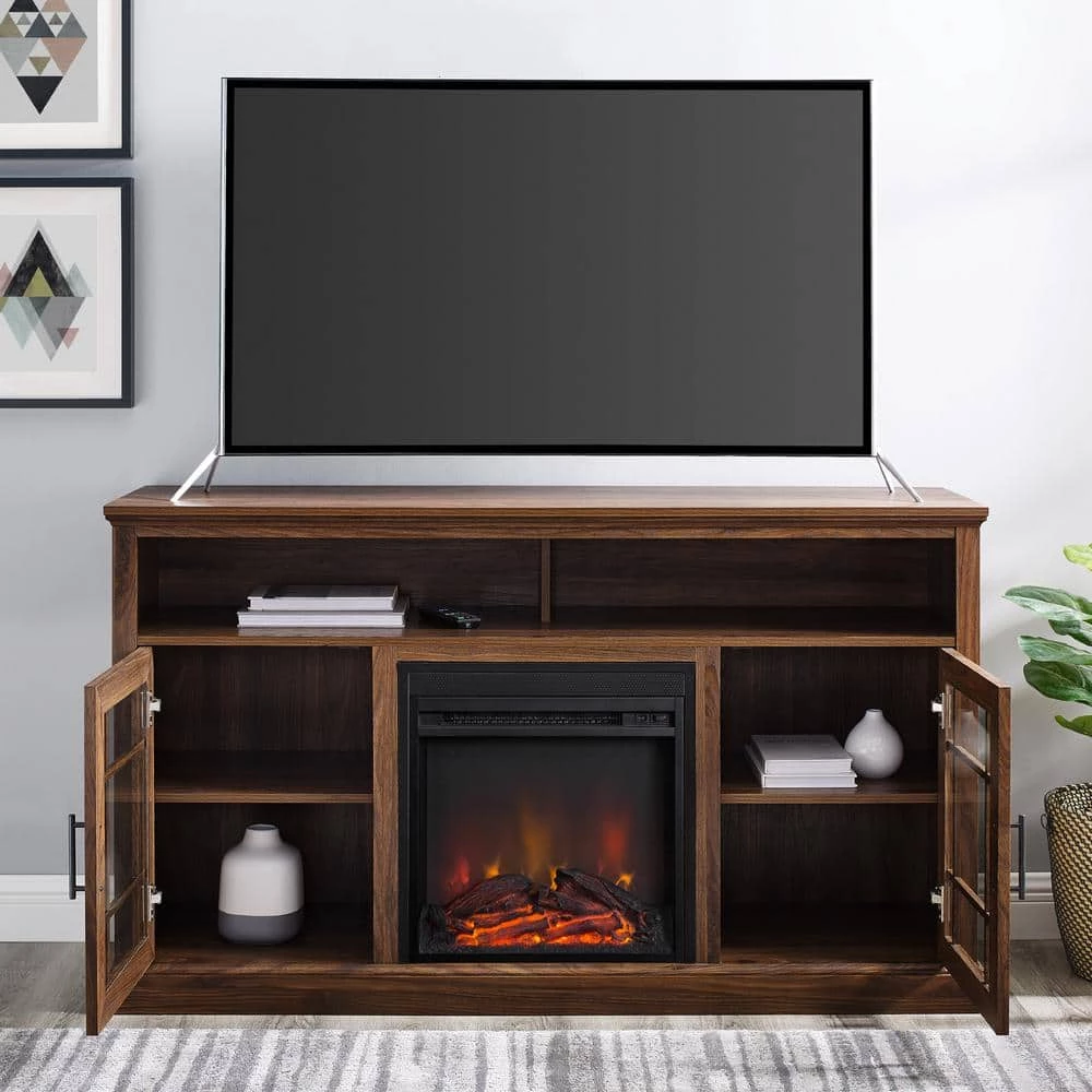 Transport your living room into your favorite action or romance films with the help of this transitional fireplace TV stand. No matter what movie you pop onto your TV, guests are enthralled in the ambiance created by the dancing LED flames of the fireplace. Turn on the heat using one switch during the cold, winter months, and use a second switch to turn the flames on or off. The tempered glass doors bring family photos to life with their wood window accents. Two open cubbies are compatible with a sound bar.