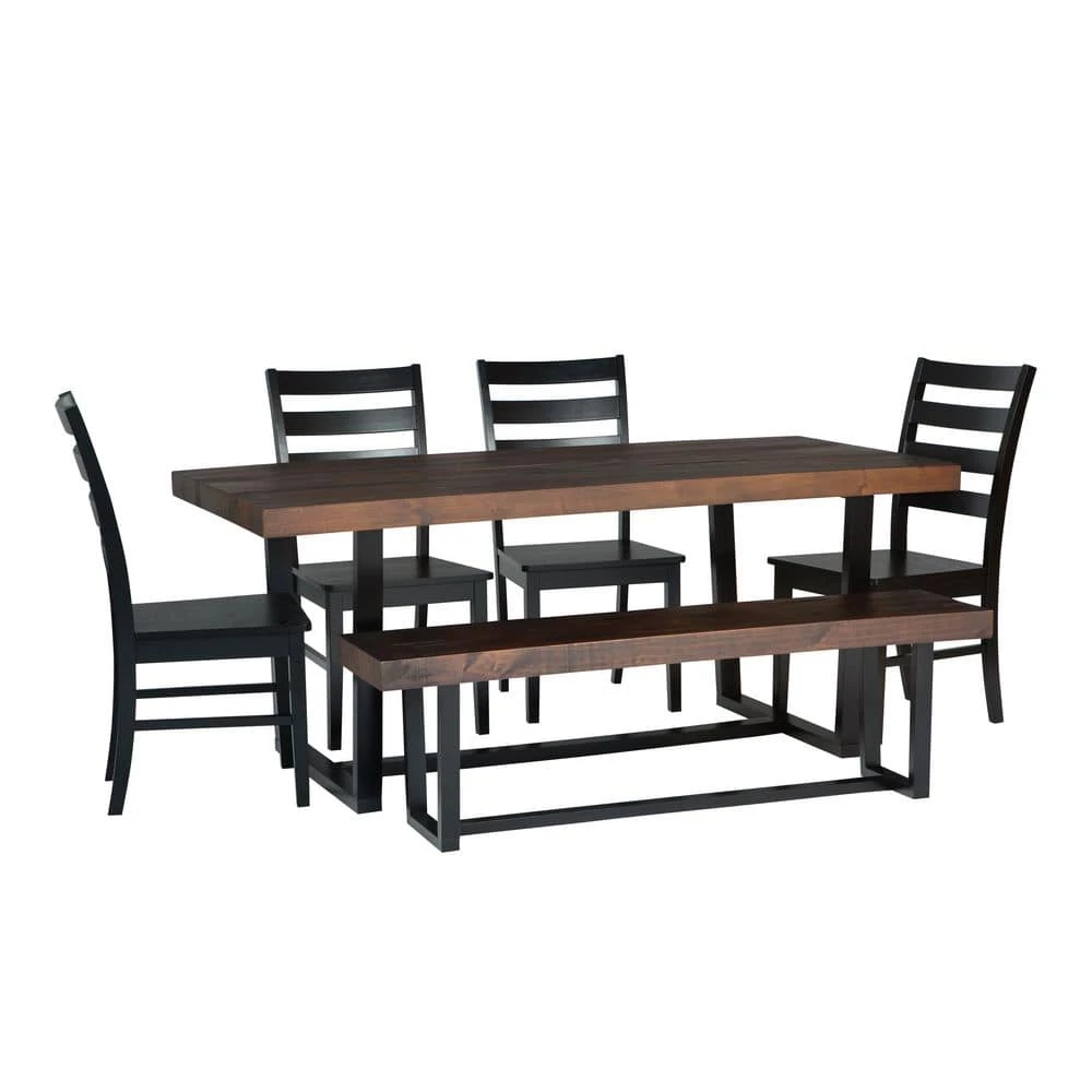 Introduce this 6-piece dining set into your kitchen or dining area to enjoy meals together as a family. This table set features a beautiful 2-tone design, with the chairs, bench legs, and table legs all in a black finish and the distressed table top and bench top of grey. The wood of the table is responsibly harvested from renewable resources for a stylish and sustainable piece. Including 4 chairs, each having a slatted back design for an overall timeless and farmhouse style. You’ll love the way this kitchen set will complete your home by providing seating area for daily use. This set includes 4 chairs, 1 bench, and a dining table.