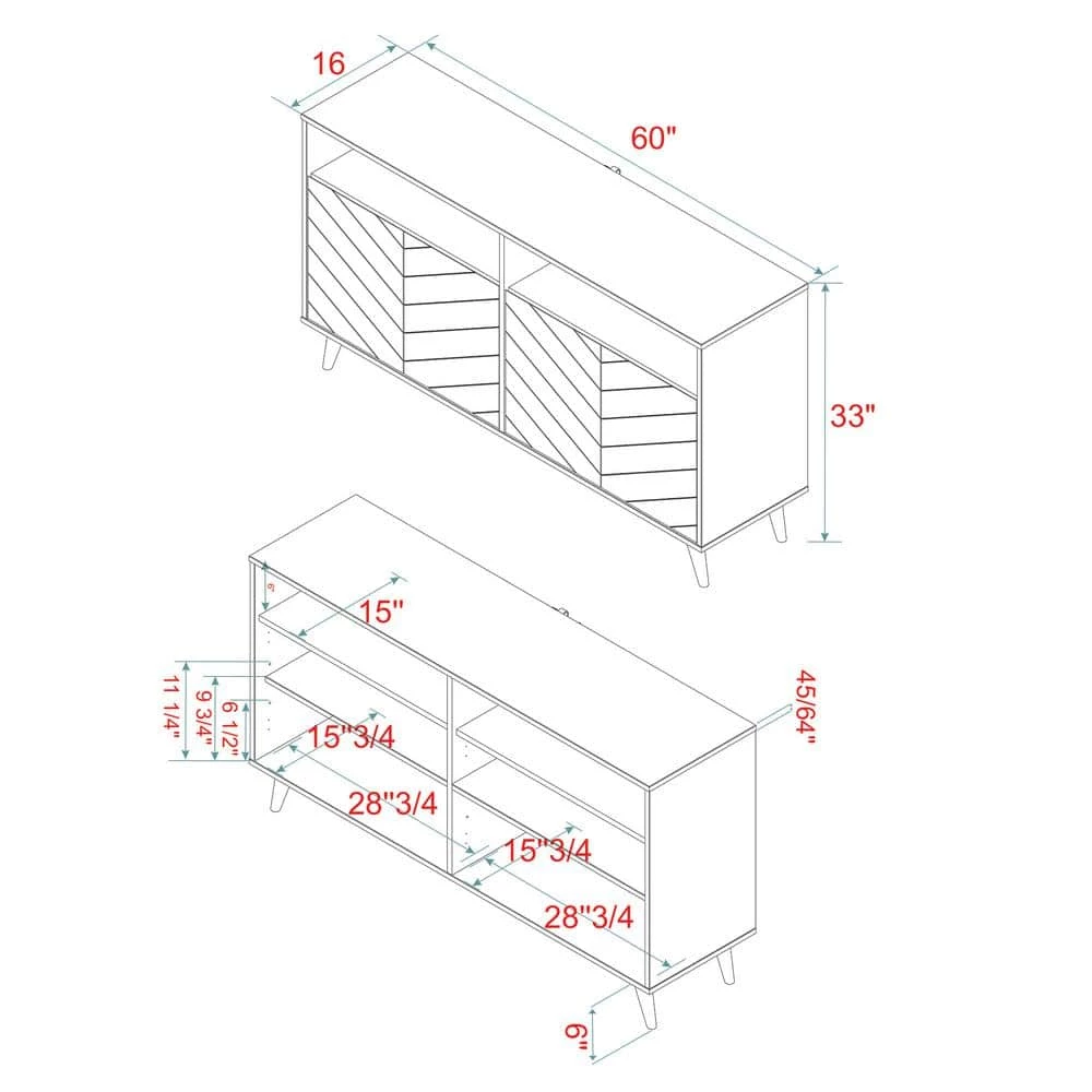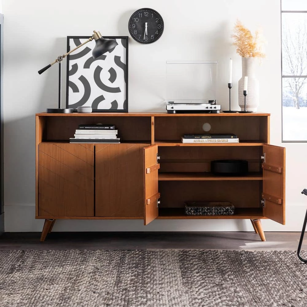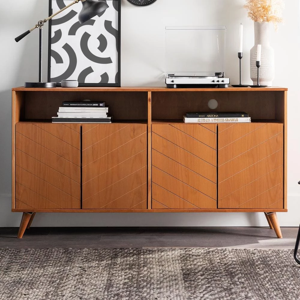 Emphasize your eclectic vibe and create a laid-back living room with this modern boho TV stand. The chevron grooved doors and natural finish provide an atmosphere that will have guests relaxing during game night or watch parties. Hide movies or blankets behind the four doors with soft close hinges to make hosting easy. And you won’t have to worry about clutter because of the cord management ports keep cables tidy. The solid pine wood construction creates a durable media console you can count on.