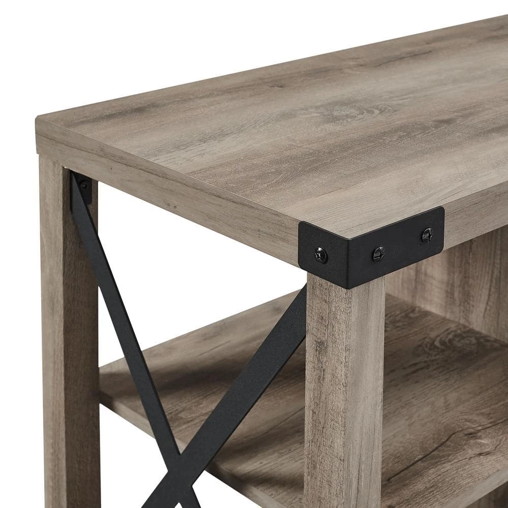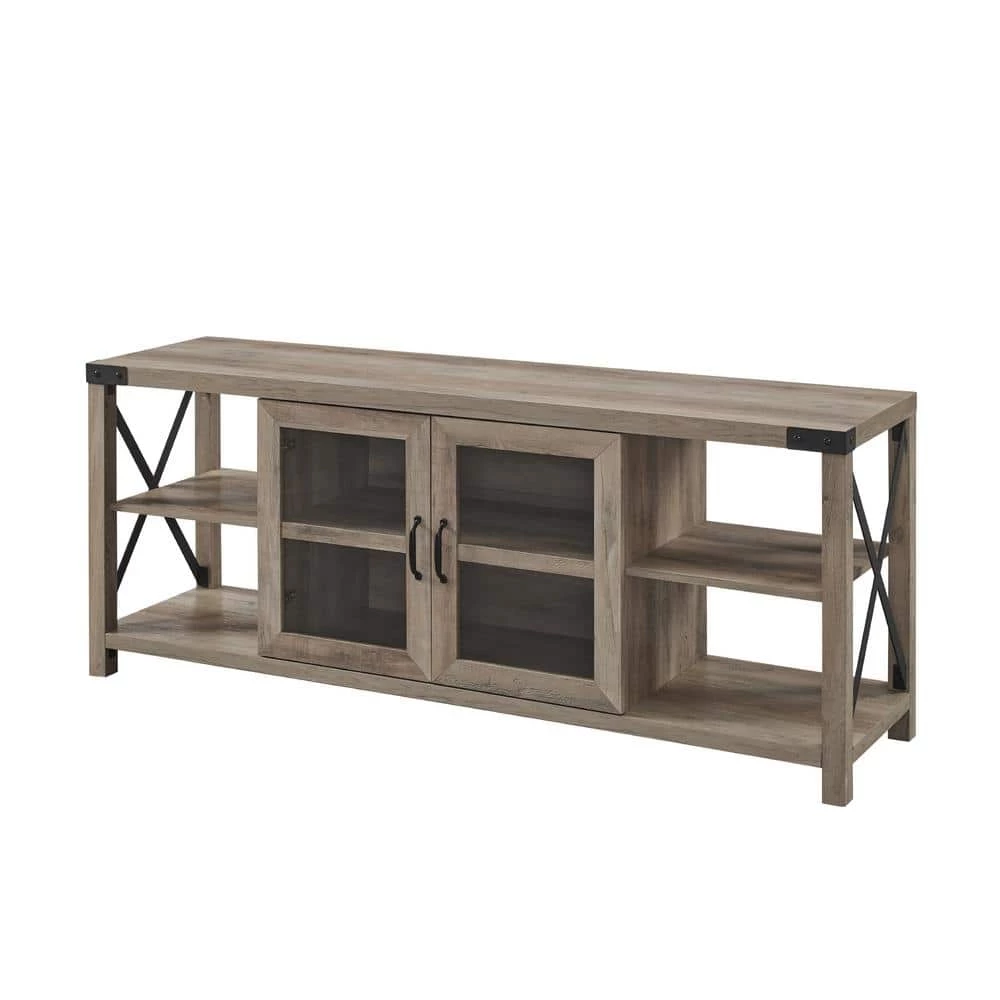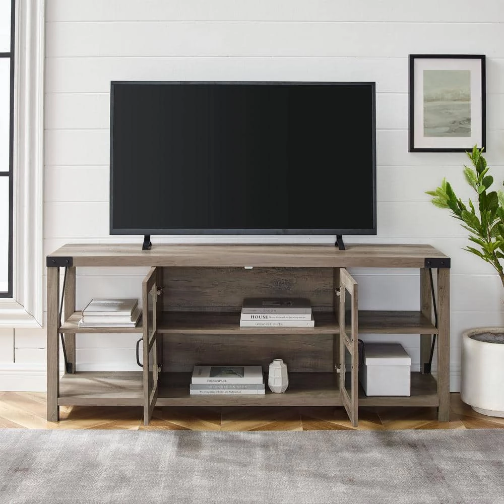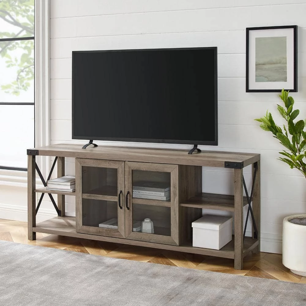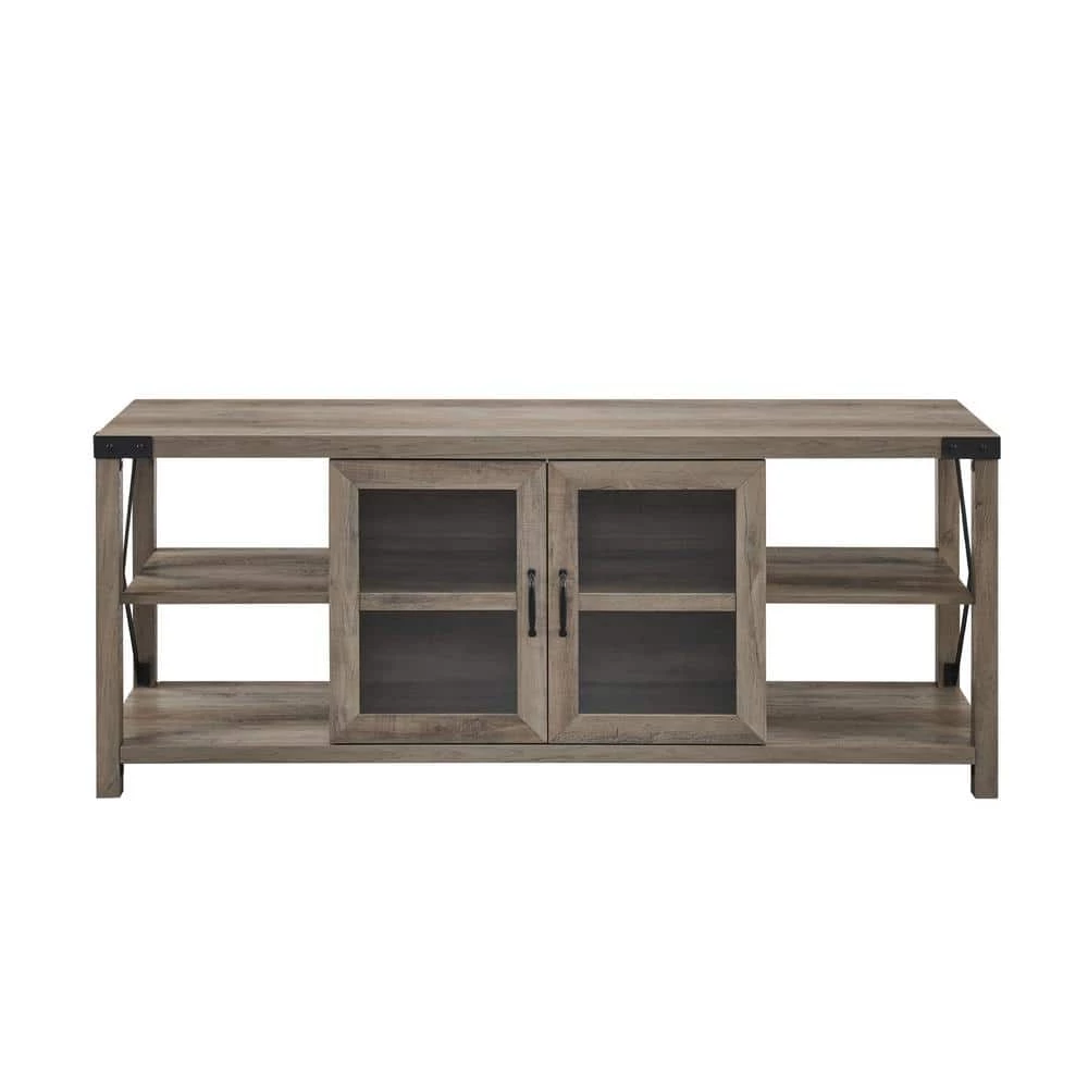 Find the ideal entertainment unit at the intersection between style and functionality with this metal x 60-inch TV console. Putting an industrial spin on the farmhouse design trend this media console features open and closed storage thats framed with exposed metal accents on the sides and top corners of the piece. Behind the tempered glass front doors with soft close hinges are adjustable shelves. The side shelves are fixed. This media stand features cord management options and can accommodate TVs up to 68-inches.