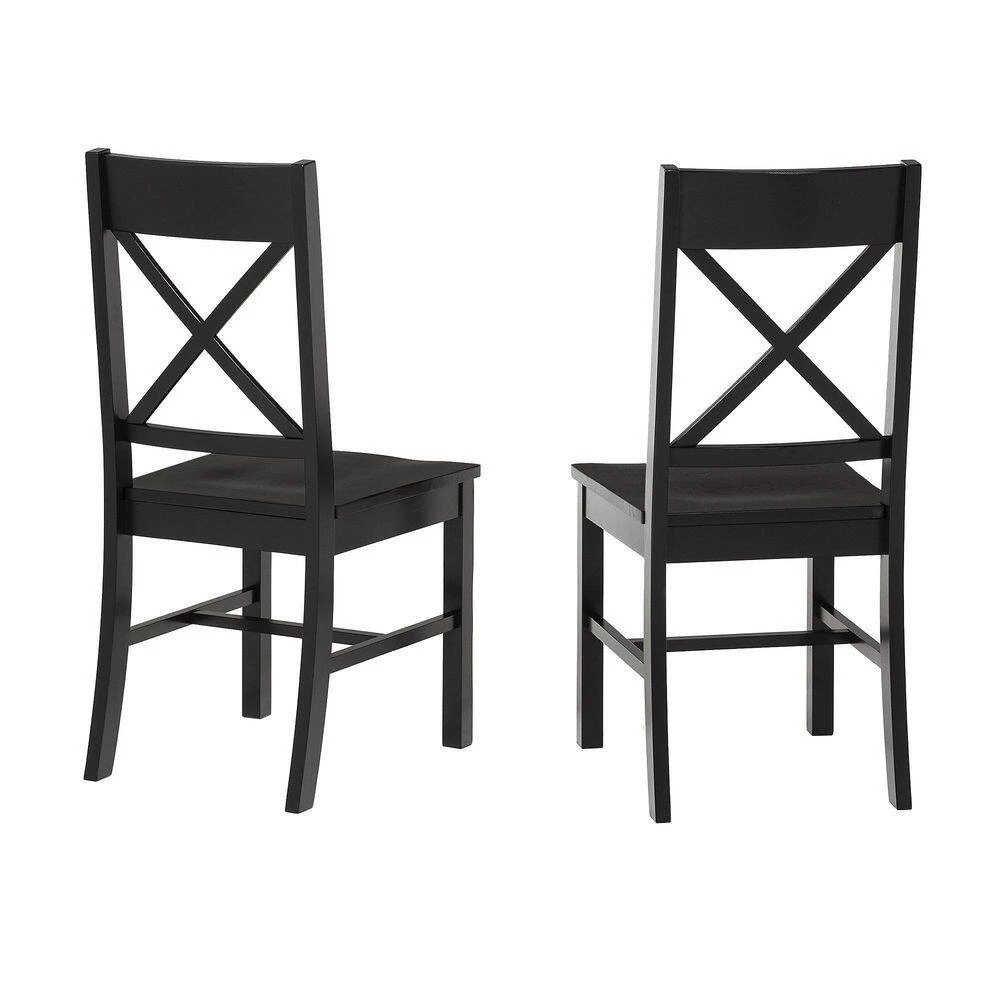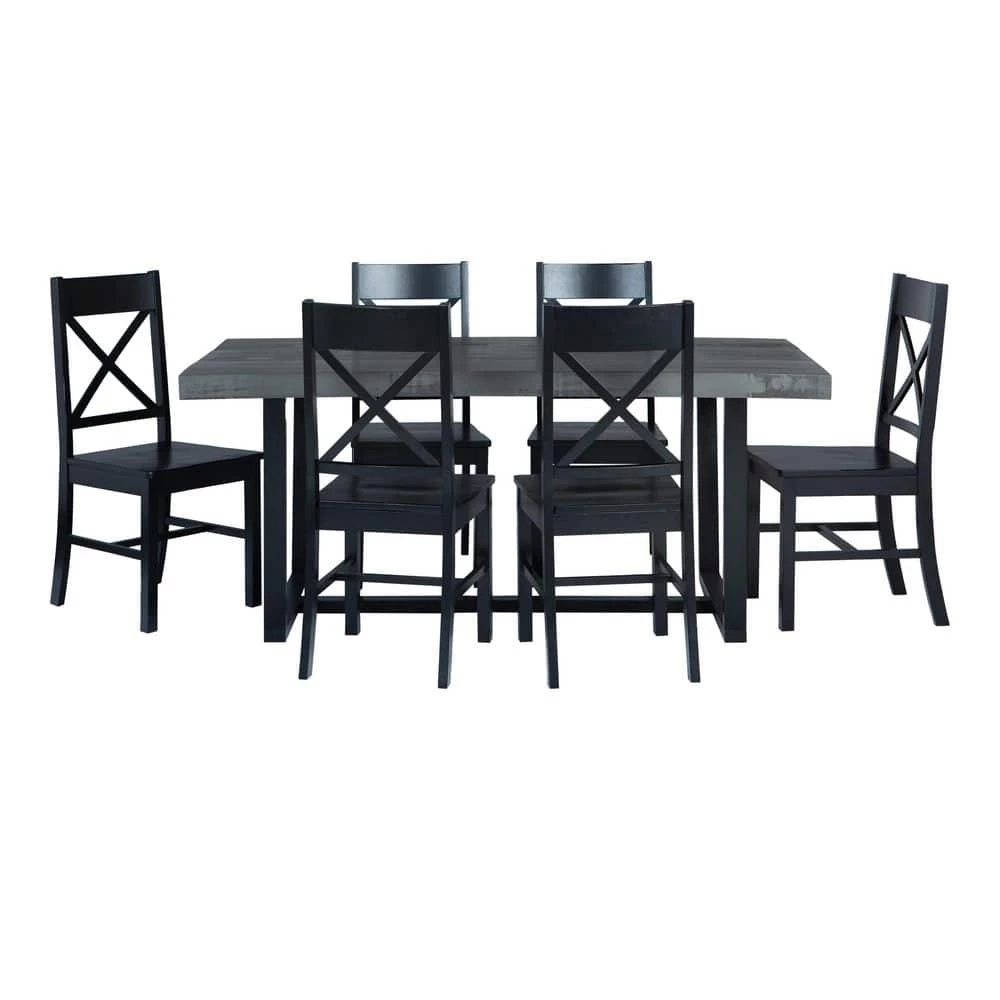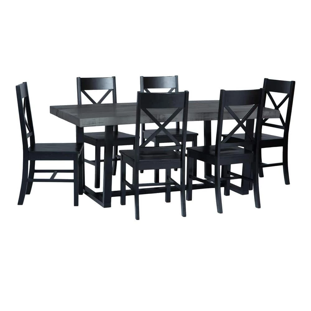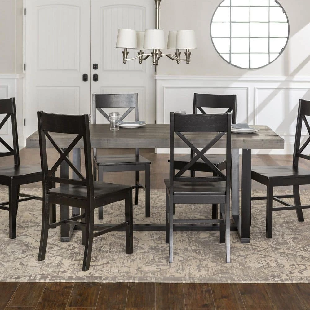 Complete your dining room or kitchen with this 5-piece farmhouse dining set. This table set features a distressed table top that is responsibly harvested for a sustainable addition to the design. With x-back chairs and a table in a 2-tone finish, this dining set has a rustic, modern farmhouse appeal made of warp-resistant MDF, solid pine wood, and wood veneer. Spend time with your family more often around the table for mealtime. This set includes dining table and 4 dining chairs.