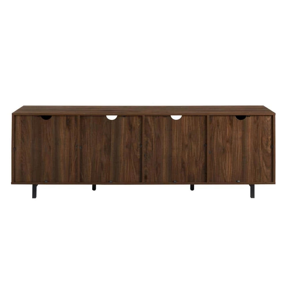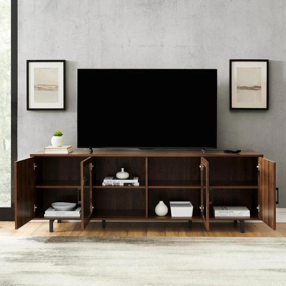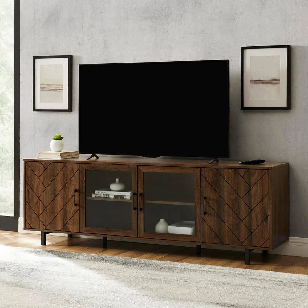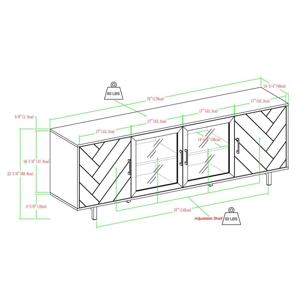 Create a relaxed, sophisticated vibe in your living room with this boho TV stand. The attractive herringbone doors provide a safe place to tuck clutter, movies and blankets out of sight. Display an impressive gaming system or family photos behind the two tempered safety glass doors. Four adjustable shelves provide an easy way to make sure your prized possessions fit within the sturdy frame. Made from warp-resistant MDF wood, durable laminate and powder-coated steel, this strong entertainment stand is built to last.