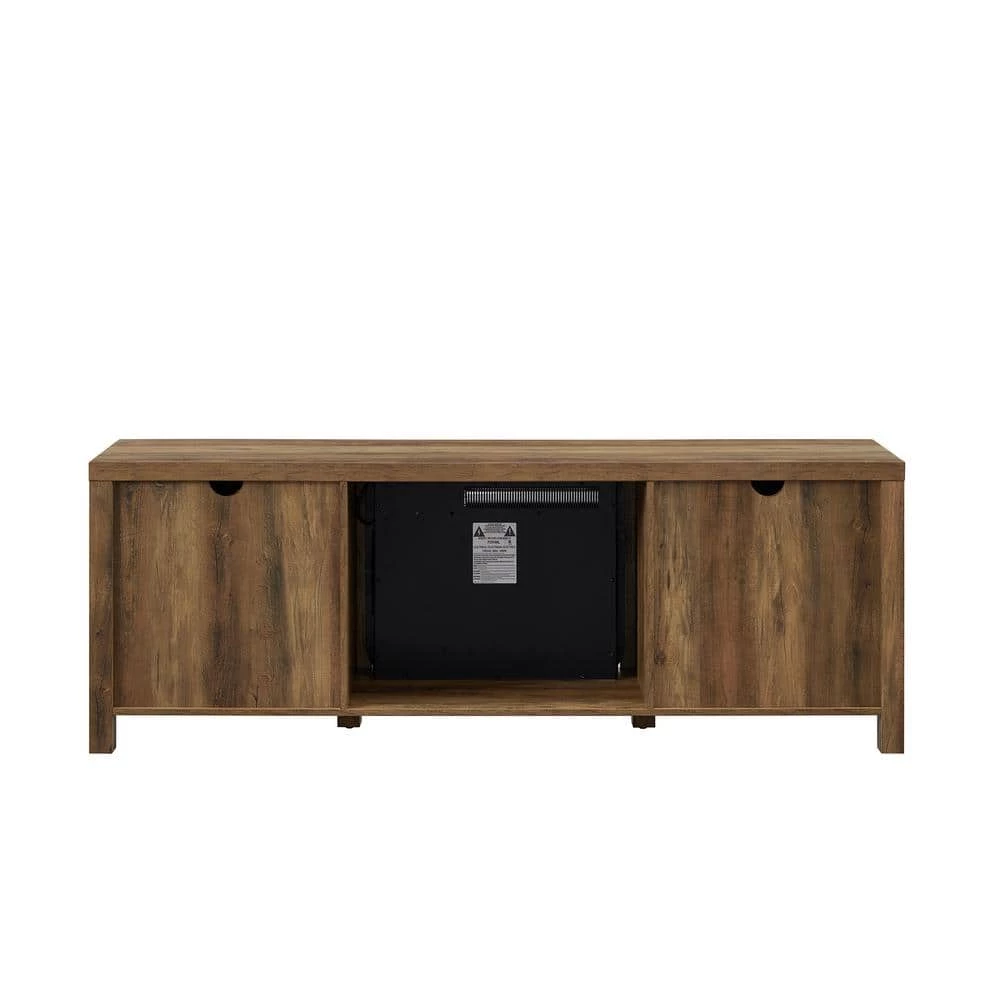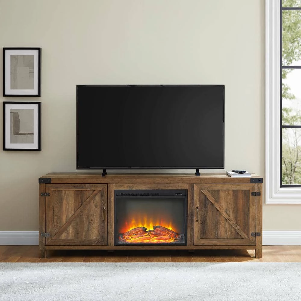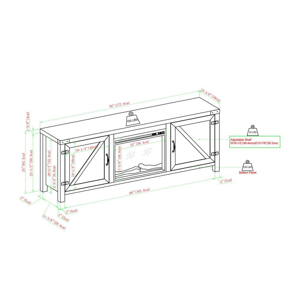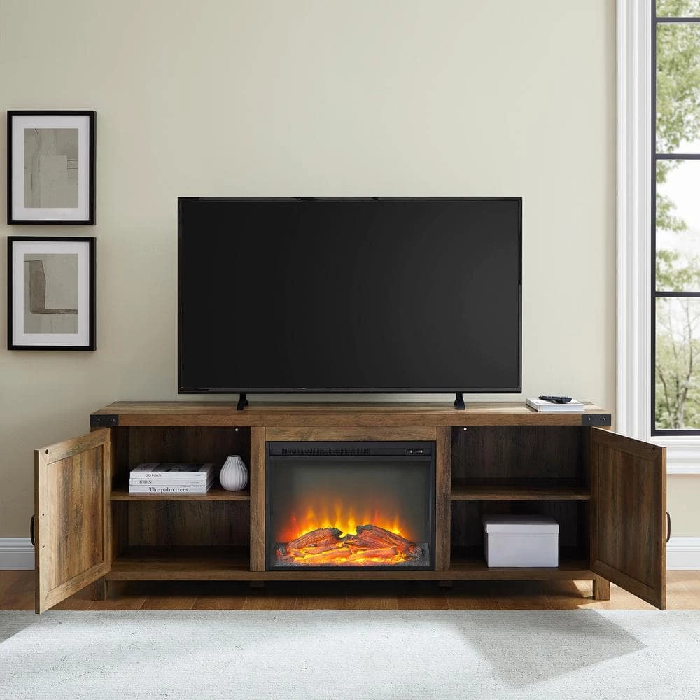 Charm your movie night guests and treat yourself to cozy nights in with this farmhouse inspired fireplace TV stand. Barn doors set an aesthetic akin to traditional, rustic cabin interiors, while antique metal accents lend a hint of modernism to the console. Introduce your personality to your interior style and customize the 2 adjustable shelves to house your memorabilia and keepsakes. Its featured electric fireplace will single-handedly set the tone for classic comfort. Embrace the warmth and keep the heat and flames on simultaneously, or take advantage of the 2 separate switches to enjoy 1 or the other.