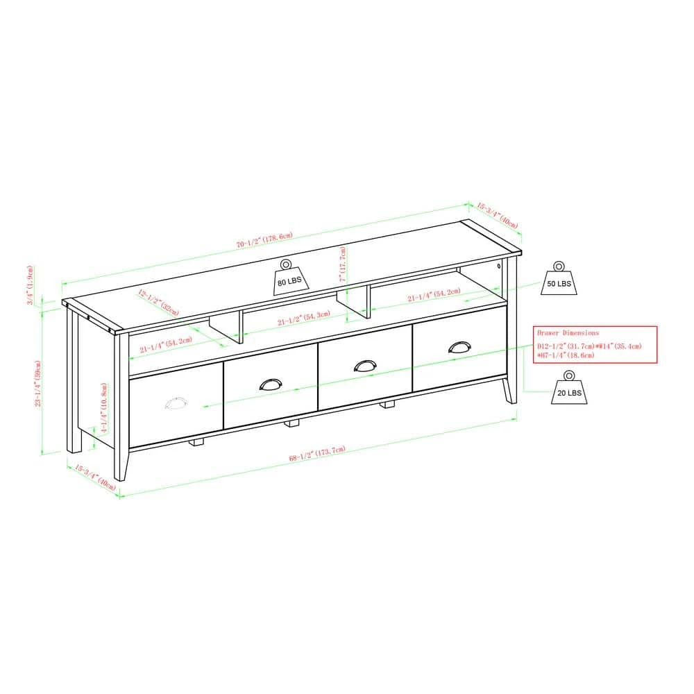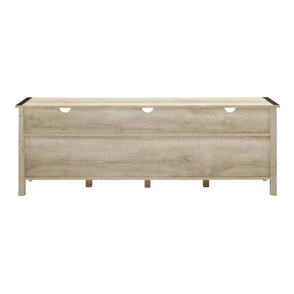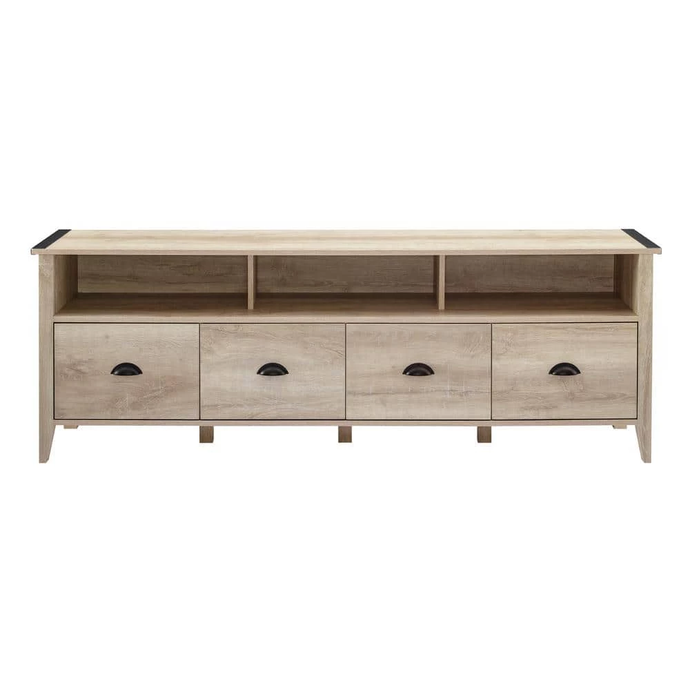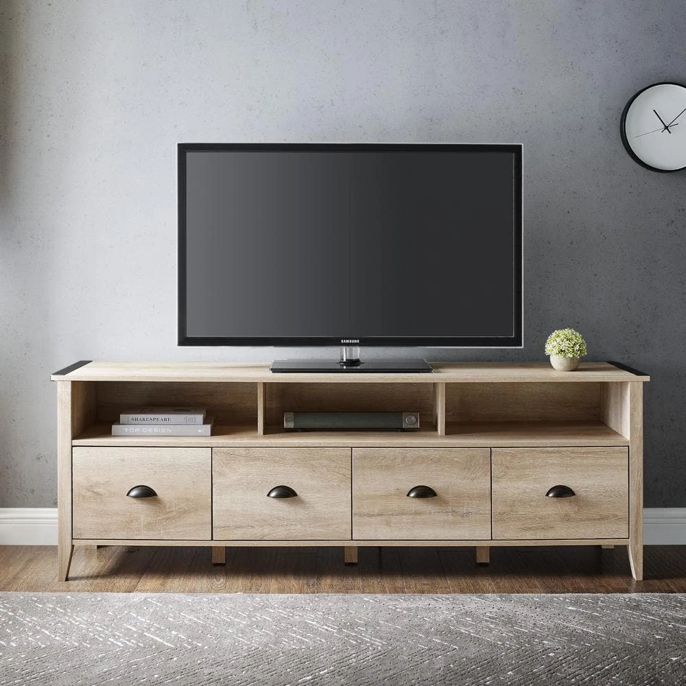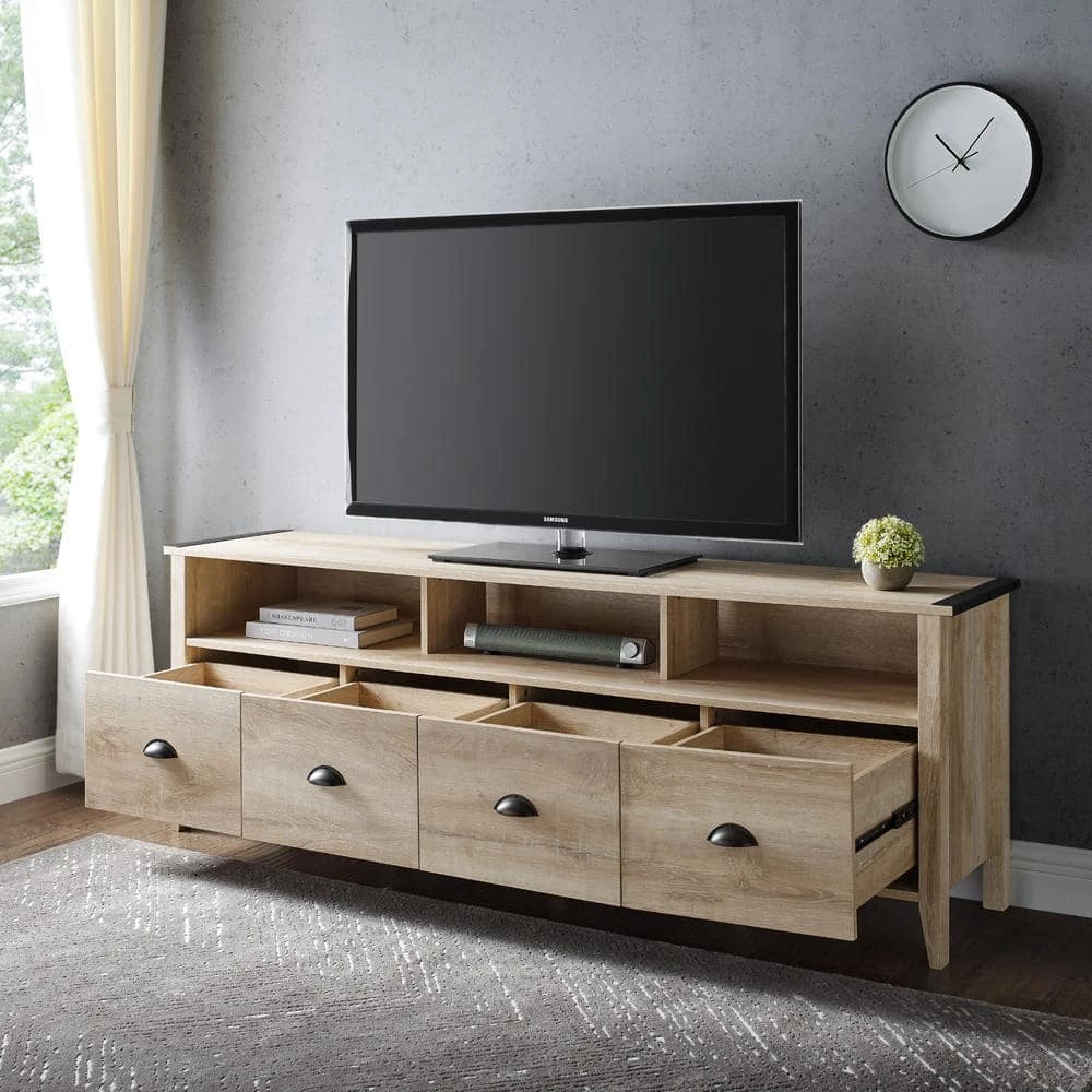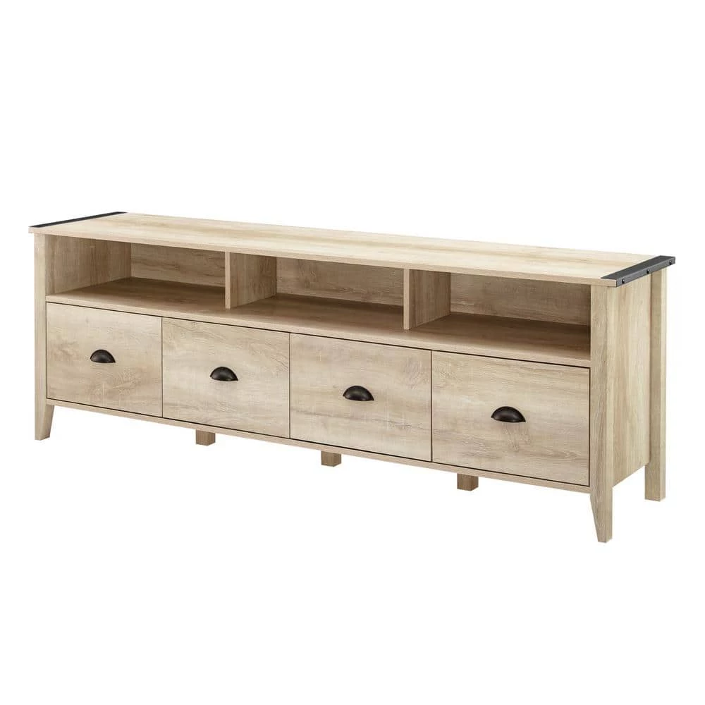 Cozy up with a chunky knit blanket and your go-to movie night snack to watch your favorite flick as your TV rests on or above this farmhouse-inspired TV stand. 3 cord management ports make this the perfect piece for your ultimate home entertainment center as you set up your TV, DVD player, gaming consoles and streaming devices free from tangled wires. The rustic air of the wood finish and industrial flair of the antiqued gunmetal handles create a unique look that works perfectly in your living room, dining room or entryway. With open and closed storage, you can easily transform this piece into a credenza, sideboard or media console.