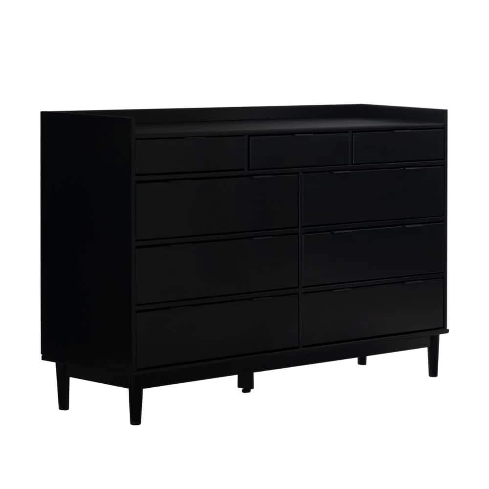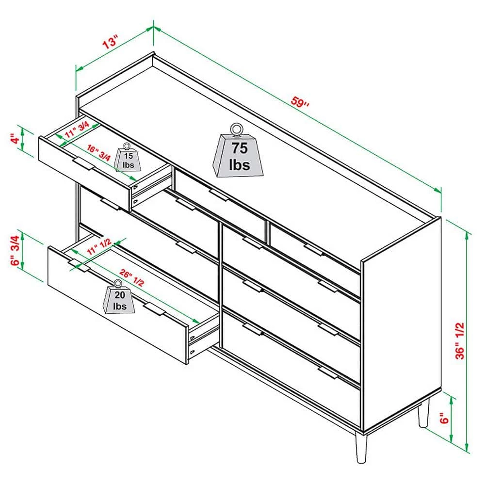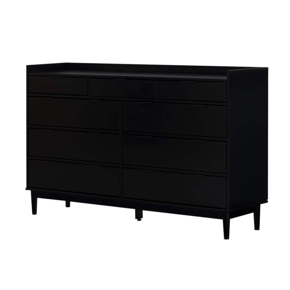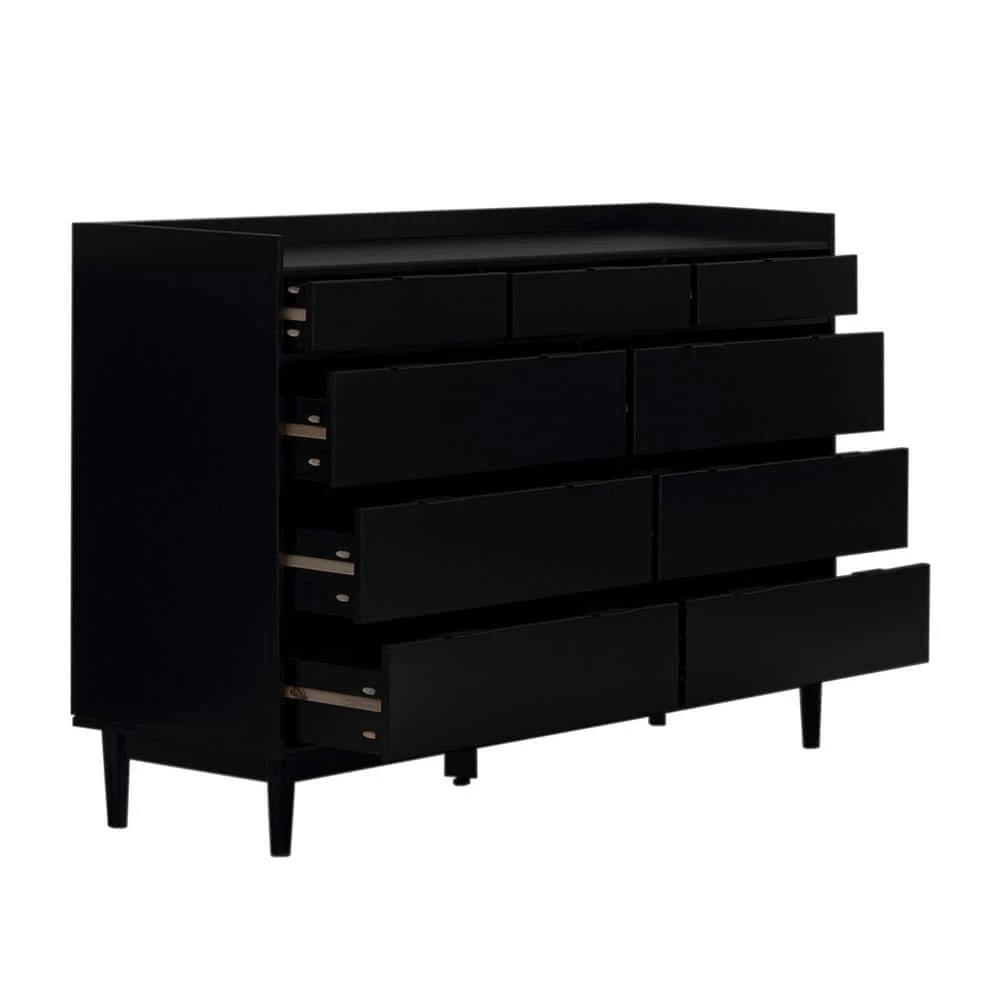 Spacious, sturdy, and sustainably stylish, this solid wood dresser will effortlessly evoke a sense of classic elegance into your space. Embrace a mid-century modern aesthetic with its gallery top and tapered wood legs, while sleek metal drawer pulls impart a subtle modern motif. Harbor your wardrobe within its four spacious drawers and leave room for socks and other bits and bobs with the two accent drawers on top. This piece pairs perfectly with the matching nightstands for a timeless take on contemporary interiors that’s sure to make coming home to your personal sanctuary your favorite part of the day.