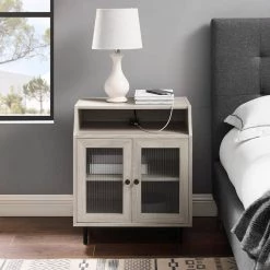 Birch Wood and Fluted Glass 2-Door Nightstand with Mountable USB Port by Welwick Designs