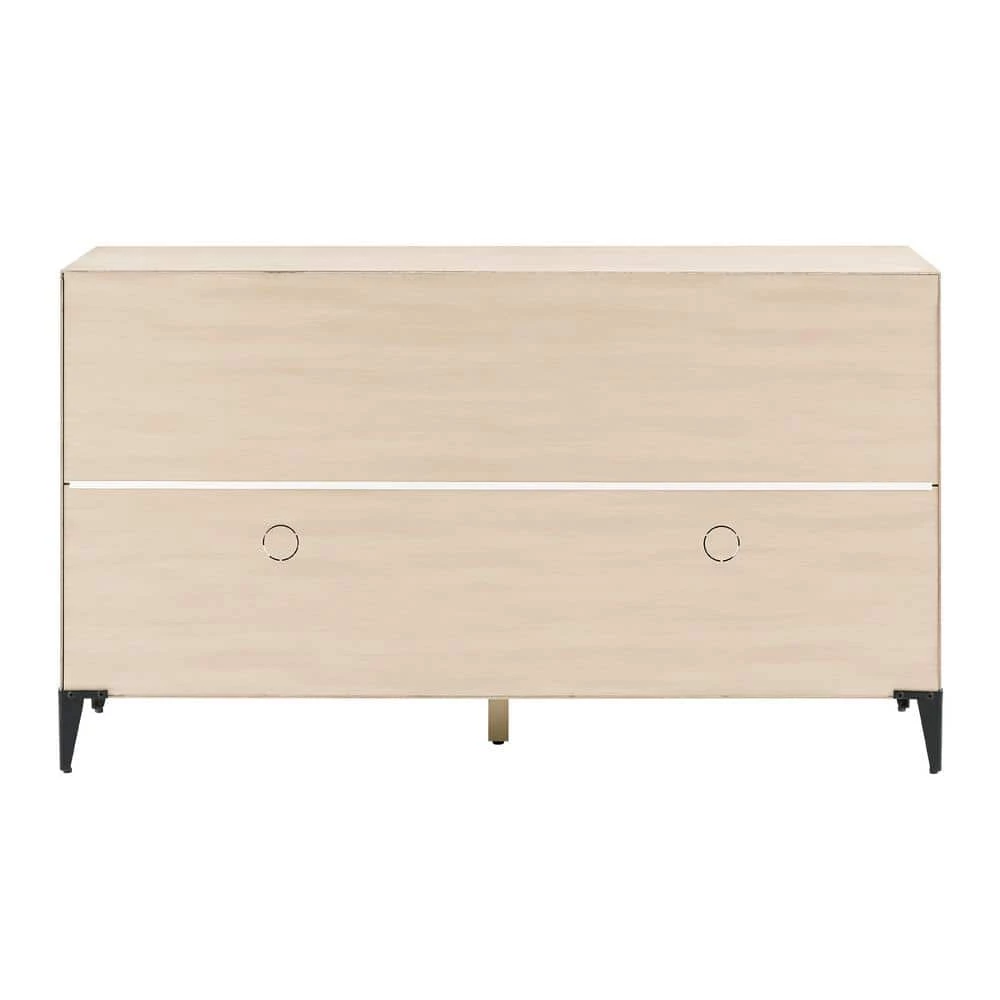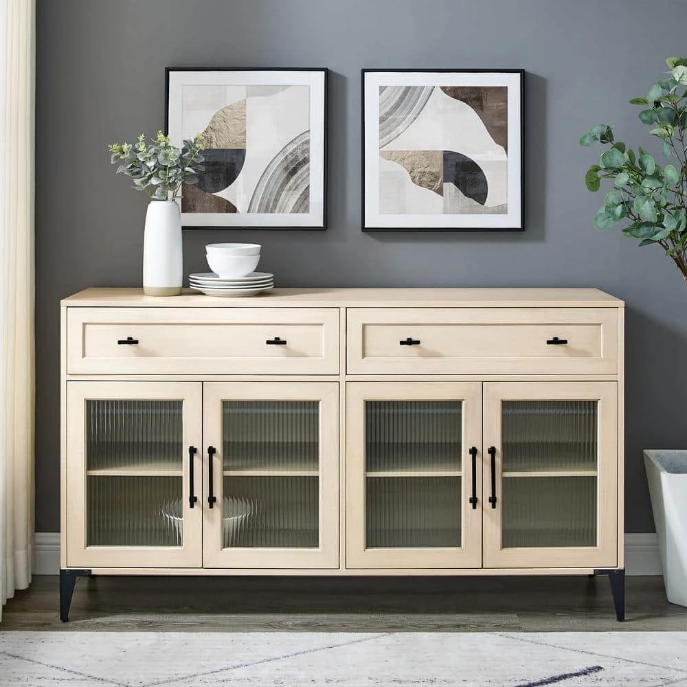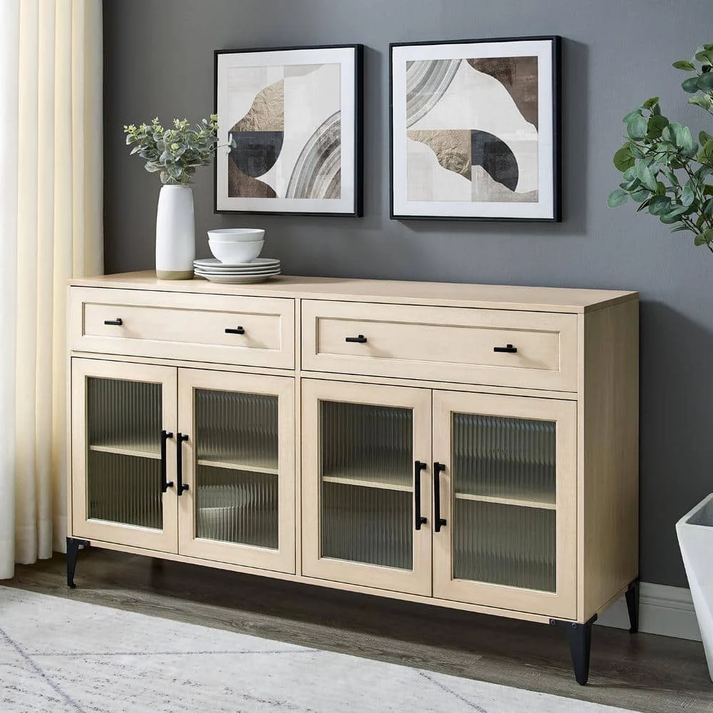 This transitional sideboard is a timeless console for storage-savvy decorators. With influences of contemporary, traditional, and industrial styles, it adapts seamlessly into any living room. 2-wide drawers float open on smooth, telescoping metal glides to reveal a new home for place mats or mail. 2-sets of double doors with clear, fluted tempered safety glass fronts give you a peek at what’s placed on the 2-adjustable shelves within. The textured doors, natural wood veneer finish, and angle-iron legs harmoniously add dimension to your space, while the neat, symmetrical build satisfies that orderly side in all of us.