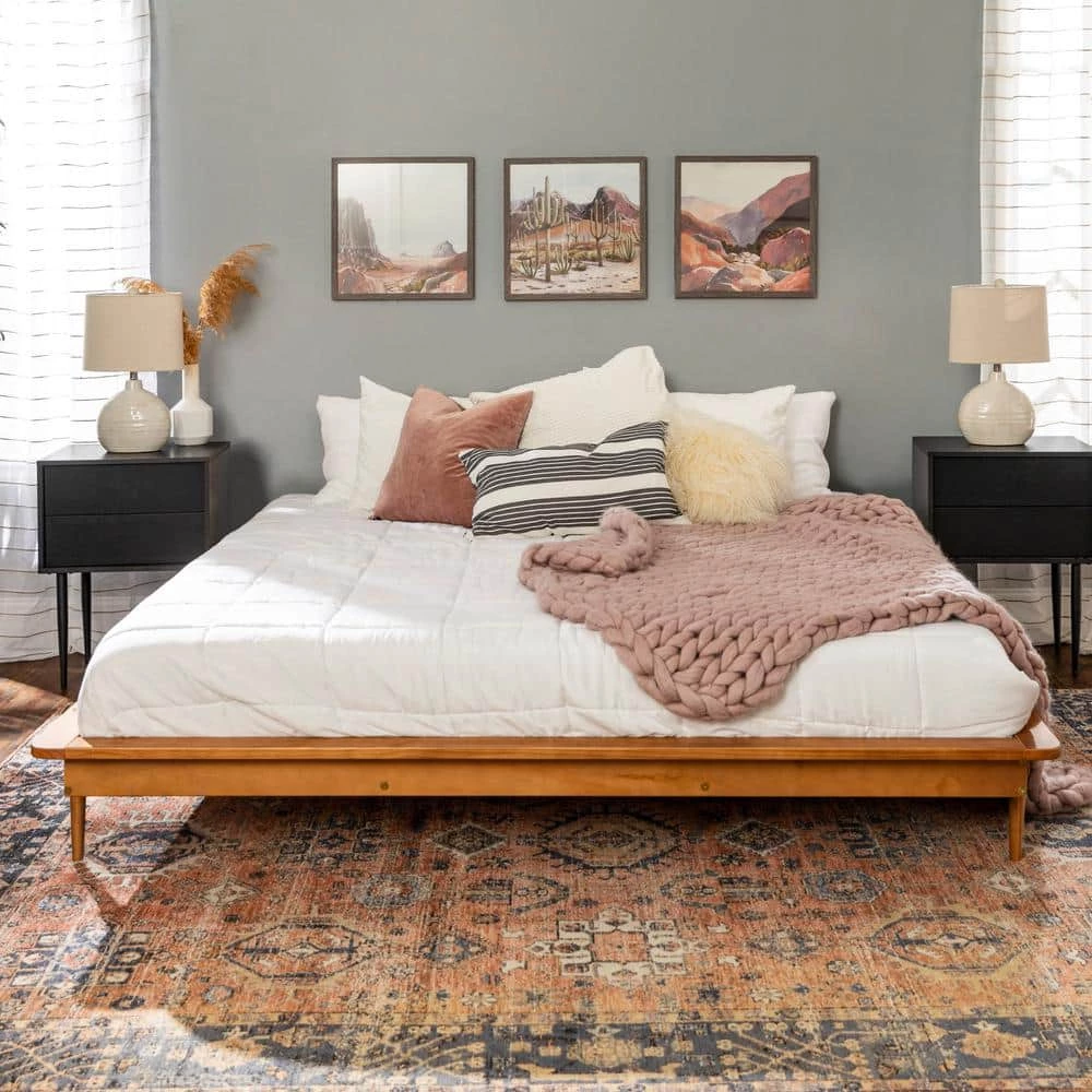 Drift away in your boho bedroom with this mid century modern bedframe. The tapered legs inspire dreams of nostalgic dances and nights spent at the soda shop. Spend your nights sleeping soundly on the sturdy solid wood frame. And this affordable bedframe does not require a box spring underneath your mattress because of the reliable wood slats. If you want to continue your bohemian fantasies, check out the matching mid century modern king headboard.