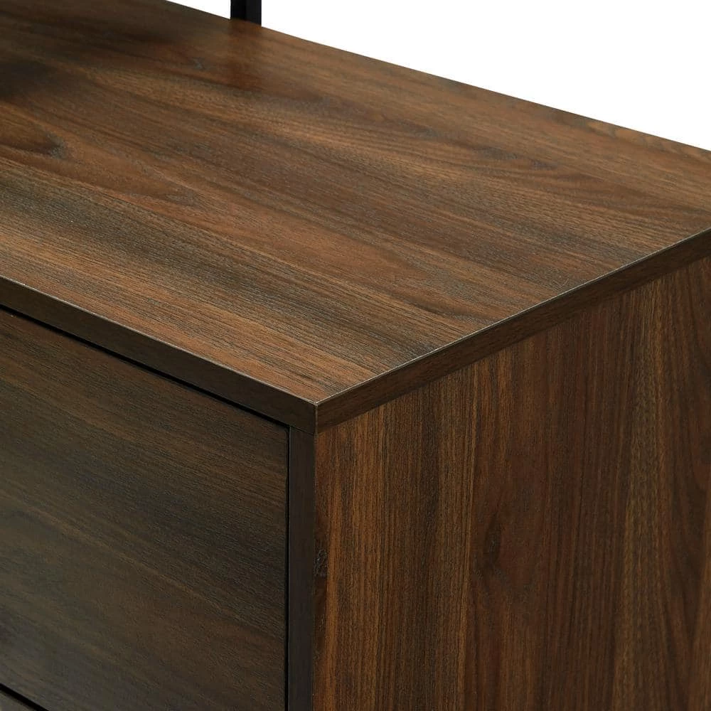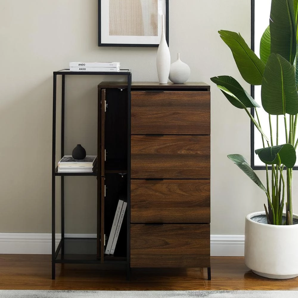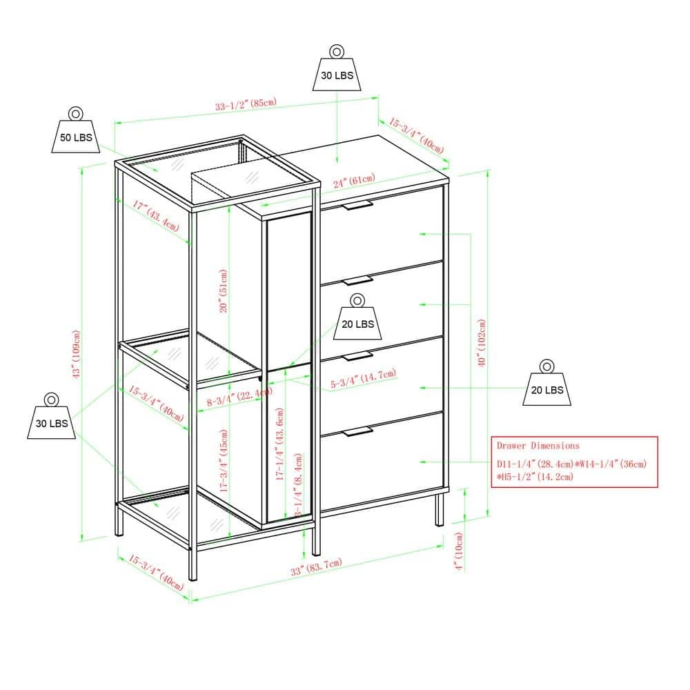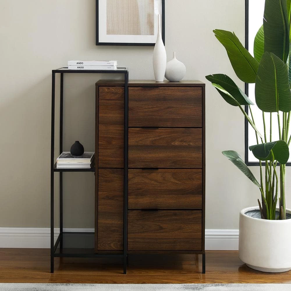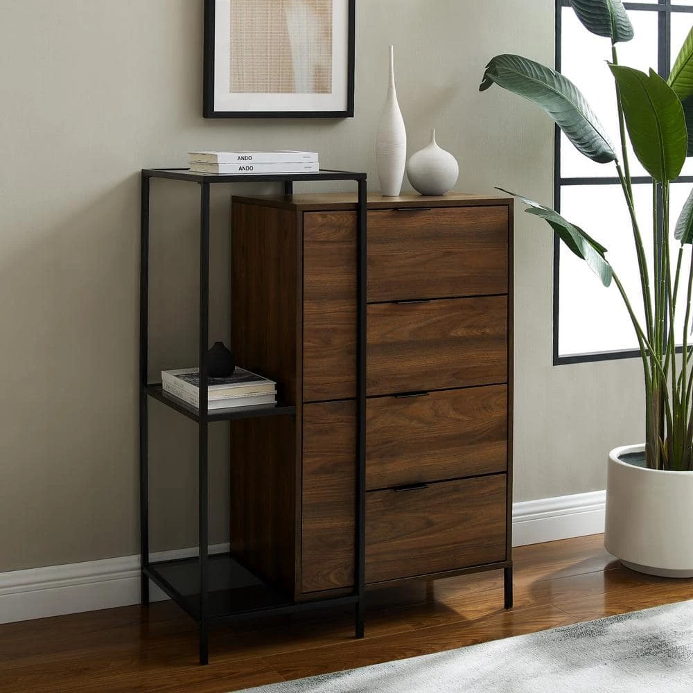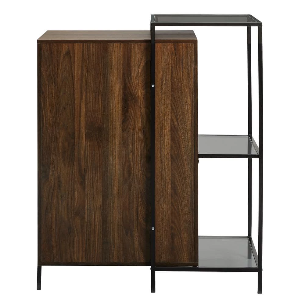 This modern two-in-one storage unit combines the open display space of a freestanding shelf with the closed convenience of a storage chest. The mixed material design features tempered safety glass shelves with a powder-coated steel frame and warp-resistant MDF wood, providing your living room with a sense of contemporary intrigue. Push-close cabinet doors and drawers give you easy access to the things inside, and a wall anchor ensures that the unit will stay upright no matter how full you stuff it. Whether you use it for extra clothes in your bedroom, books in the living room, or cocktail supplies in the dining room, this accent chest is sure to impress.