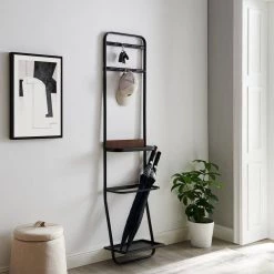 Dark Walnut Metal and Wood Hall Trees with Removable Umbrella Tray by Welwick Designs