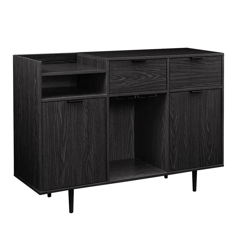 Slide your stemware out from under the hanging glass rack, pick a bottle of bubbly from the raised bottle storage shelves, and raise your spirits with the perfect pick-me-up. This console might just be your favorite thing to come home to with its customizable storage, reversible shelf inserts, and ample drawer space. Whether it’s a trendy bar cabinet, convenient storage in the dining room, or classy console for the TV, this piece is the perfect perch for wine bottles, dishware, and tech.