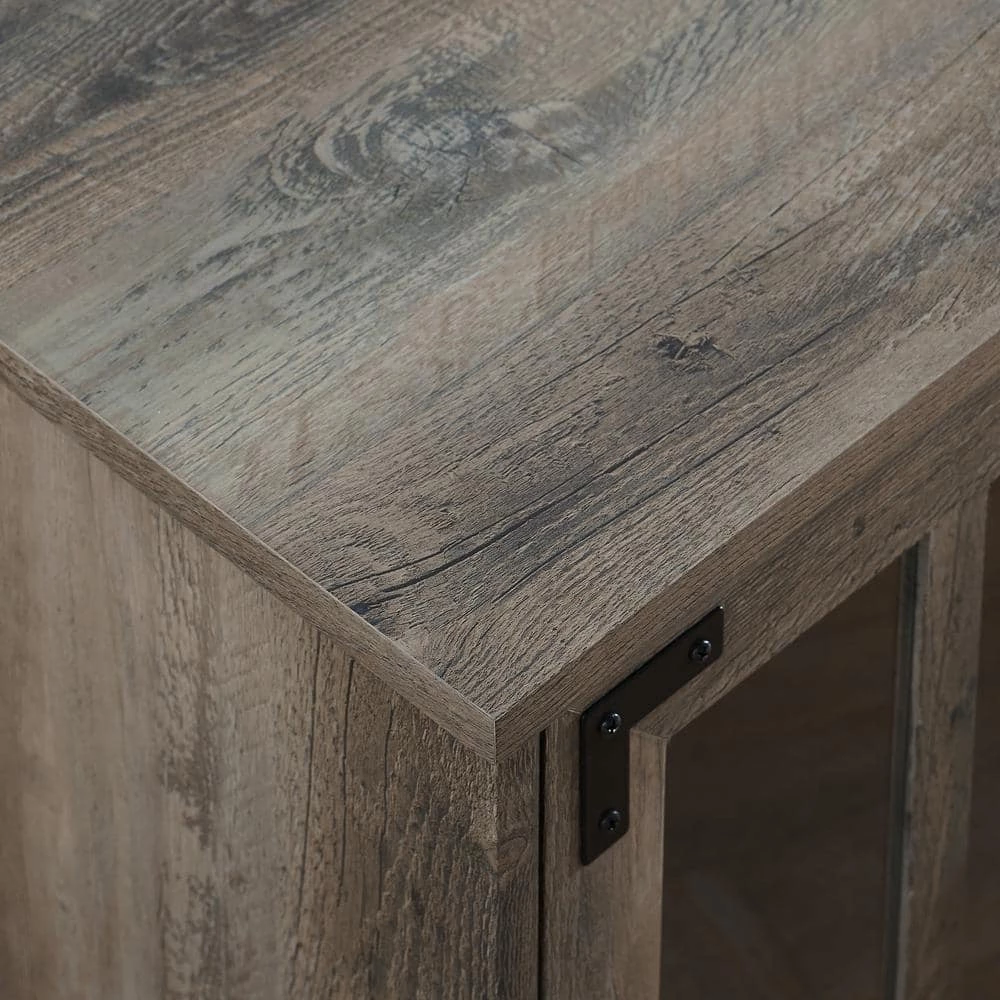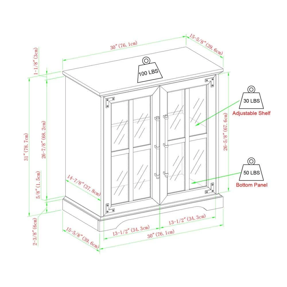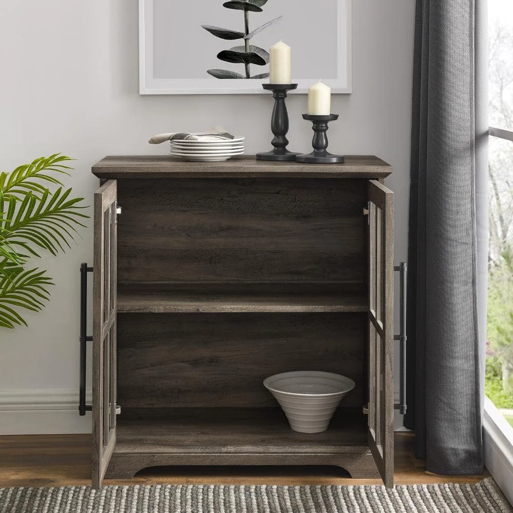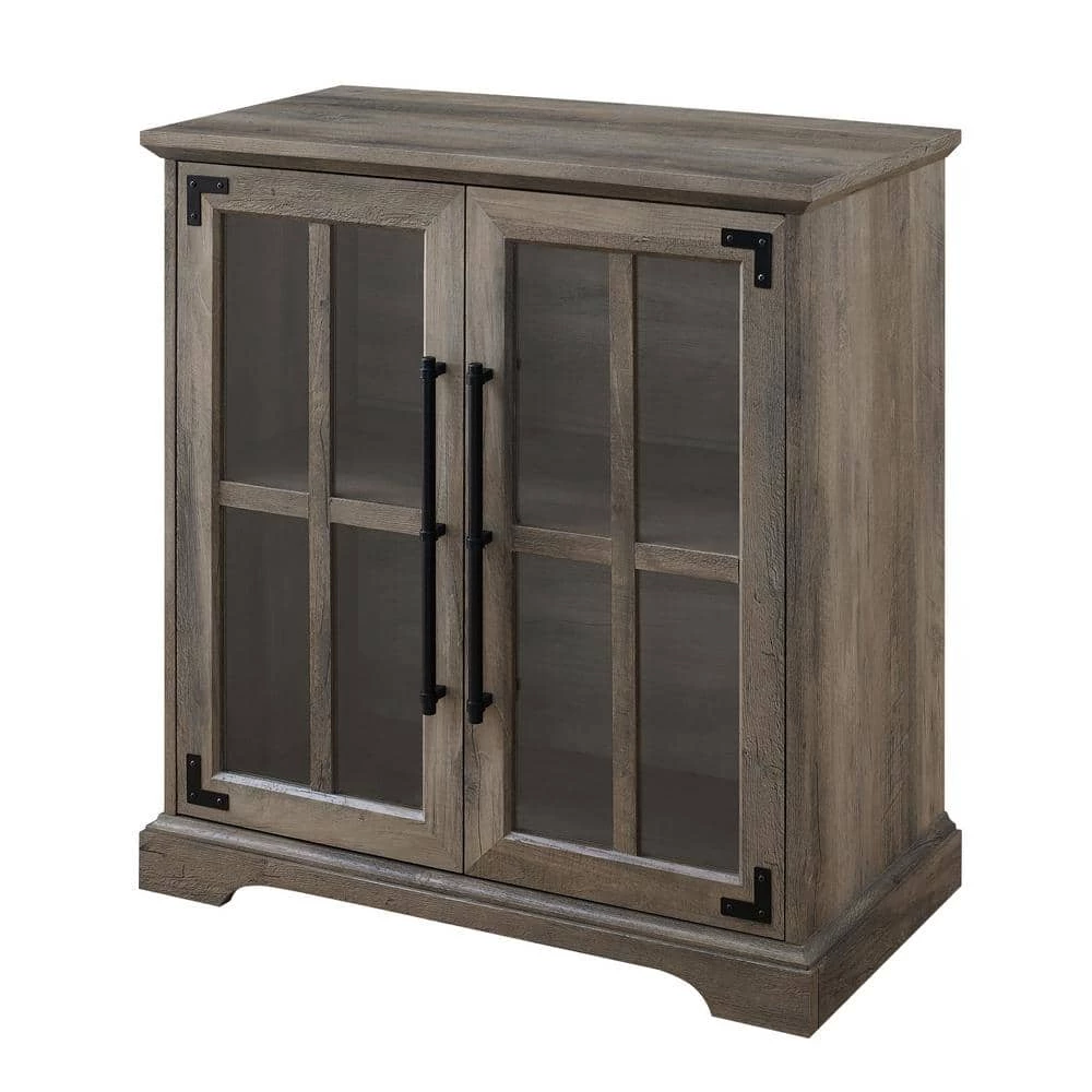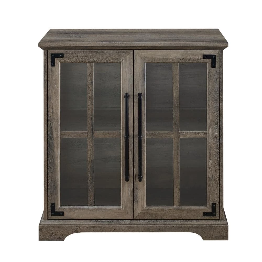 This modern farmhouse accent cabinet will look right at home, whether it’s cozied up in your living room, greeting guests at your entryway, or housing your fine china in the dining room. Its beveled top design and windowpane tempered safety glass doors imbue a rustic, farmhouse charm. The black metal accents and grand, powder-coated steel door handles lend a more modern, urban appeal. An adjustable shelf within the soft-close, glass doors offer refuge to display and easily access your dinnerware essentials, movie collection, or your most-recent read. A single cord management port allows you to transform this decorative piece into a versatile TV console for your next movie night or viewing party, so you can make entertaining even more classically comfortable.