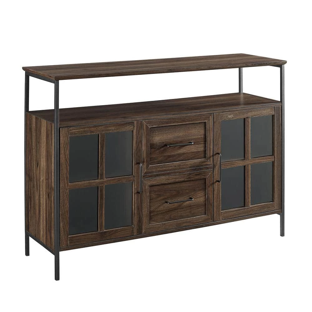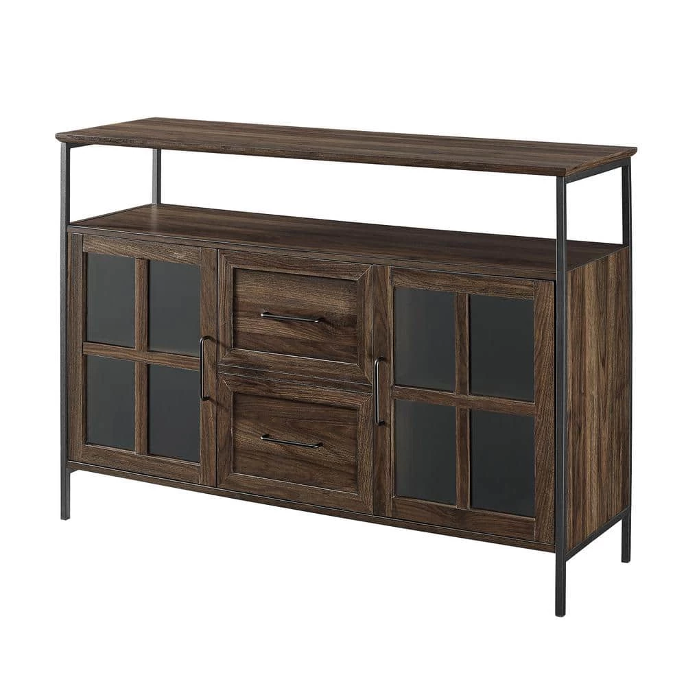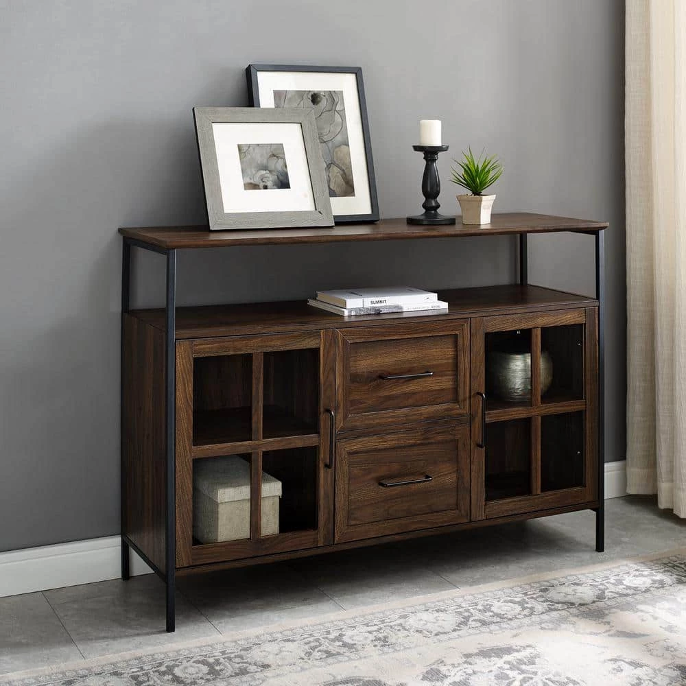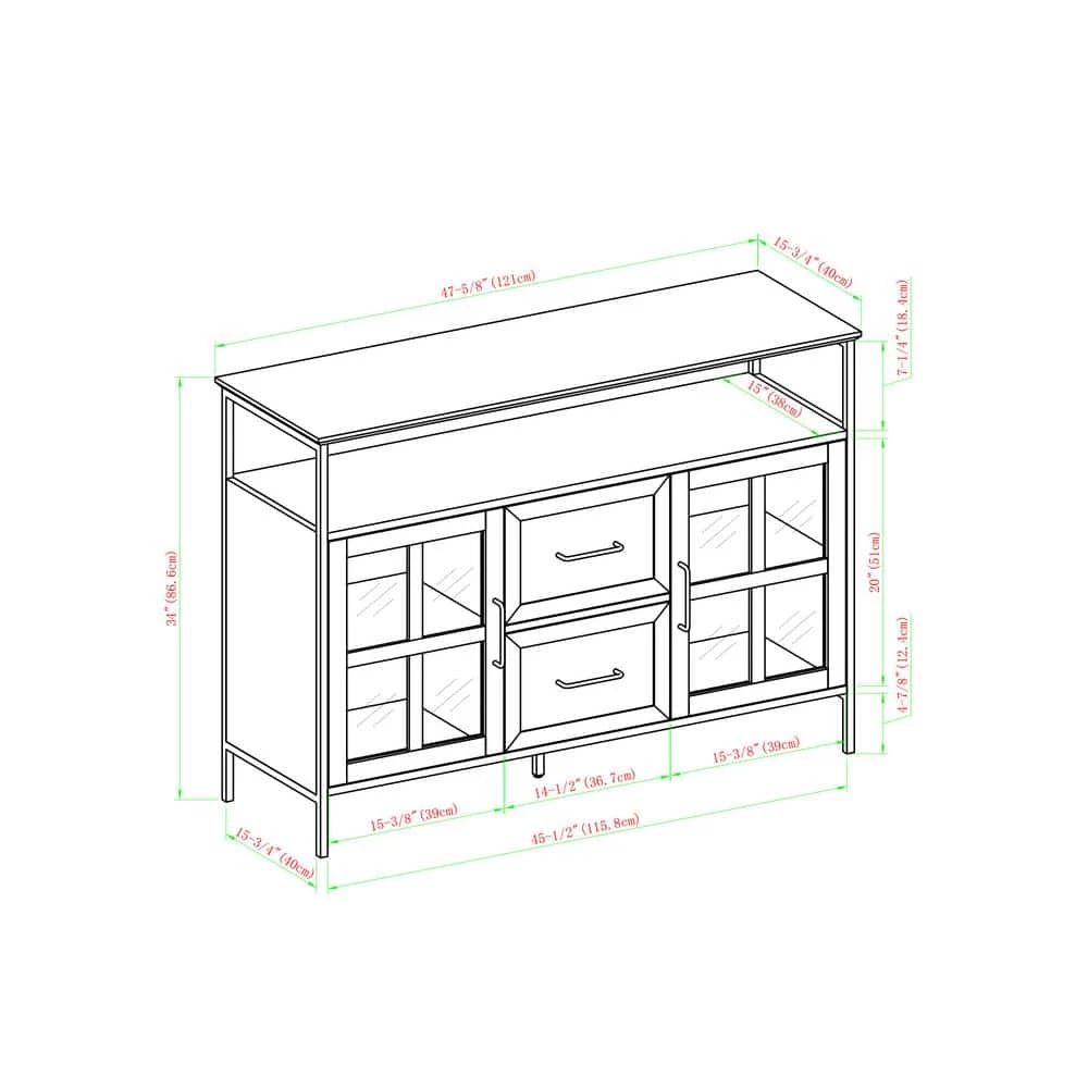Open up your design possibilities with this three-door metal and wood buffet. The subtle mix of materials in this sideboard create an industrial and gender-neutral look that can be used in a variety of rooms. There are three doors with soft close hinges on the bottom of the unit, two of which feature a classic fretwork design on tempered glass, while the door in the middle has a faux drawer faade. Behind the doors are adjustable shelves. The open section between the lower half of the unit and the top shelf also makes this piece functional as an entertainment center where it can accommodate TVs up to 52 in.