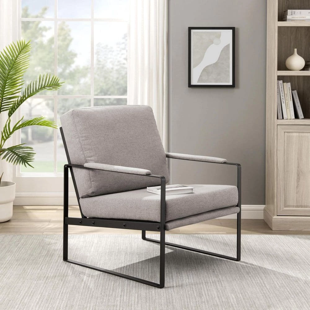 Rest and relaxation come easy with this modern armchair. A sleek metal frame makes it the perfect accent piece for your living room or personal space, while the lush, woven fabric-upholstered backrest and seat allow you to effortlessly activate your cozy mode. The fabric-lined detail on the metal arms adds even more comfort. Whether you pair two together as a side-by-side duo or as a solo statement piece, this armchair has literally got your back.