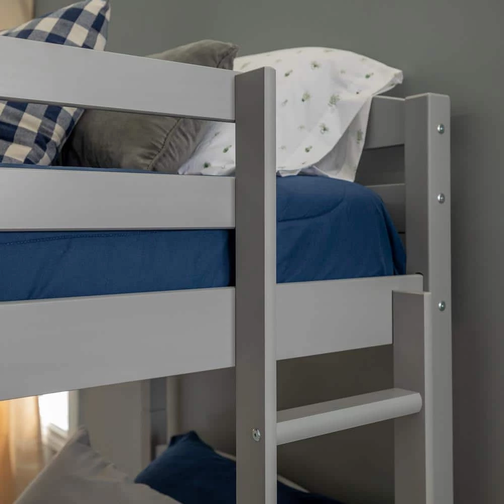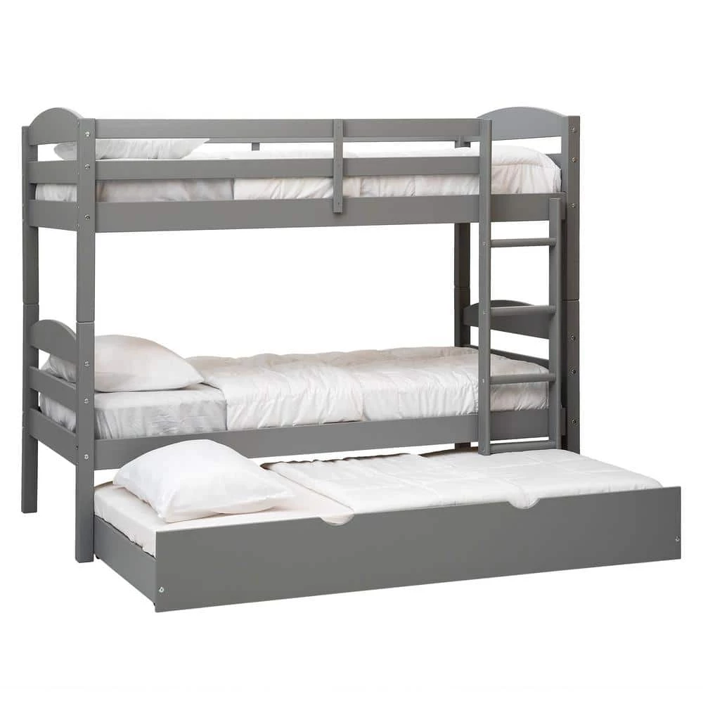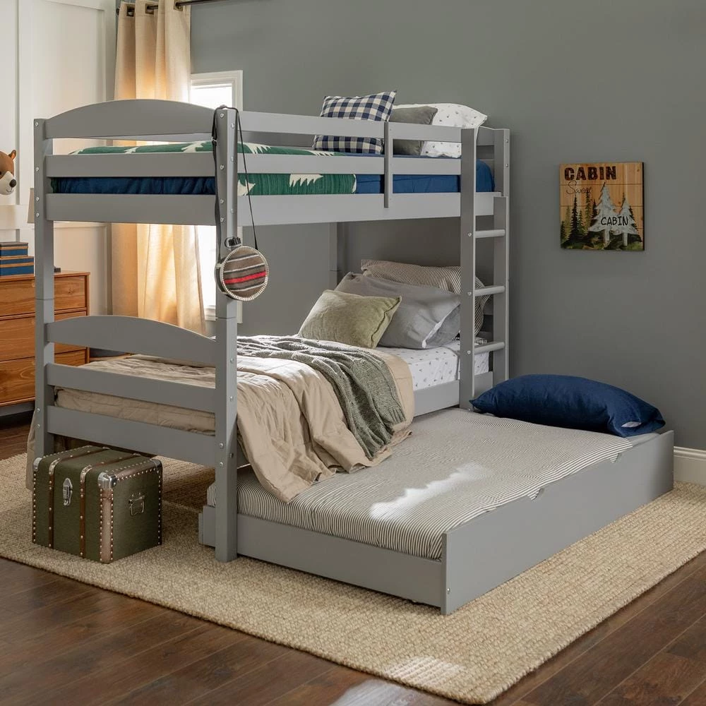 Make the most of your space with this twin over twin bunk bed and trundle bed set. Made out of solid pine wood, the top bunk has wrap-around safety guardrails and can be accessed from a sturdy ladder. The trundle can be used as an extra bed or a large storage drawer. Safe and suitable for more than just children, this bunkbed and trundle set is a great addition to vacation homes, family cabins, or cozy guest rooms. Each bed holds up to 250 lbs. The bunk bed can be set up separately as two twin beds.