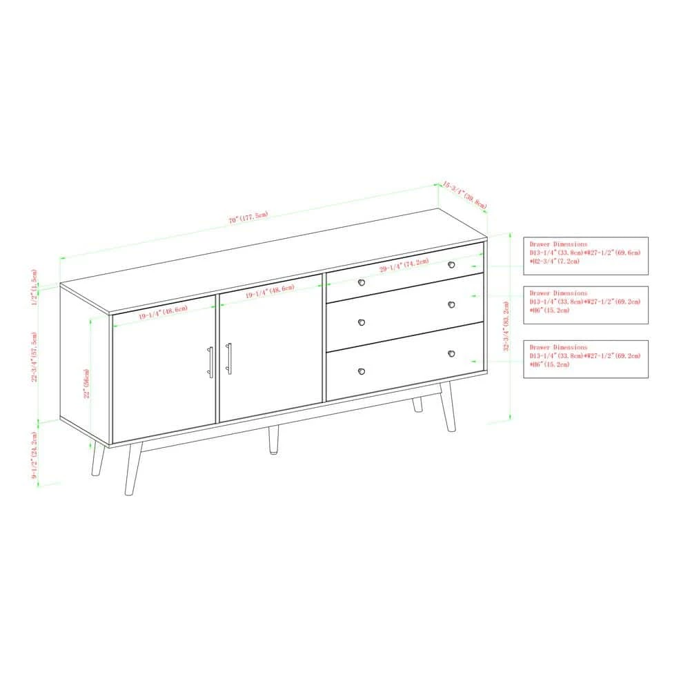 Need extra kitchen space. Running out of room for office storage. We’ve all been there. Why not take home a versatile, 70 in. modern three-drawer sideboard to do the trick. Stage this stunning wood veneer unit as a kitchen buffet, office credenza or living room sideboard. Its modern silhouette lets it fit any trending style of your choosing. 2-adjustable shelves are available for you to organize however you like. 3-drawers run on telescoping metal glides for smooth movement and tapered legs give it such an oh-so boho-chic silhouette. Place it in your dining room, living room, bedroom or anywhere you need closed storage capabilities. Your home will be cleaner and more stylish in no time.