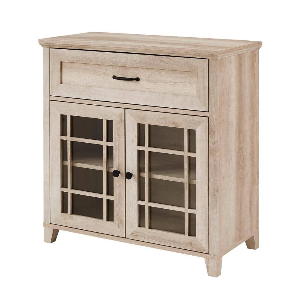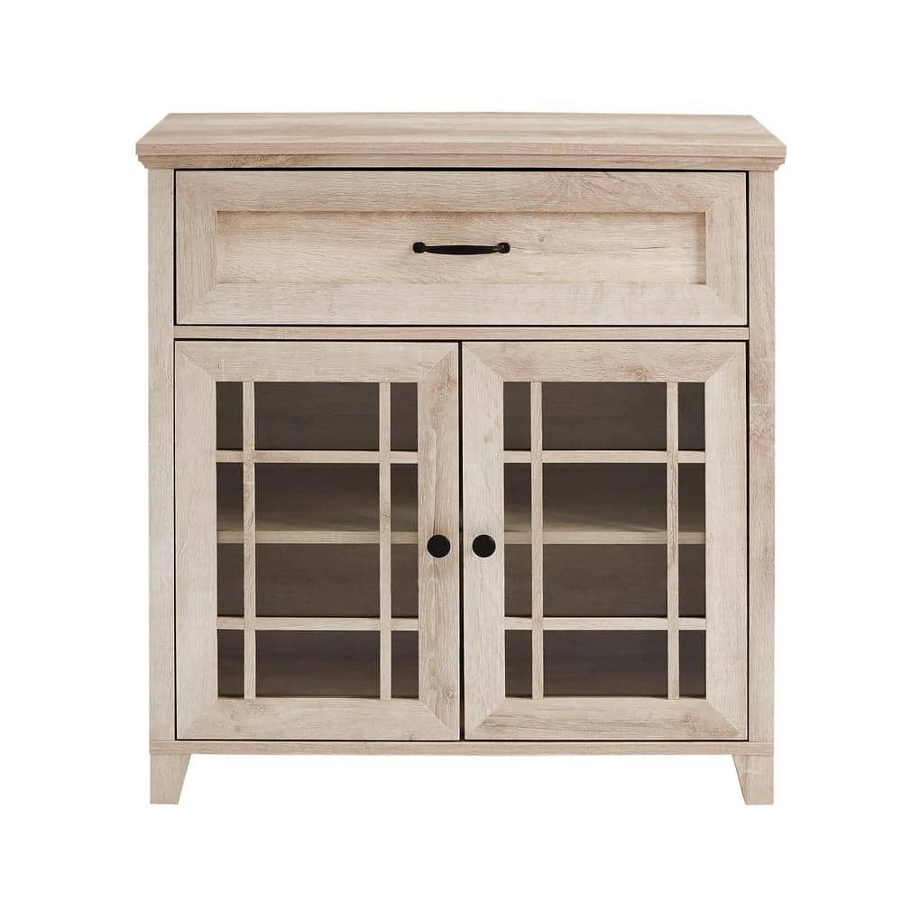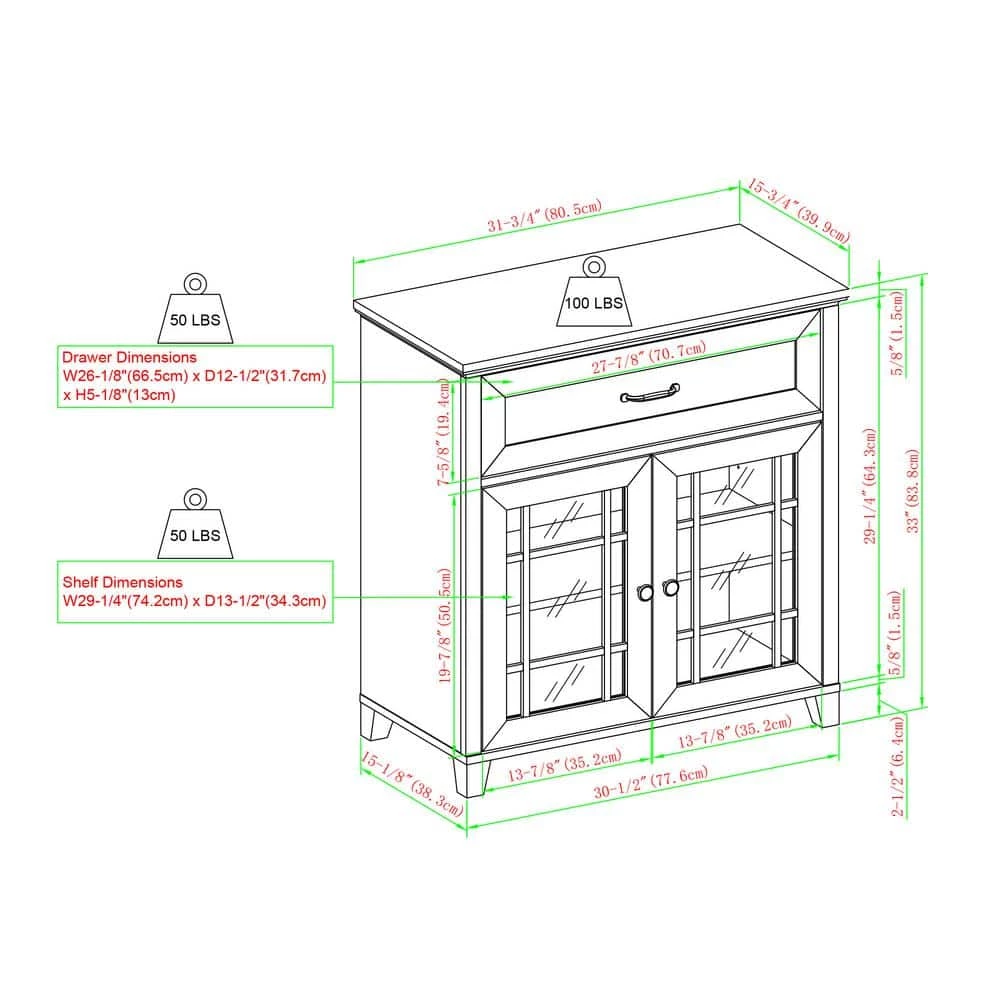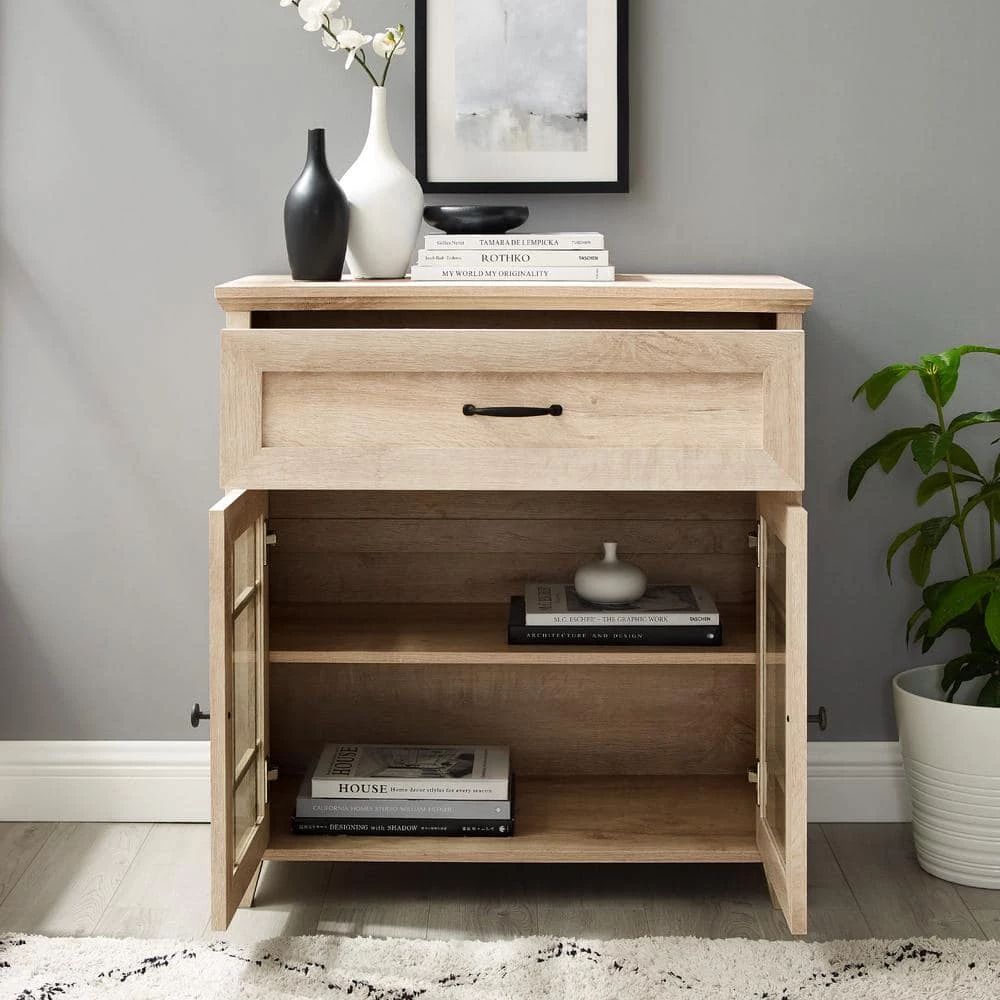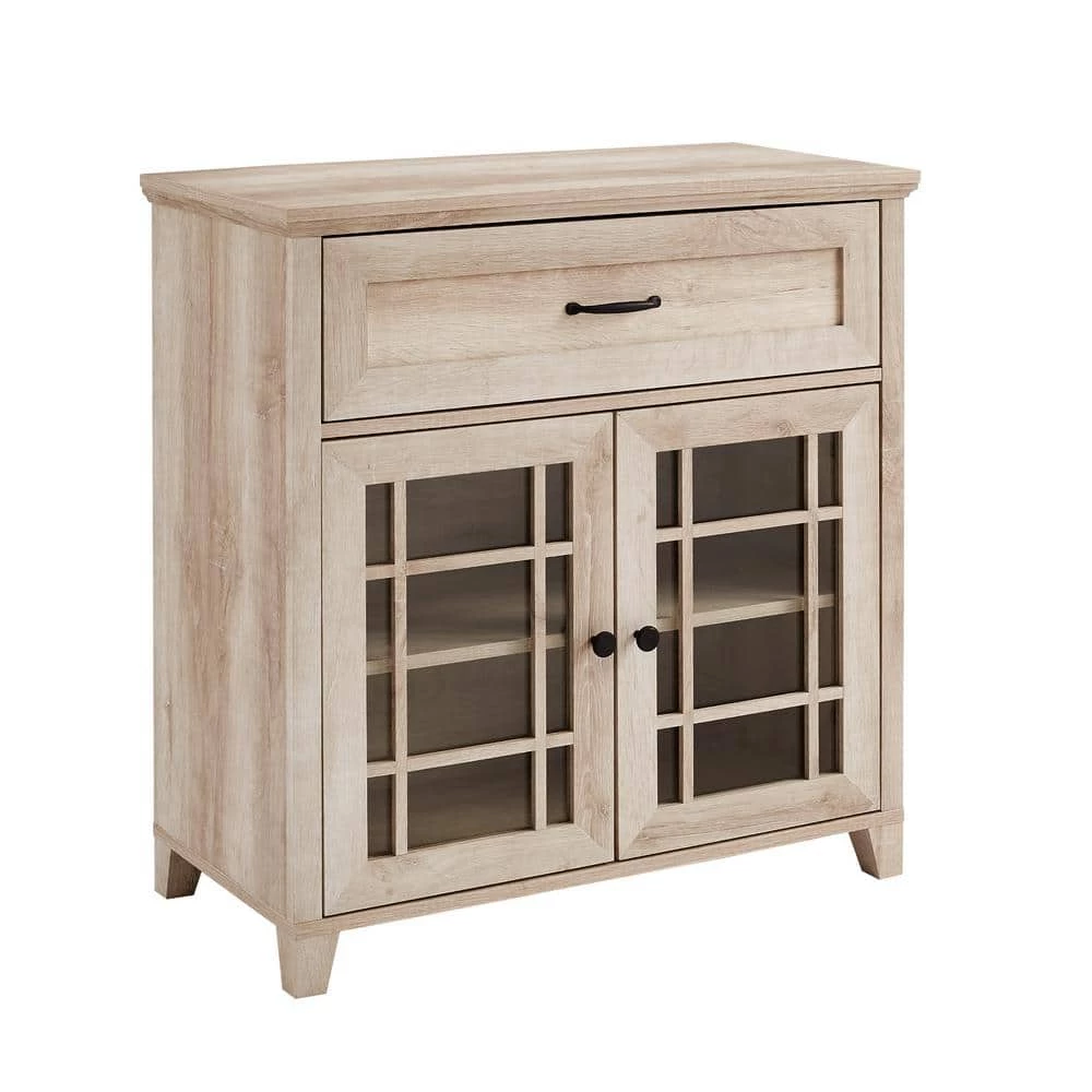 You’ll be sitting pretty with this accent cabinet on debut in your living room or reading nook. A classic build with unique detailing on its two tempered safety glass doors offer the perfect blend of a timeless yet trendy aesthetic. Transparent double doors tastefully display an adjustable shelf that’s ready to house your growing collection of novels or structural decor where they can be admired and easily accessible. A single drawer on smooth, telescoping metal glides offers more concealed storage for entryway essentials or spare linens. Offering both small-space charm and versatility, this console is at your service as an impromptu bar cart for wine night, an entry table to welcome you home, or a dining room buffet to host the most special occasions.